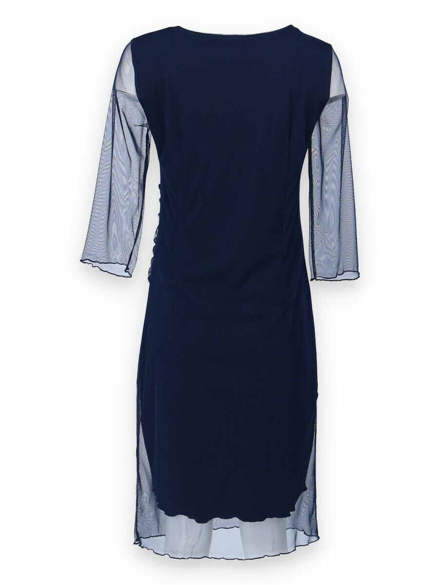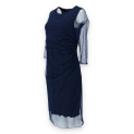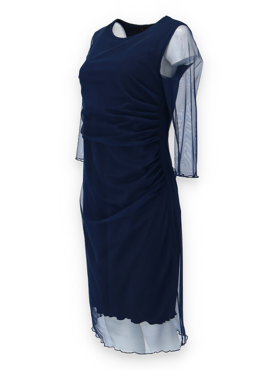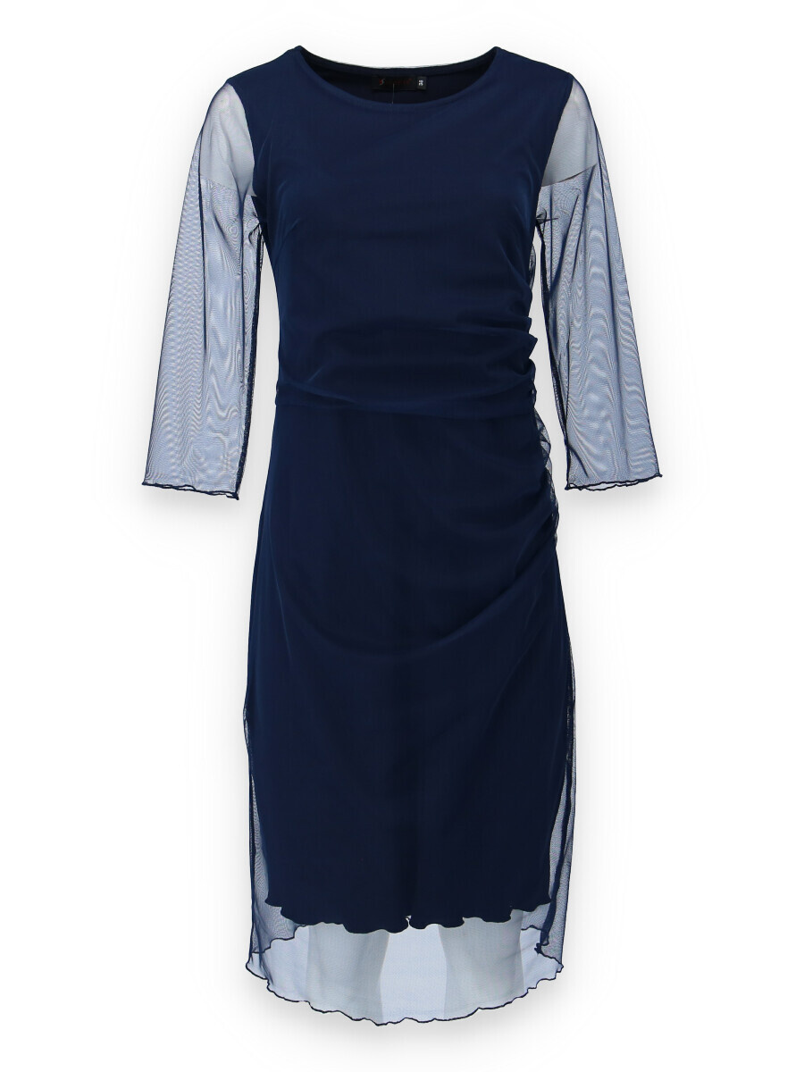 Elegantní společenské šaty s 3/4 rukávem ve tmavě modré barvě s délkou ke kolenům vhodné i na denní nošení, řasená sukně