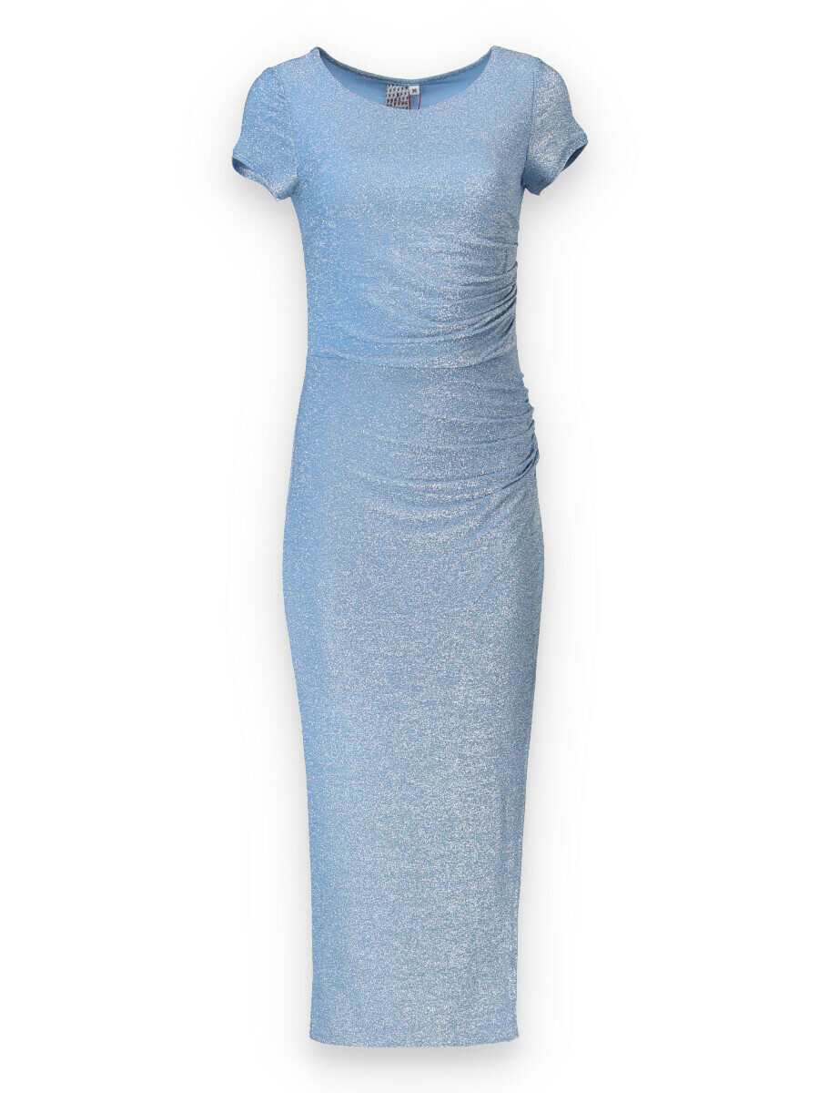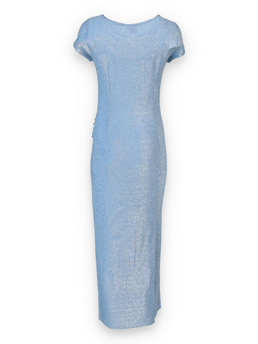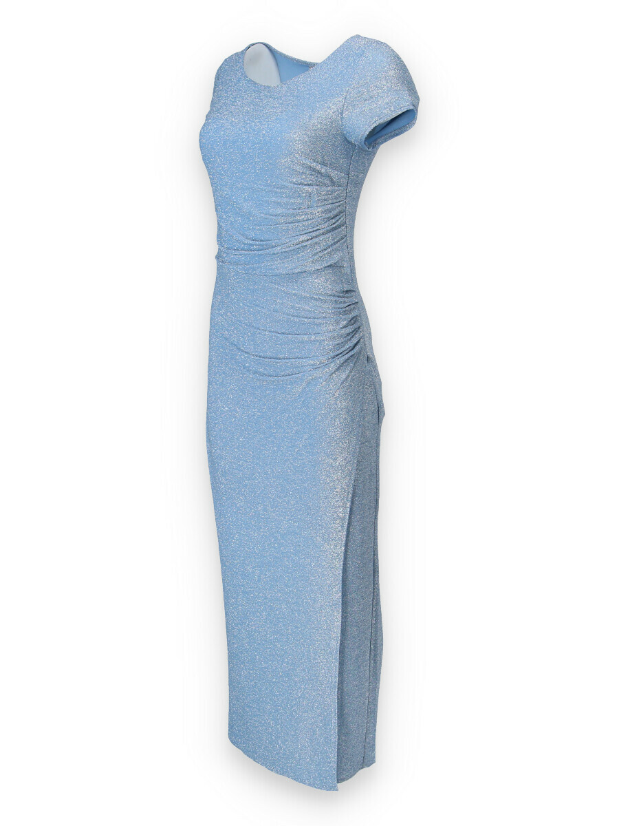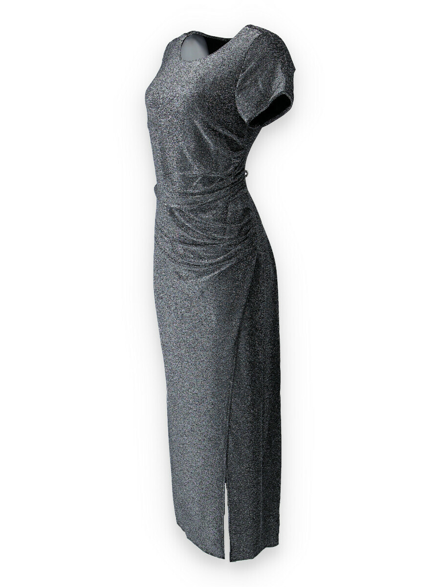 Design těchto šatů je moderní a elegantní, s důrazem na detaily. Šaty mají krásně tvarovaný výstřih a sofistikovaně řasenou sukně, která dodává celkovému vzhledu šatů na lehkosti a eleganci.