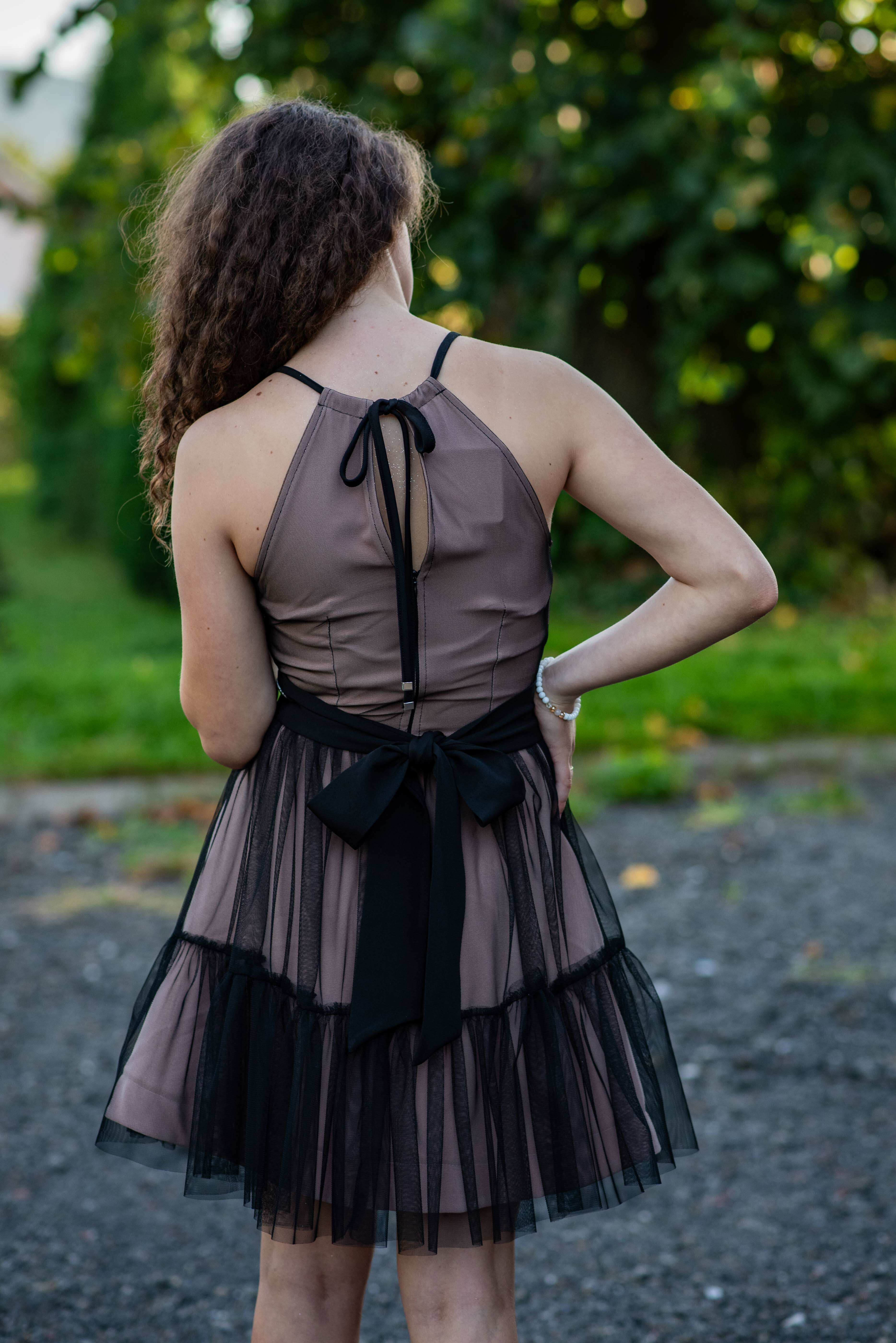 Společenské kratší šaty s vazačkou v pase, zapínání na zip, šifonová sukně