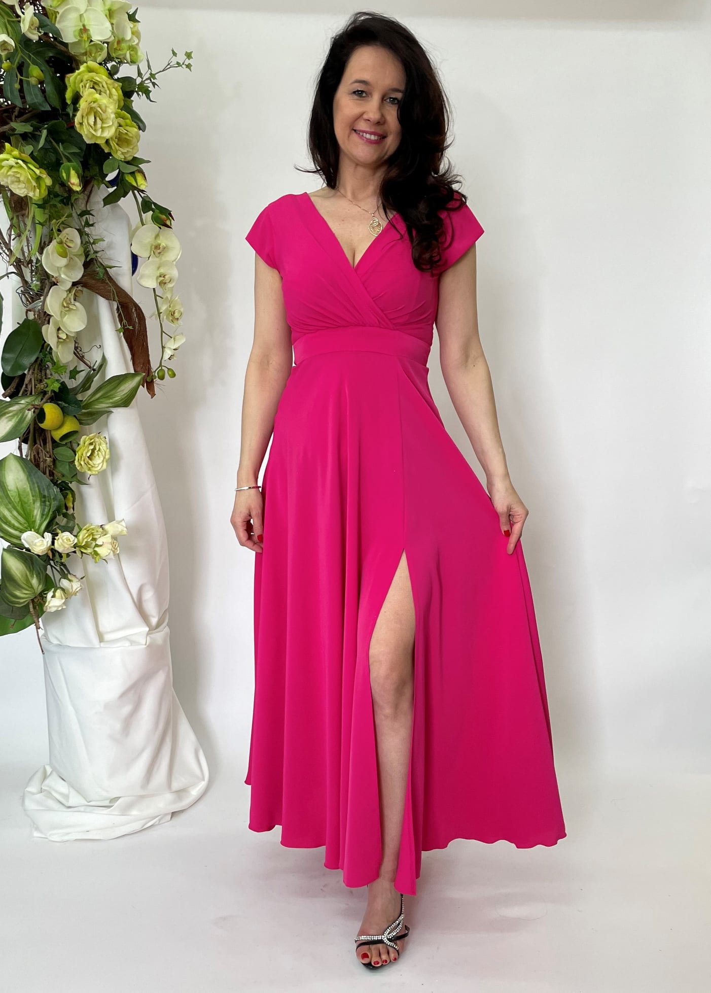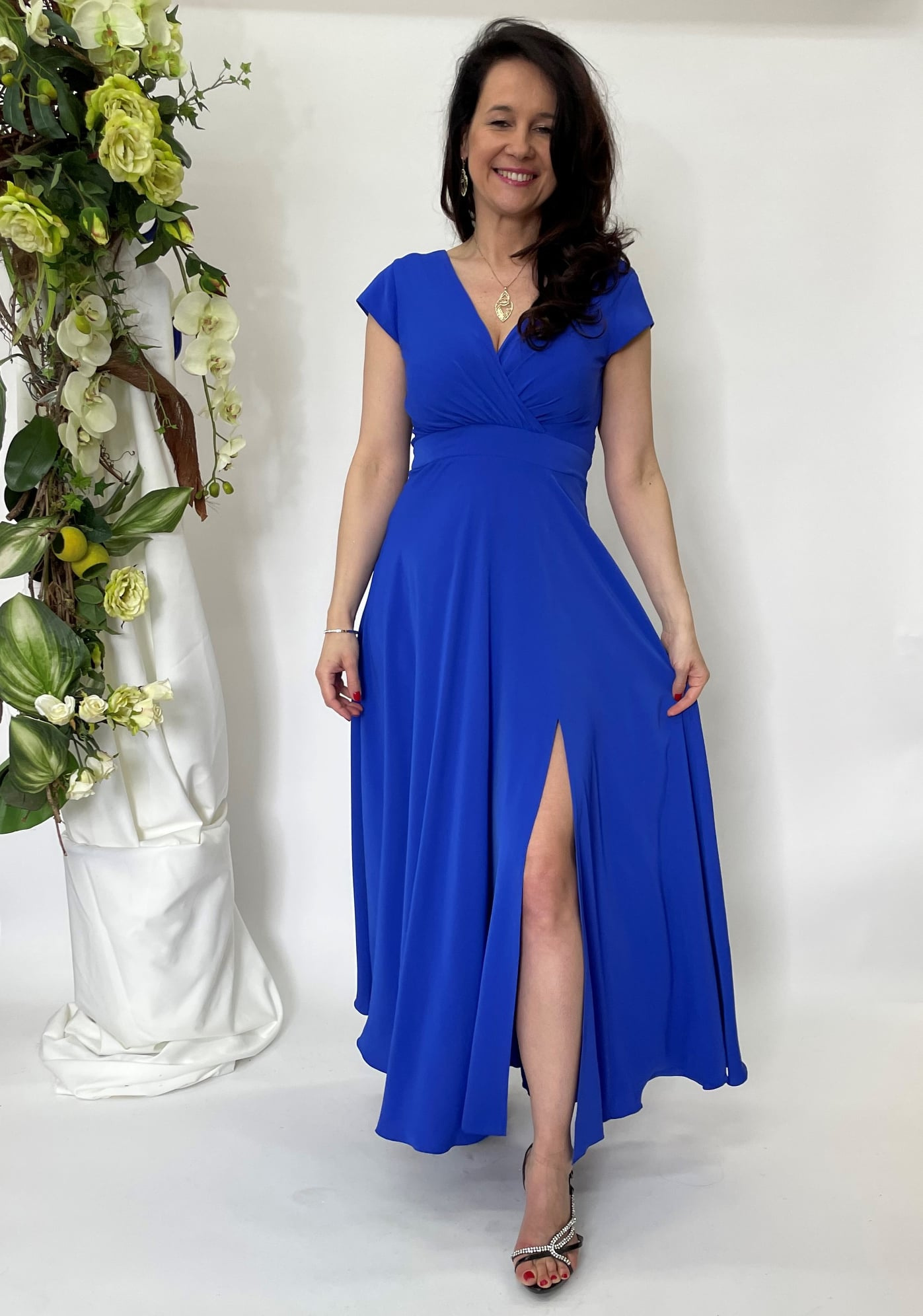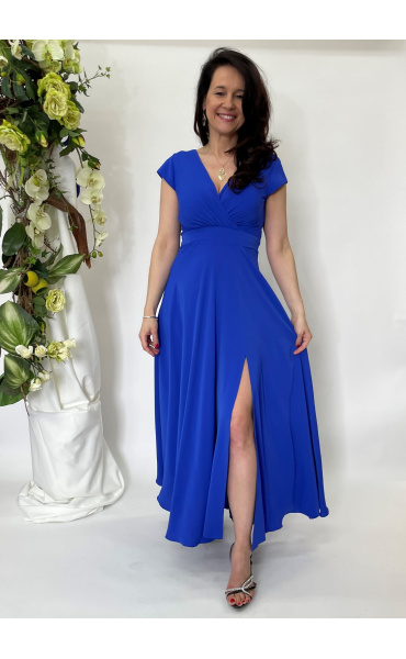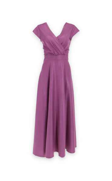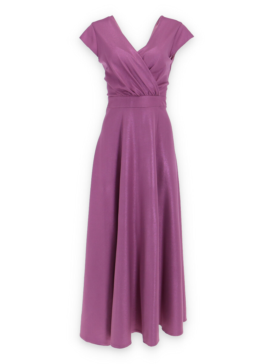 Elegantní společenské šaty s motýlkovým rukávem, zadní skrytý zip, jemný metalický lesk v materiálu.