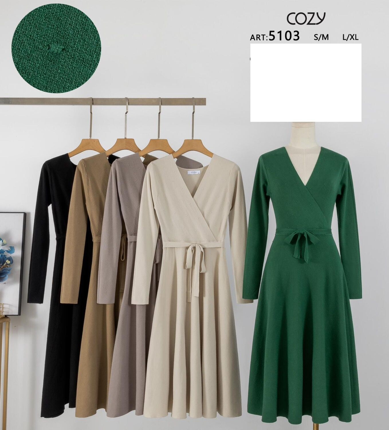 Žebrované dlouhé šaty s překladem na prsou, všitý pásek. Dovoz Itálie.