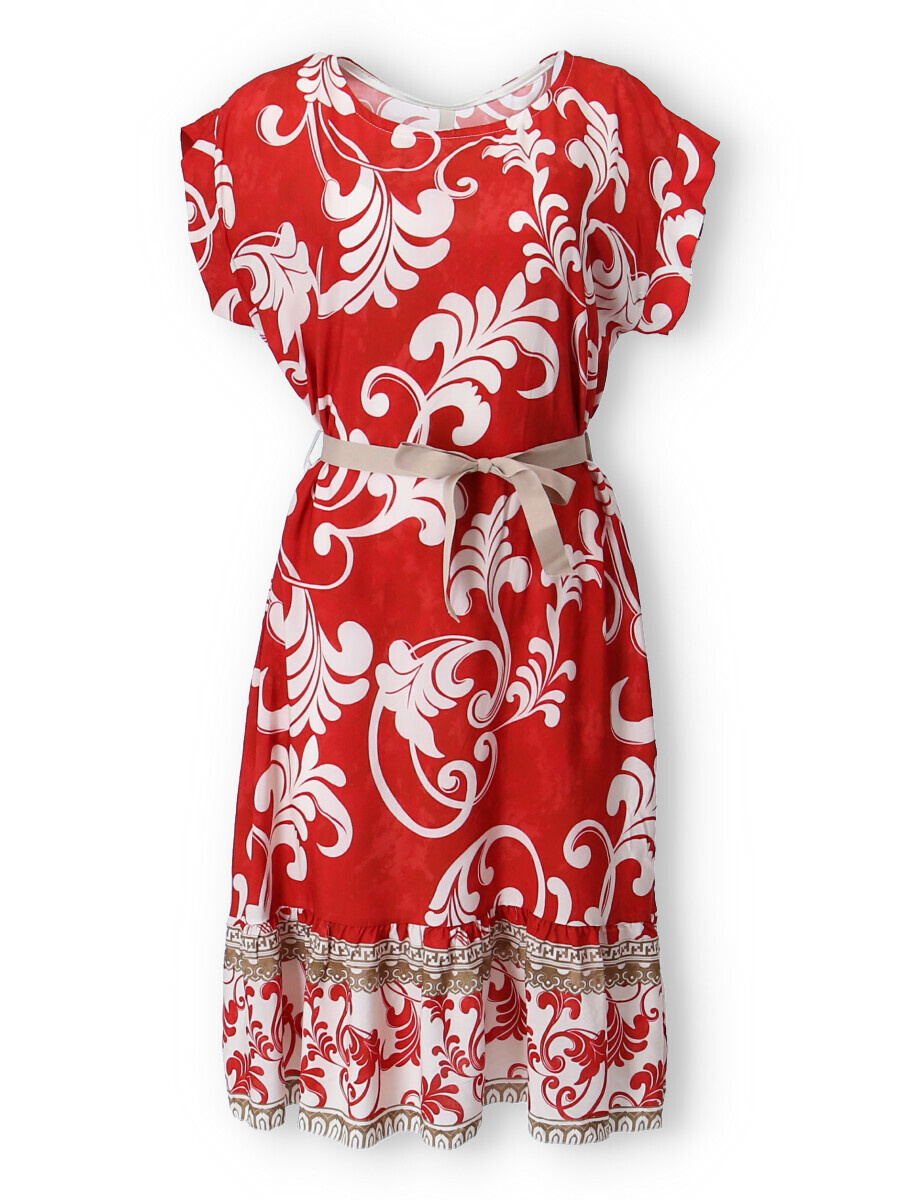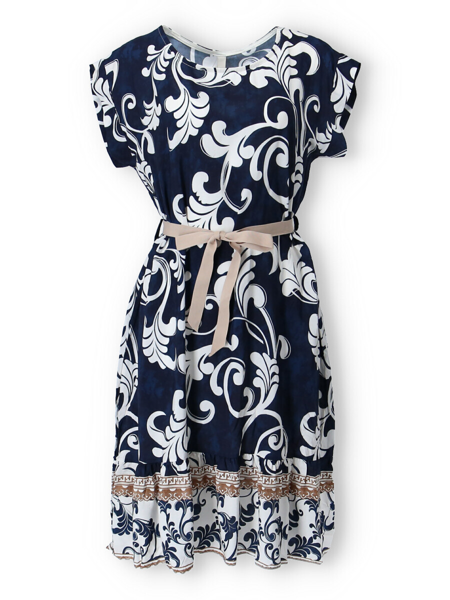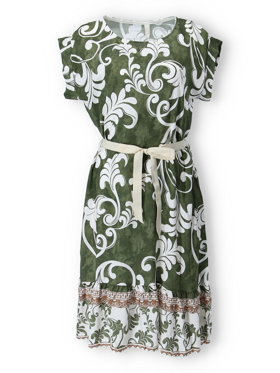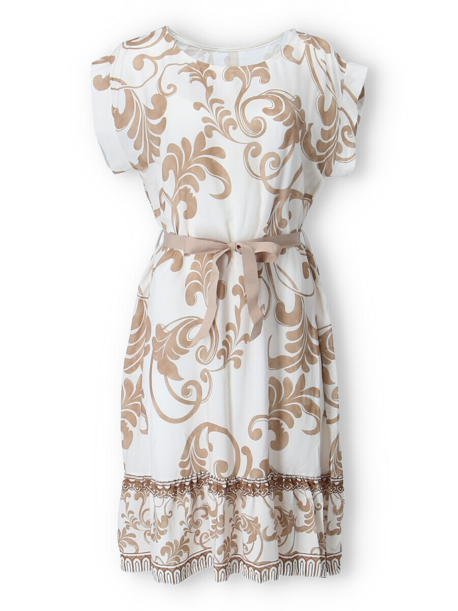 Dámské šaty se vzorem. Šaty mají kulatý výstřih, ve spodní části volán a v pase doplněny stuhou. Vyrobeno v Itálii.