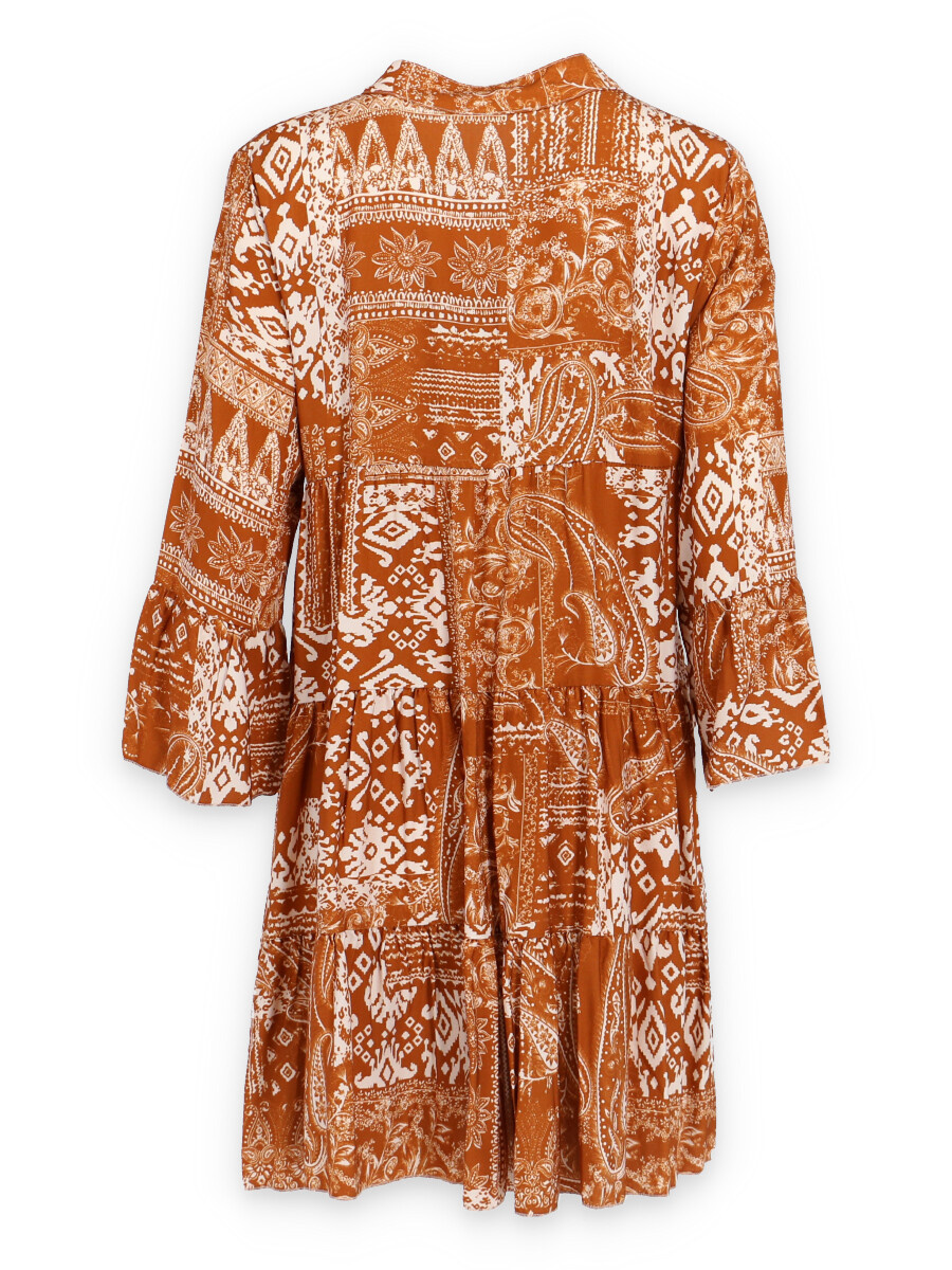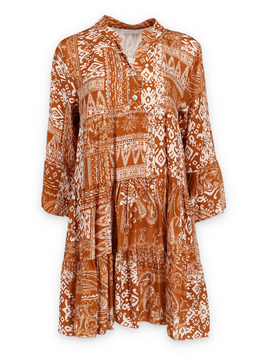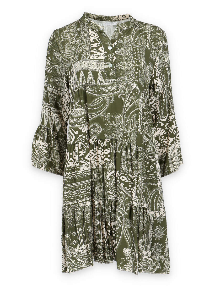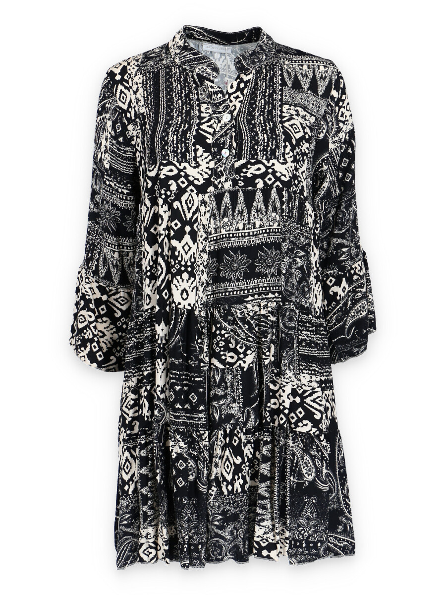 Módní vzorované krátké dámské šaty s 3/4 rukávem, volánový rukáv. Vyrobeno v Itálii