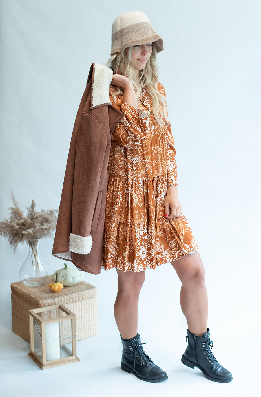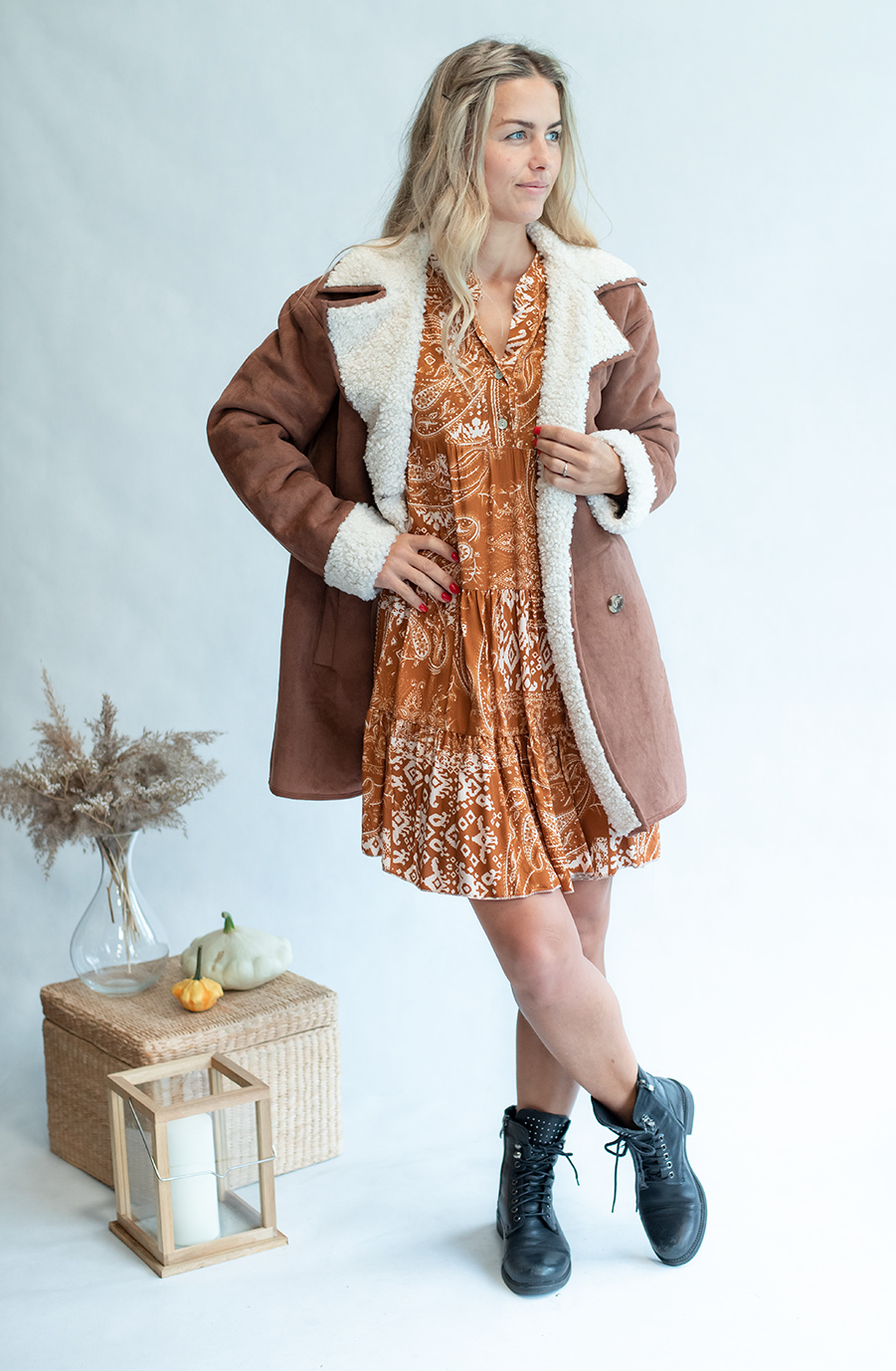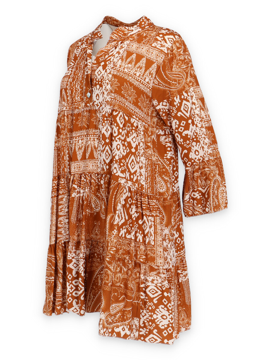 Módní vzorované krátké dámské šaty s 3/4 rukávem, volánový rukáv. Vyrobeno v Itálii