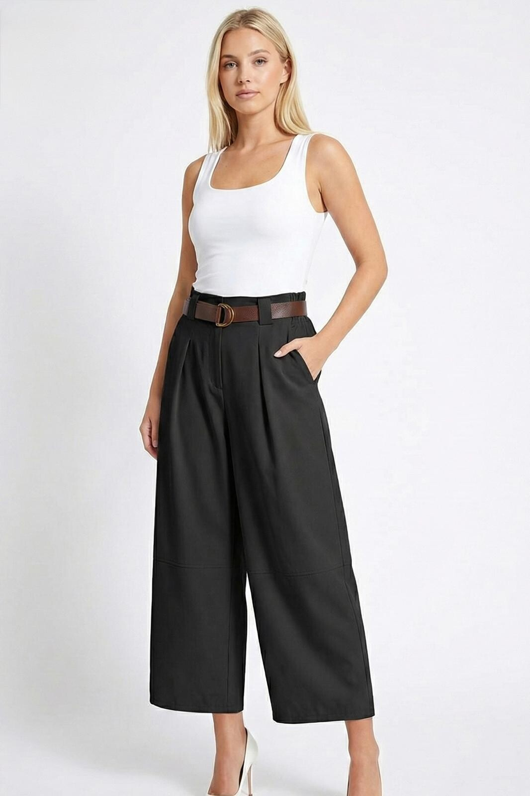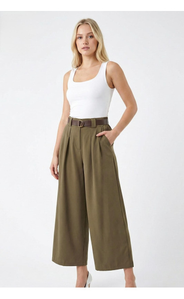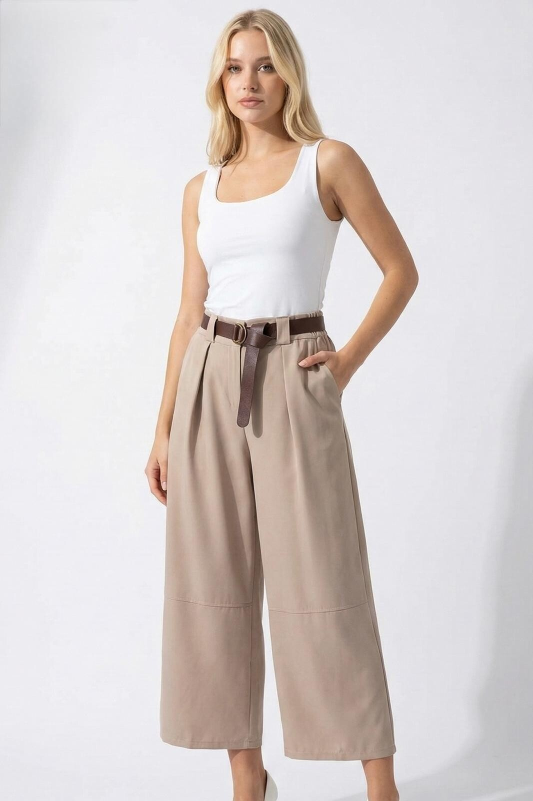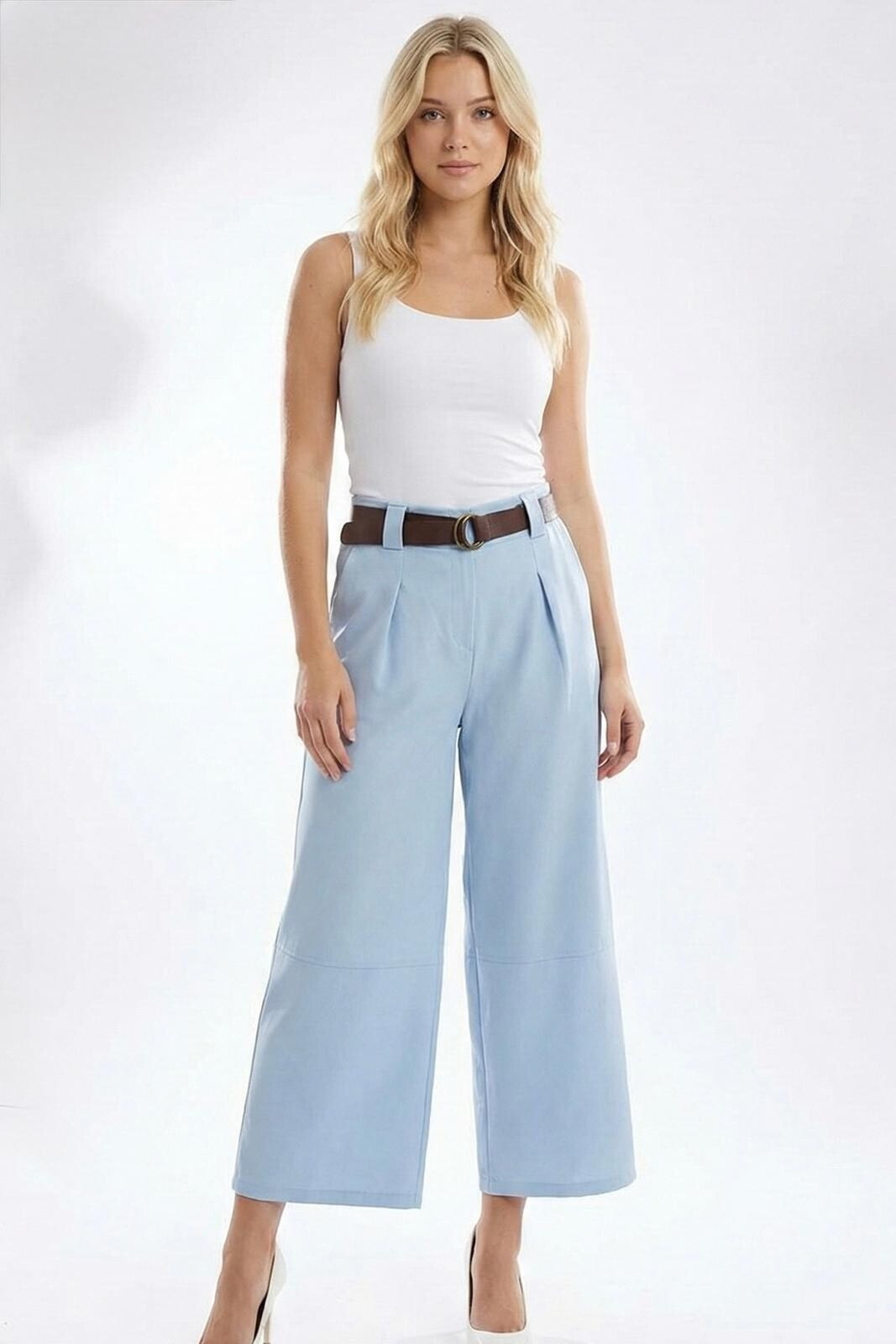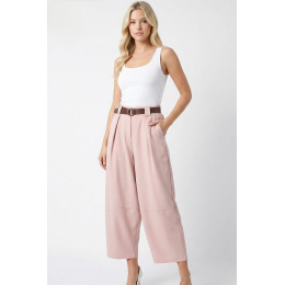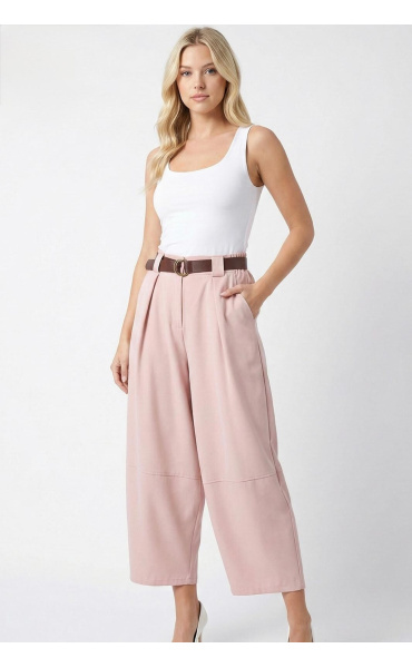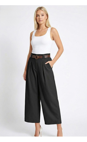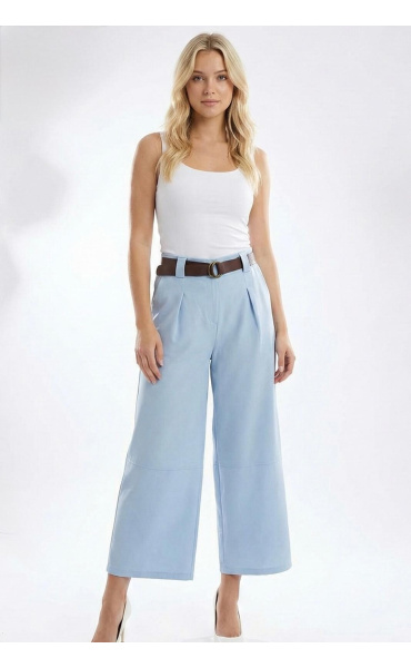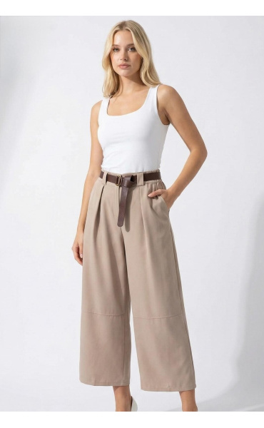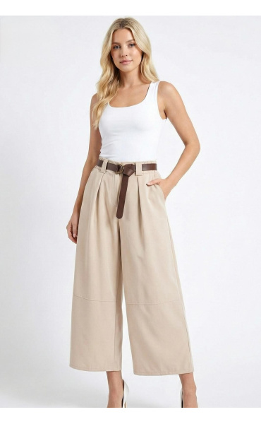 Dámské elegantní kalhoty v 7/8 délce s širokými nohavicemi. Kalhoty mají zadní část v pase do gumy a zapínání na knoflík. Jsou doplněny páskem a mají všité kapsy po stranách.
