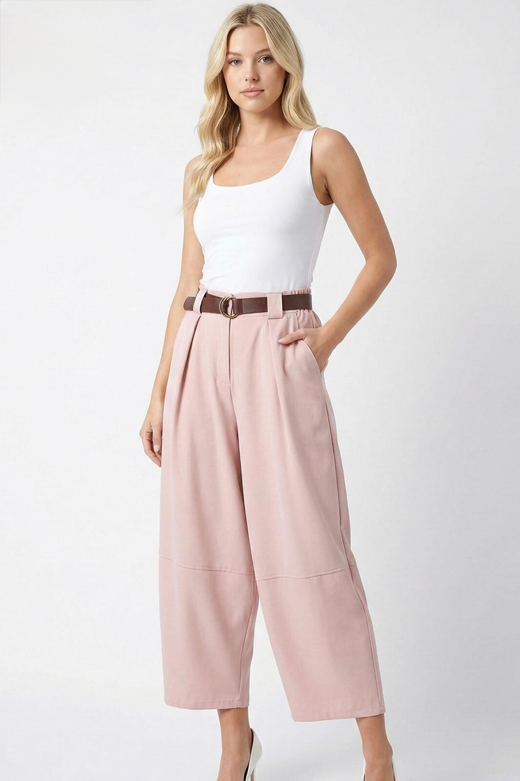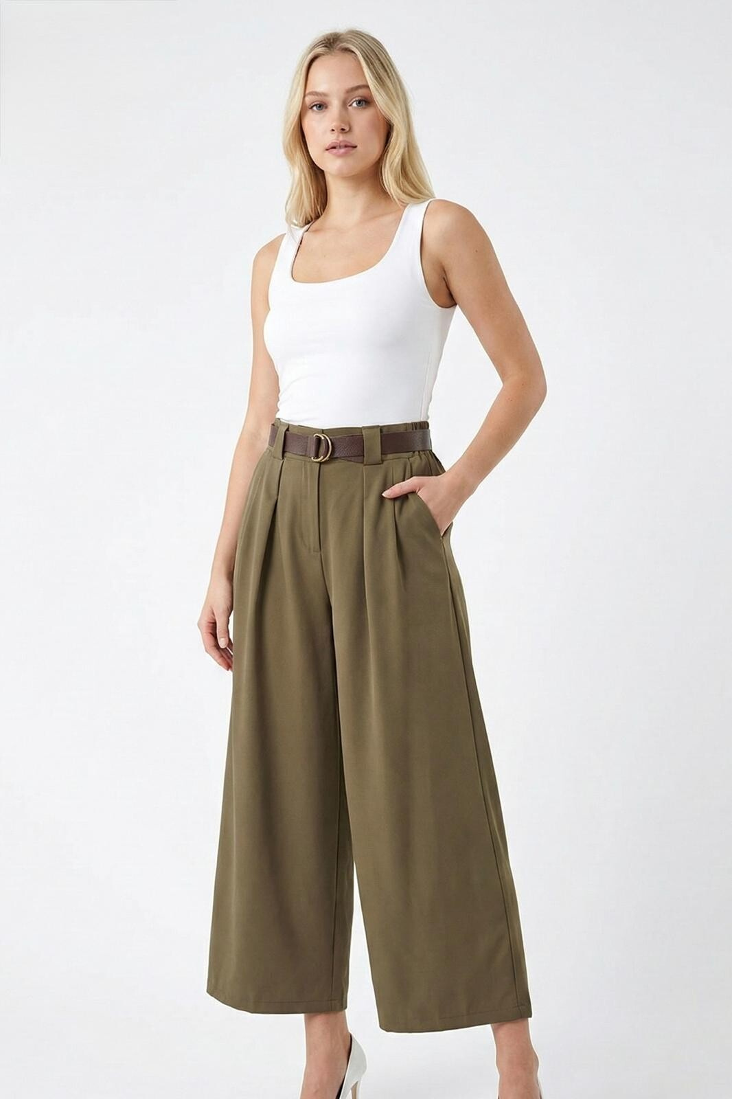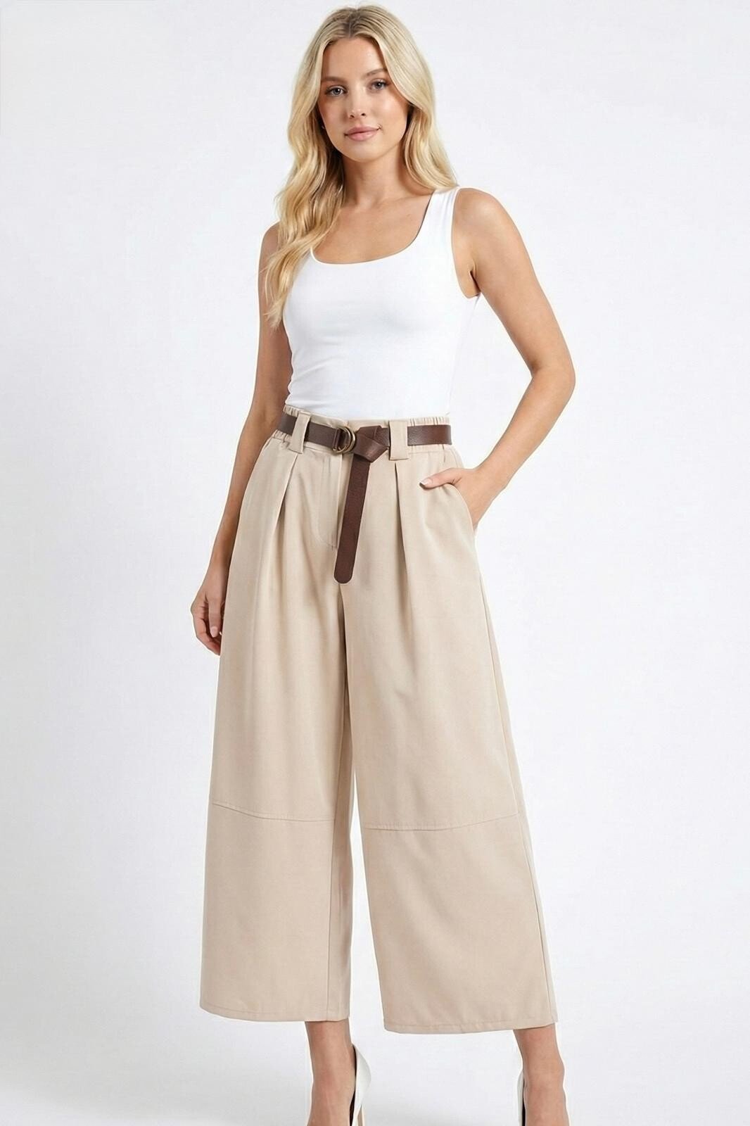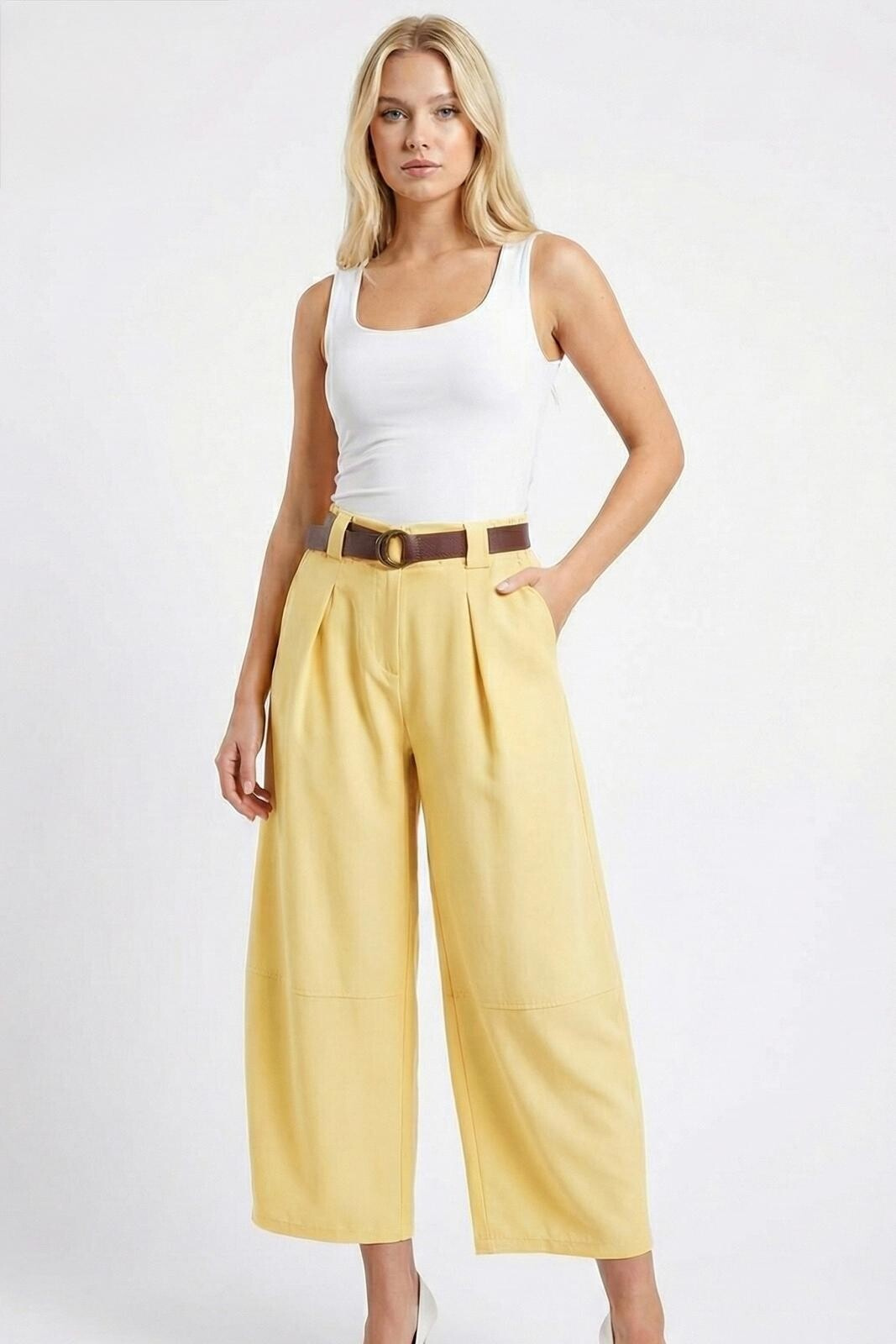 Dámské elegantní kalhoty v 7/8 délce s širokými nohavicemi. Kalhoty mají zadní část v pase do gumy a zapínání na knoflík. Jsou doplněny páskem a mají všité kapsy po stranách.