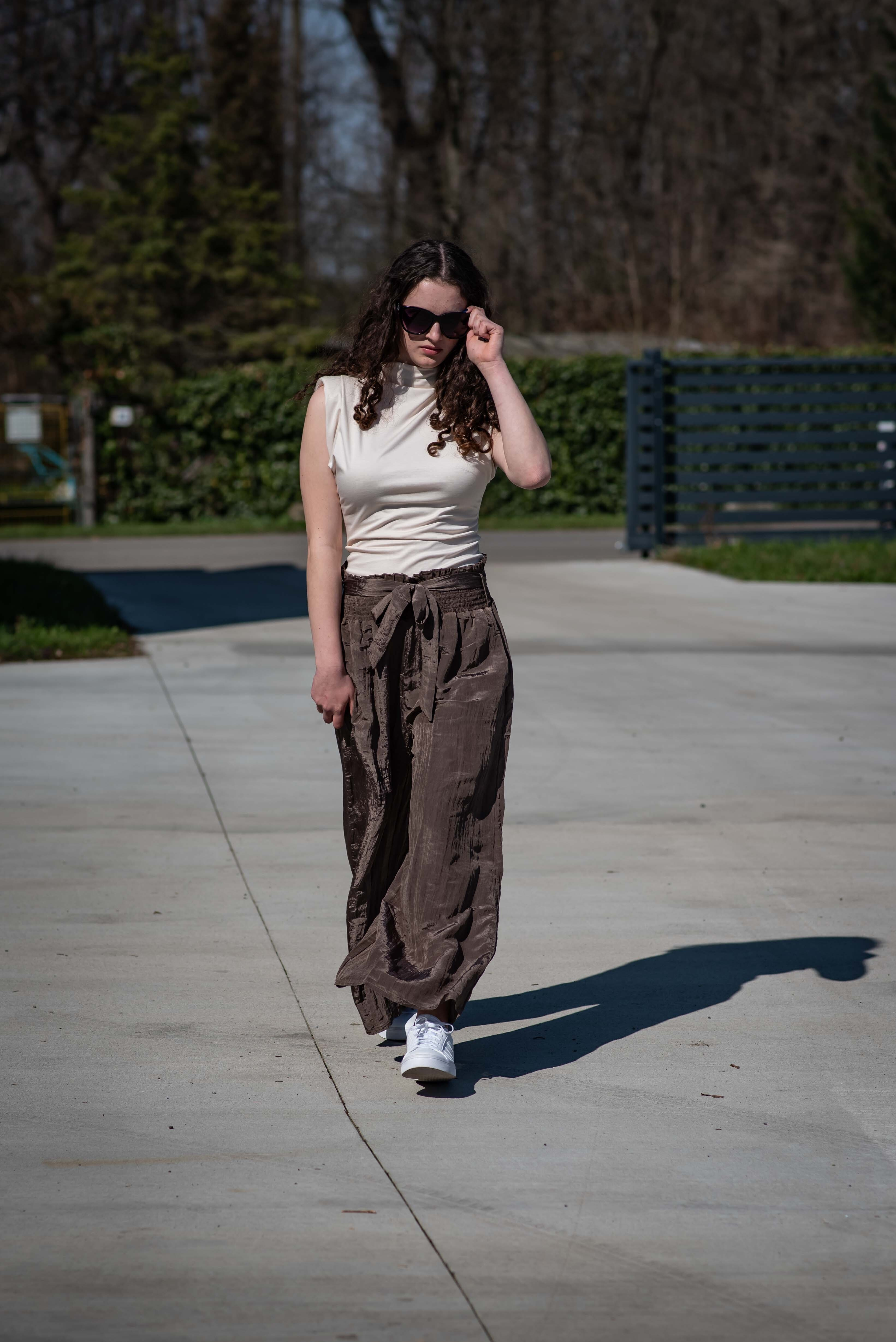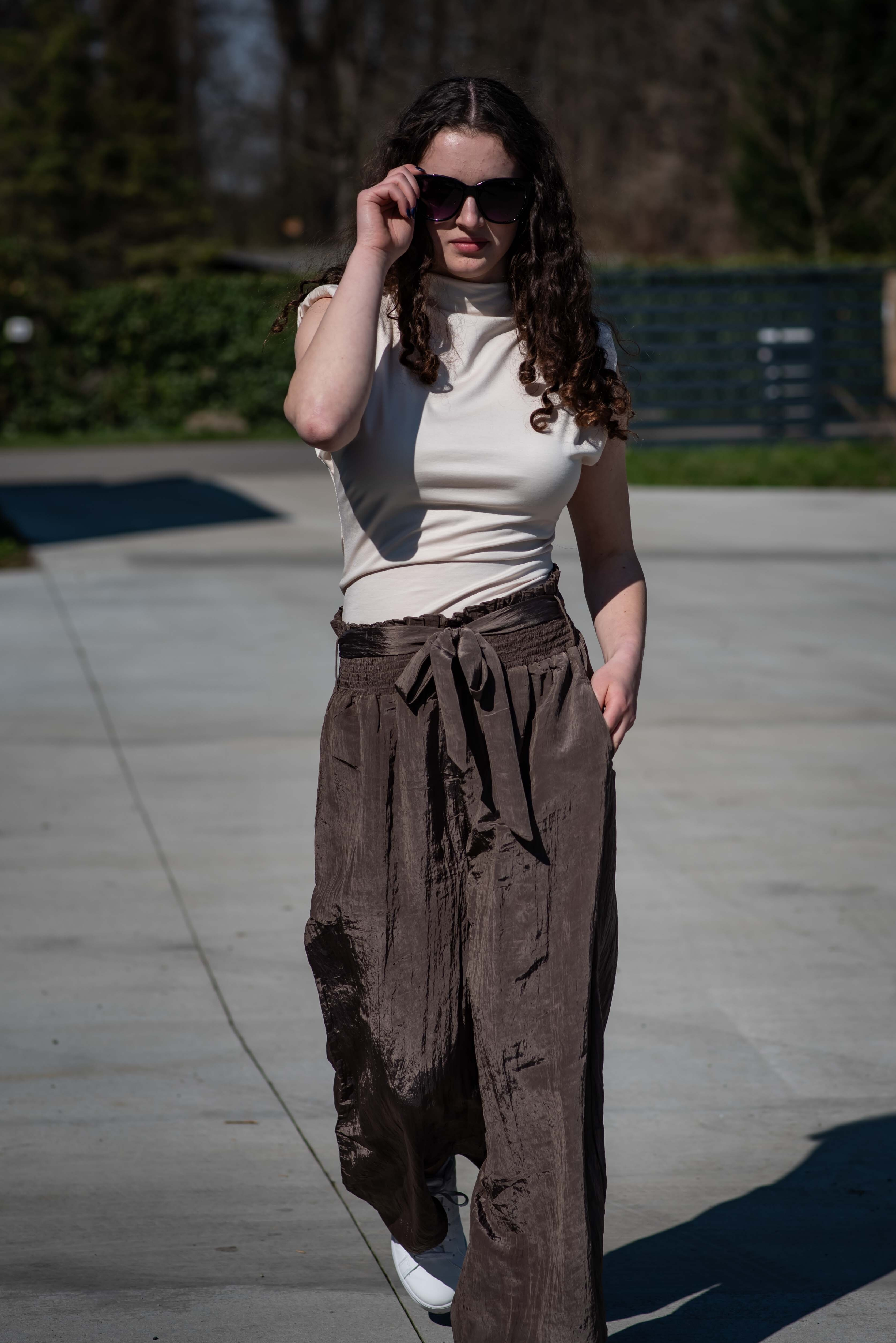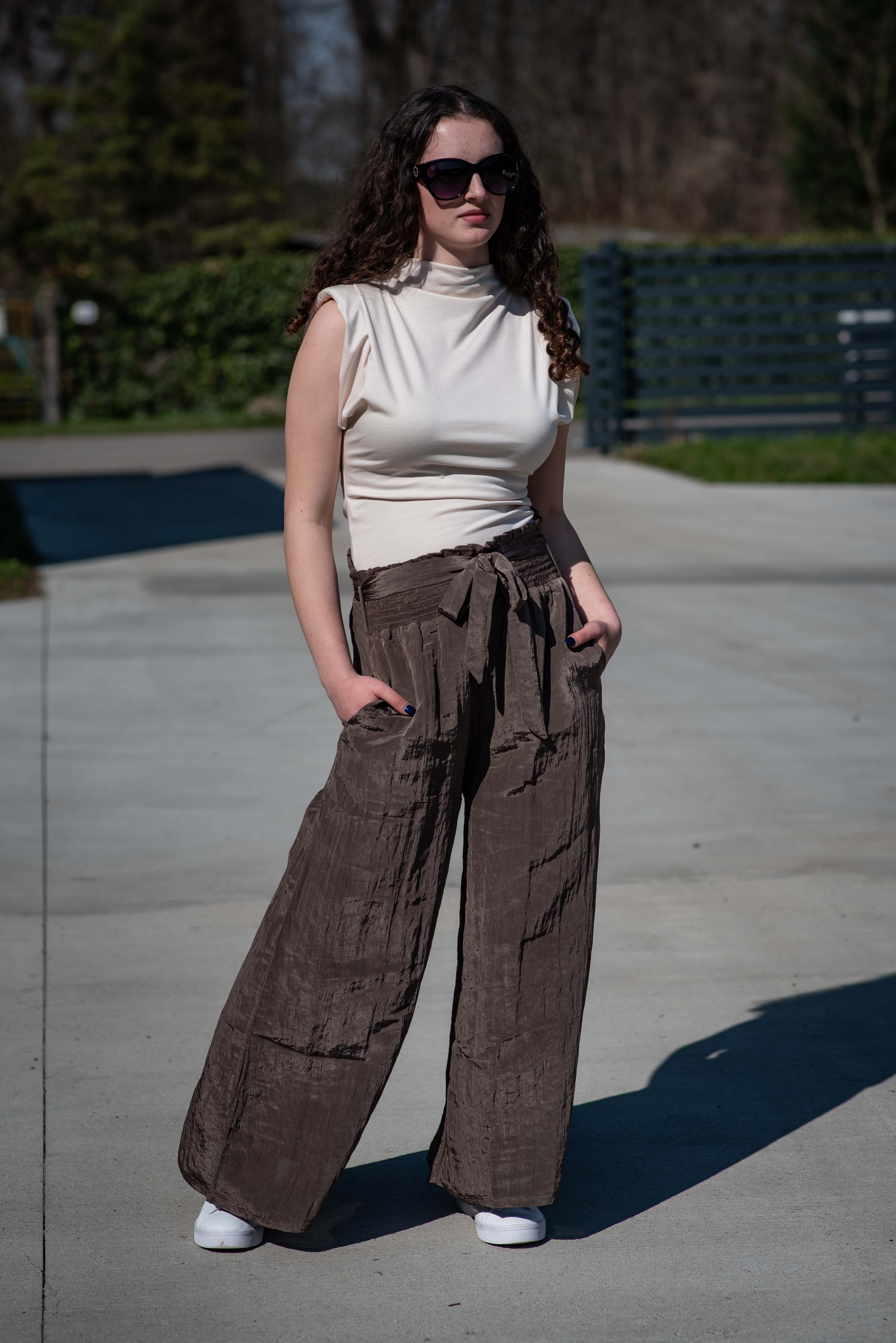 Stylové dámské široké kalhoty v pase do gumy. Kalhoty jsou z velice příjemného materiálu, trendy krčený materiál, doplněné páskem v barvě kalhot.