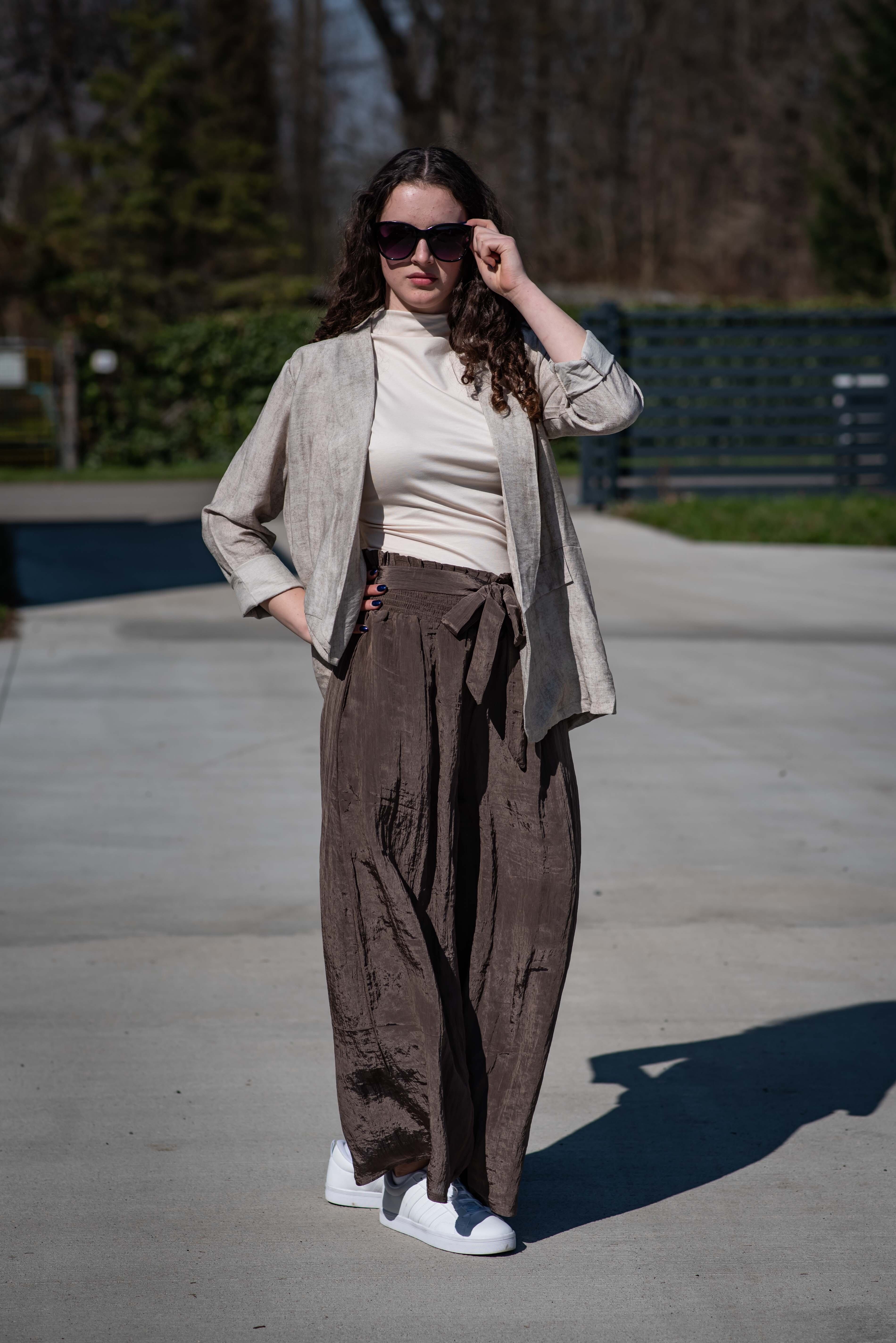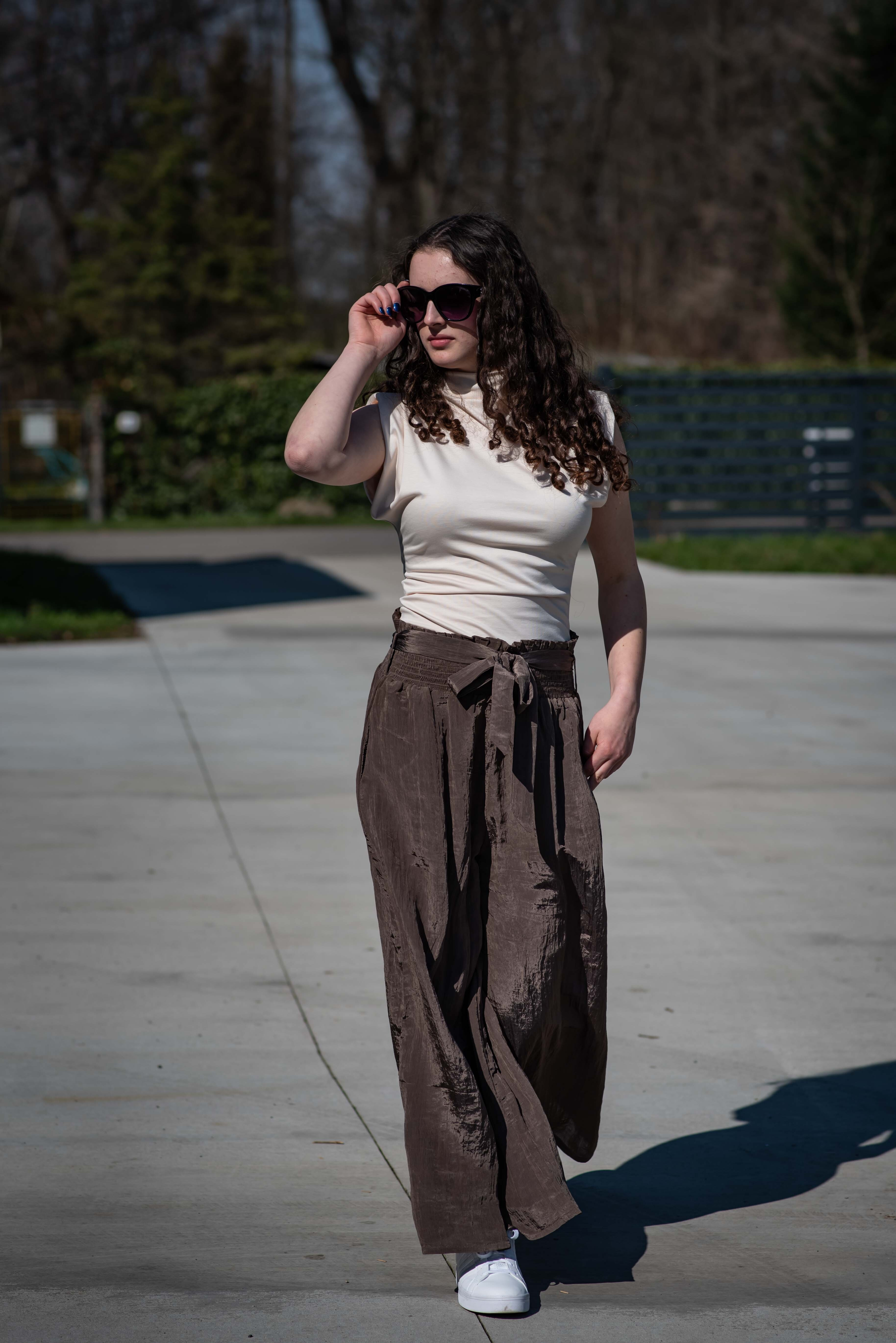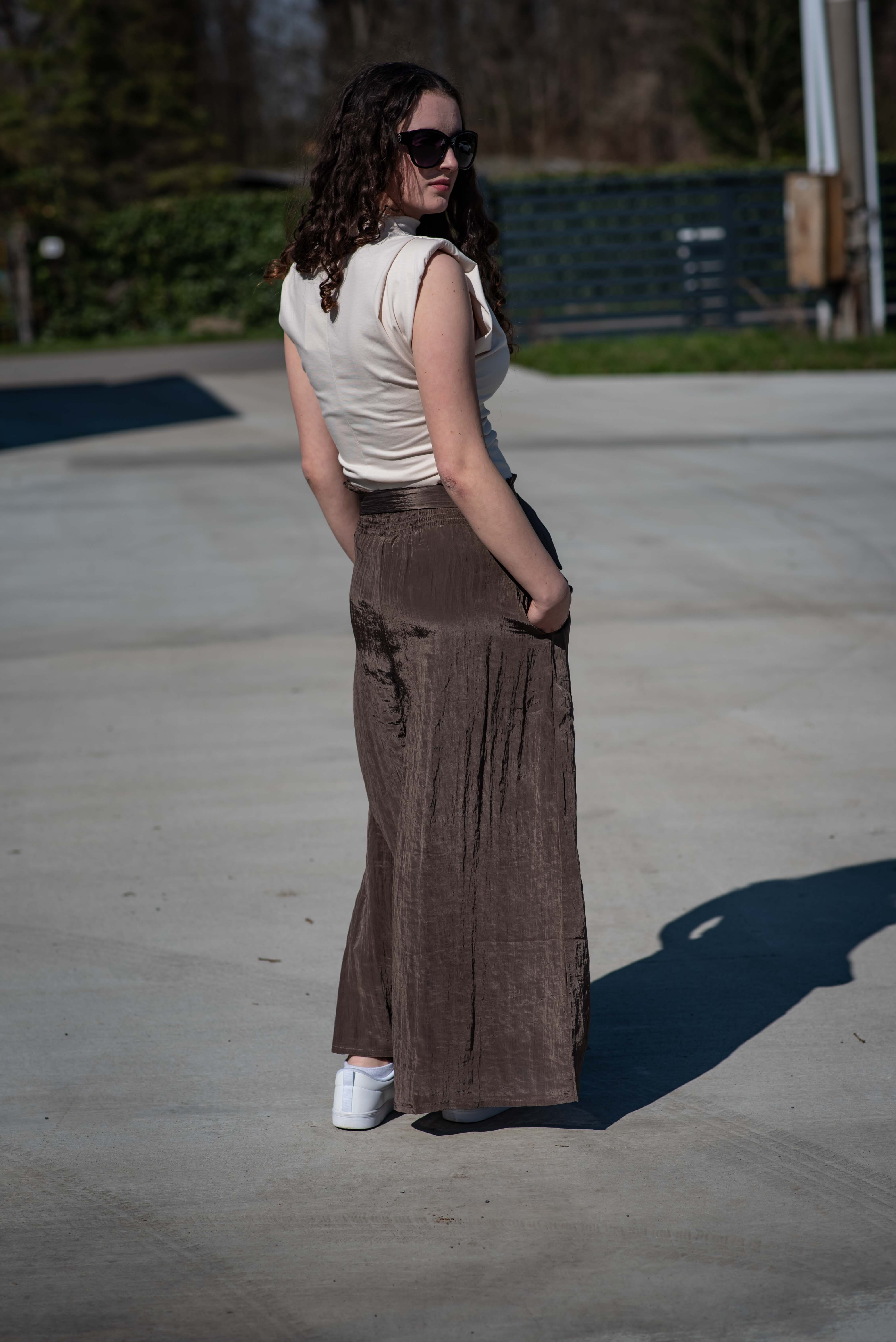 Stylové dámské široké kalhoty v pase do gumy. Kalhoty jsou z velice příjemného materiálu, trendy krčený materiál, doplněné páskem v barvě kalhot.