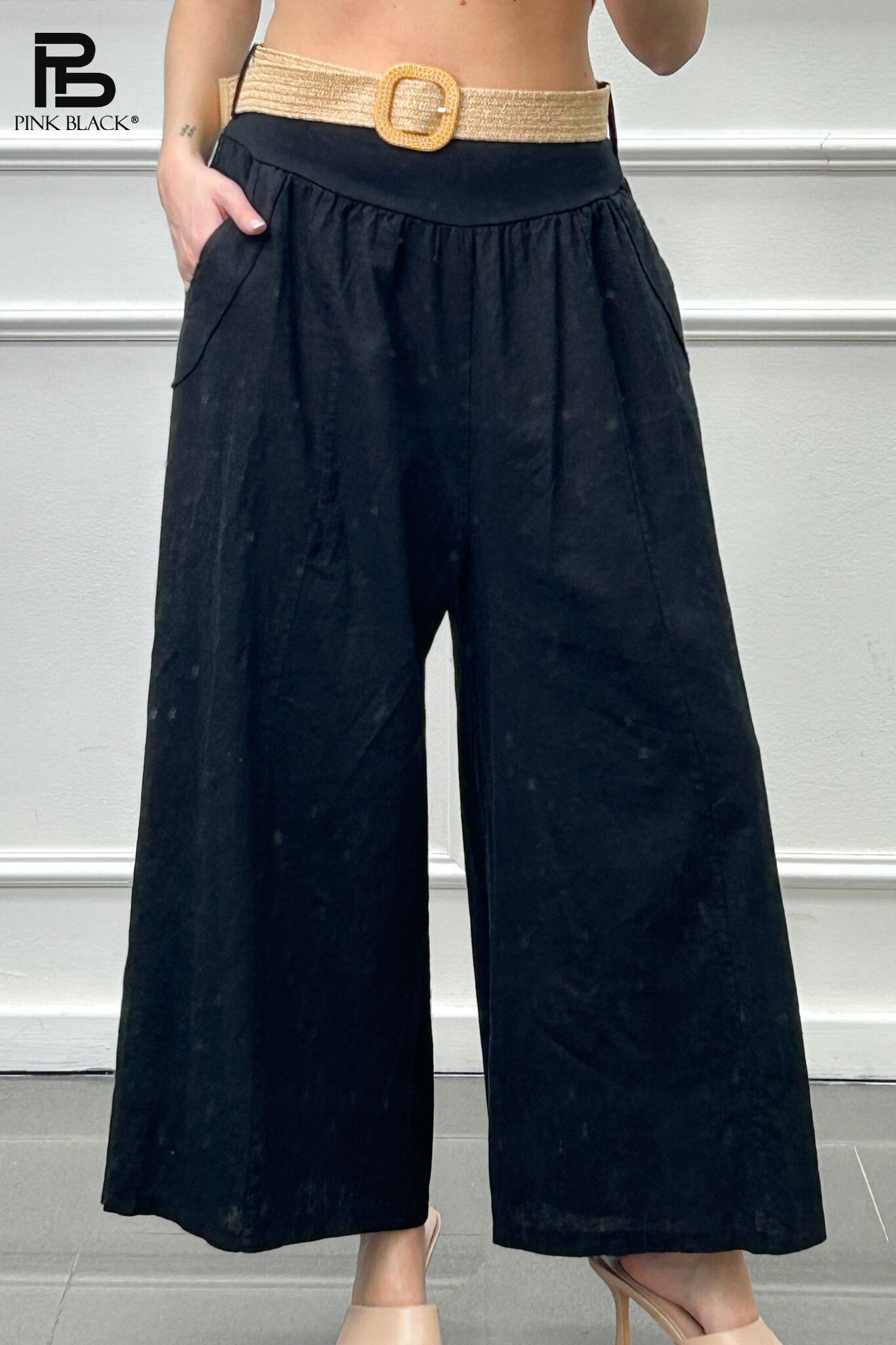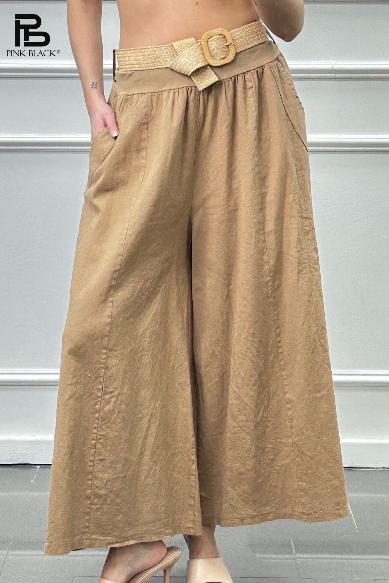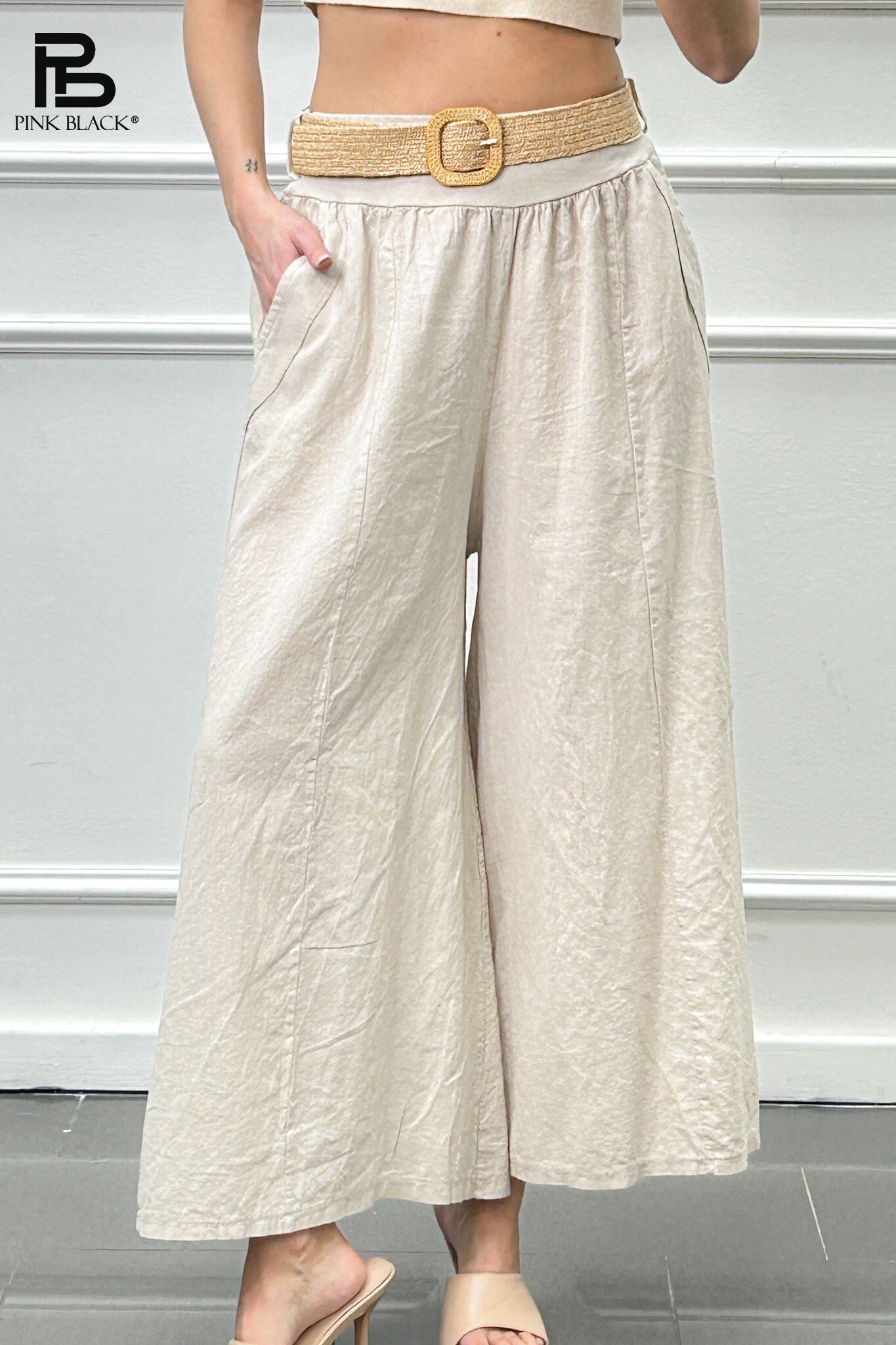 Módní lněné kalhoty s širokými nohavicemi. Kalhoty jsou v pase do gumy, doplněny páskem BOHO páskem.