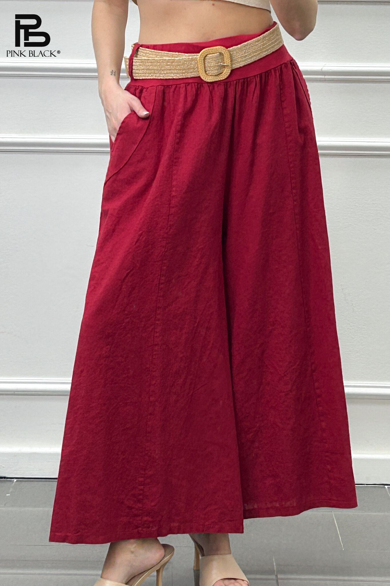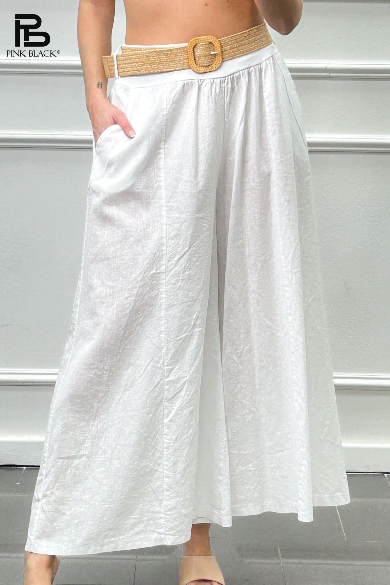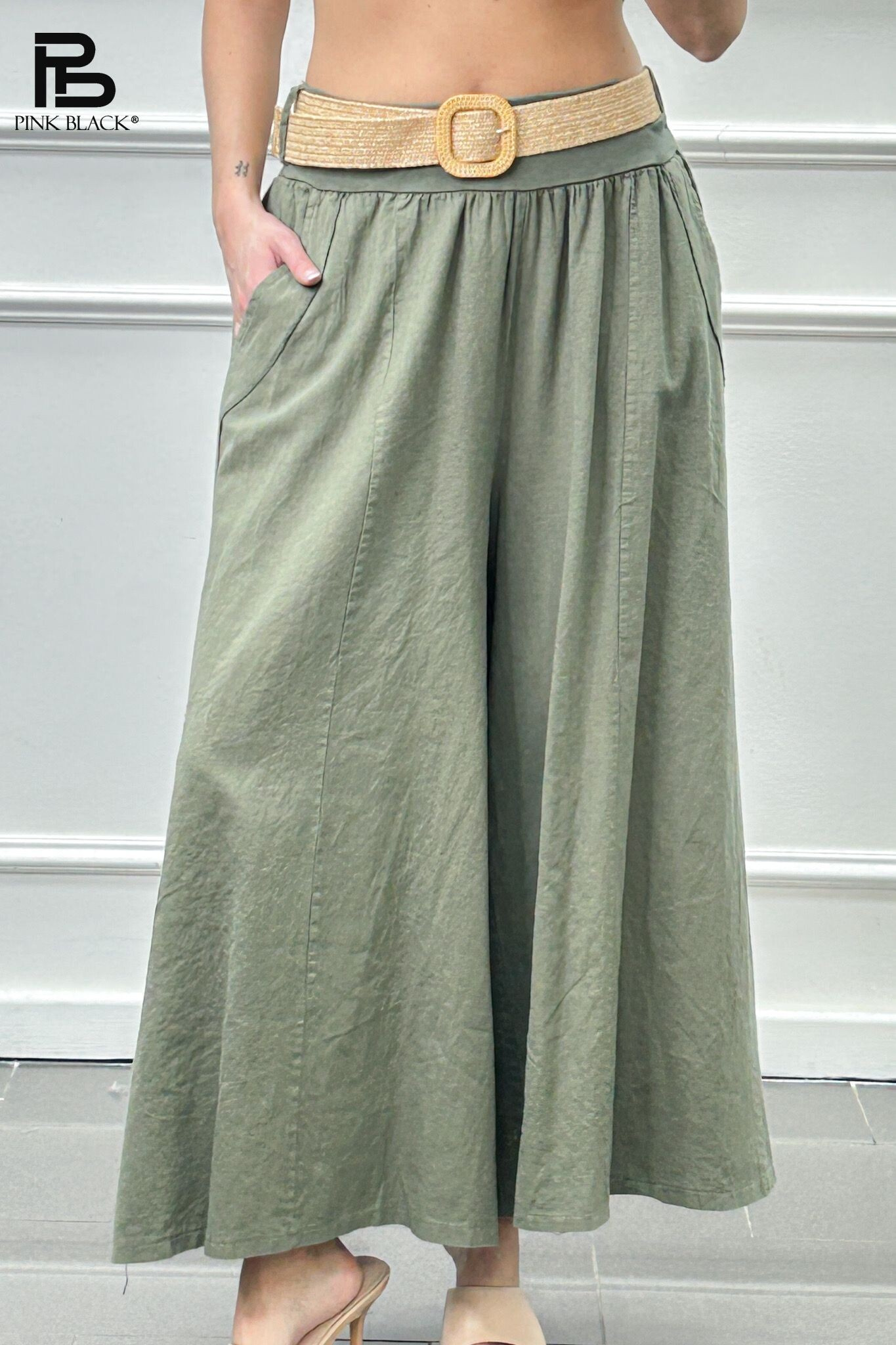 Módní lněné kalhoty s širokými nohavicemi. Kalhoty jsou v pase do gumy, doplněny páskem BOHO páskem.