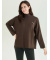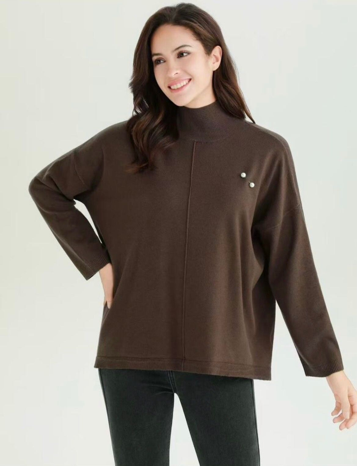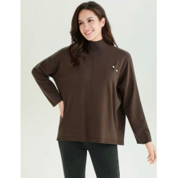 Elegantní stojáček z úpletového materiálu. Svetr je volnějšího střihu, má prodlouženou zadní délku, kulatý výstřih a je doplněn odnímatelnou broží.