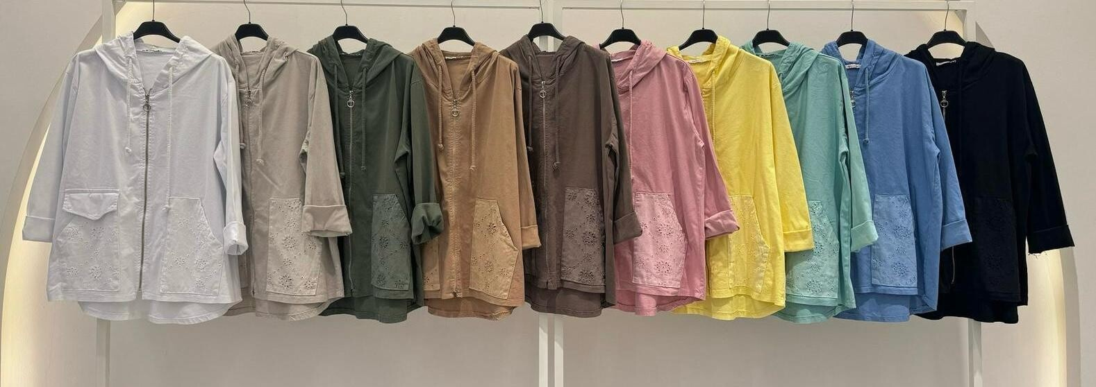 Stylová bavlněná bunda s kapucí a zapínáním na zip. Bunda má našité kapsy s madeirou.