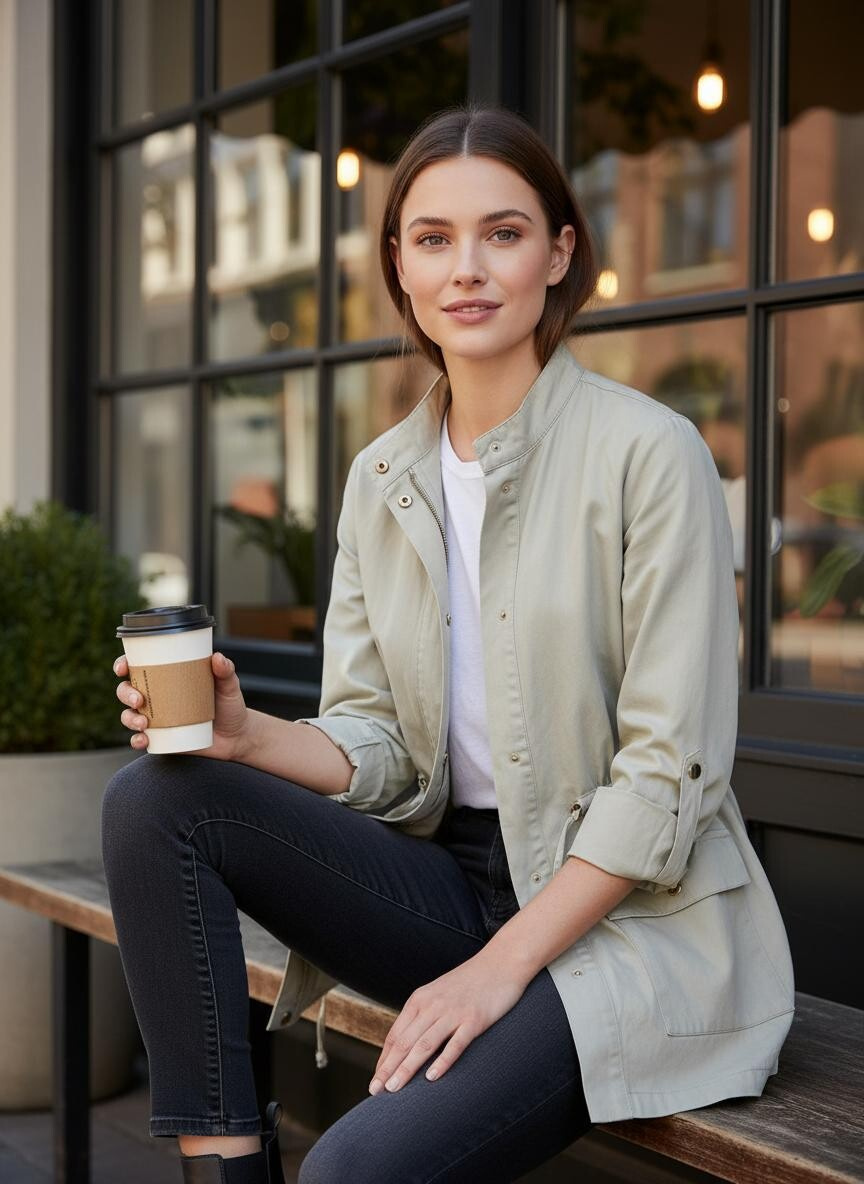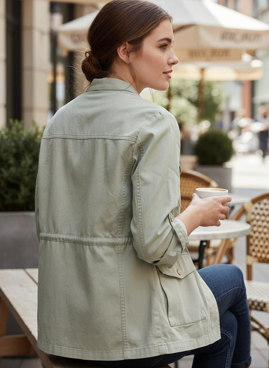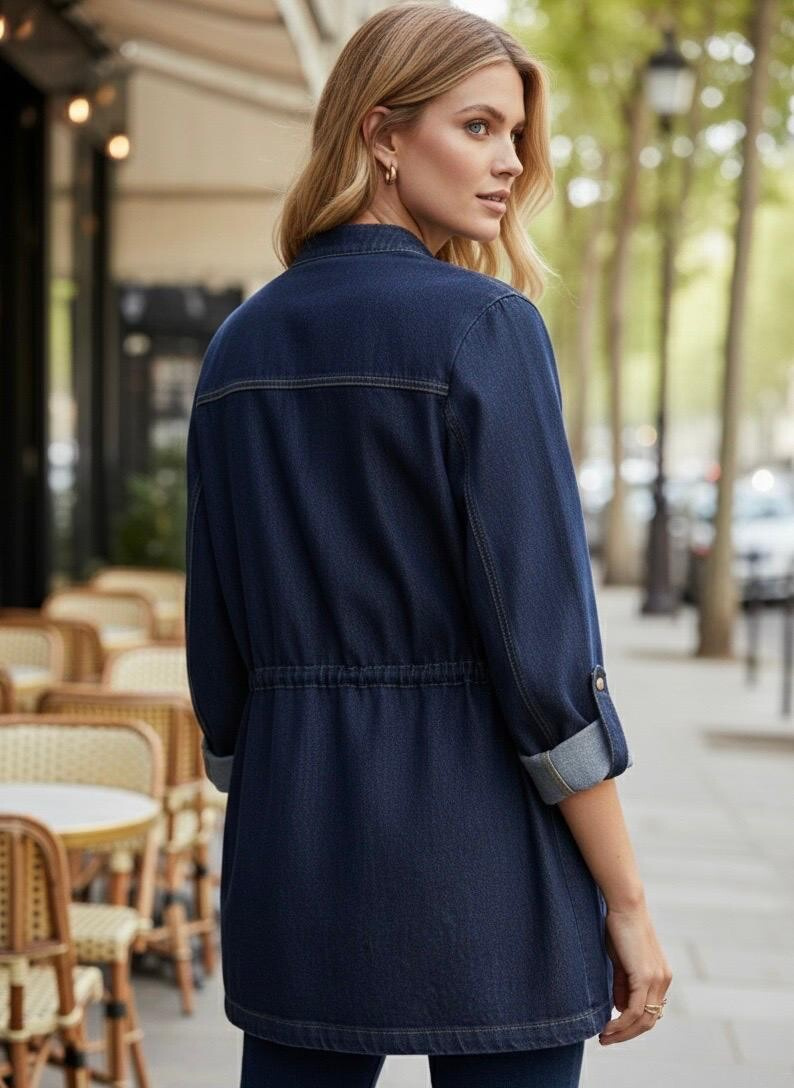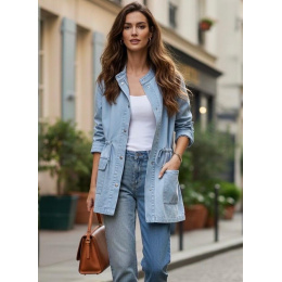 Stylová parka džínová s dlouhým rukávem. Je doplněna regulací na rukávech a v pase. Kabátek/parka má zapínání na druky, délku pod zadek a na přední straně našité kapsy s klopami.