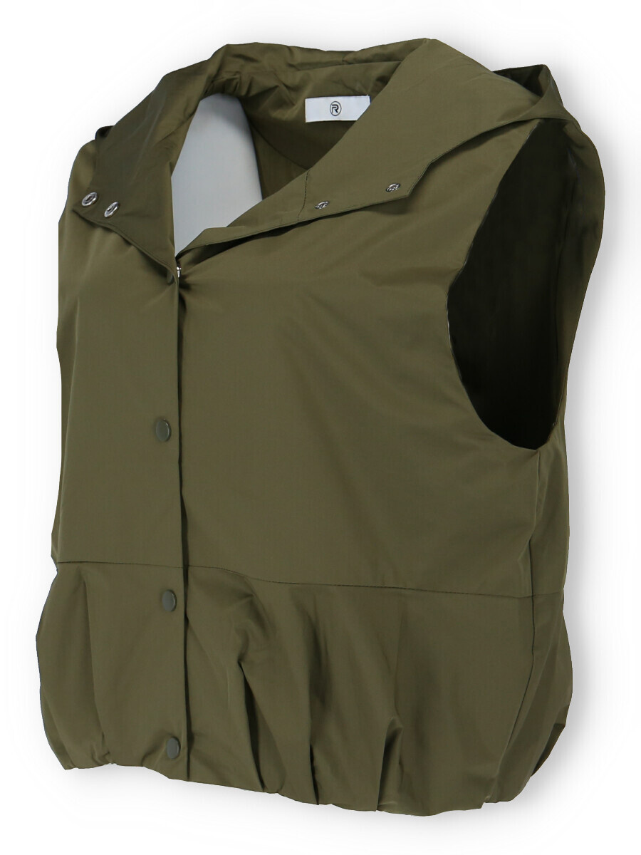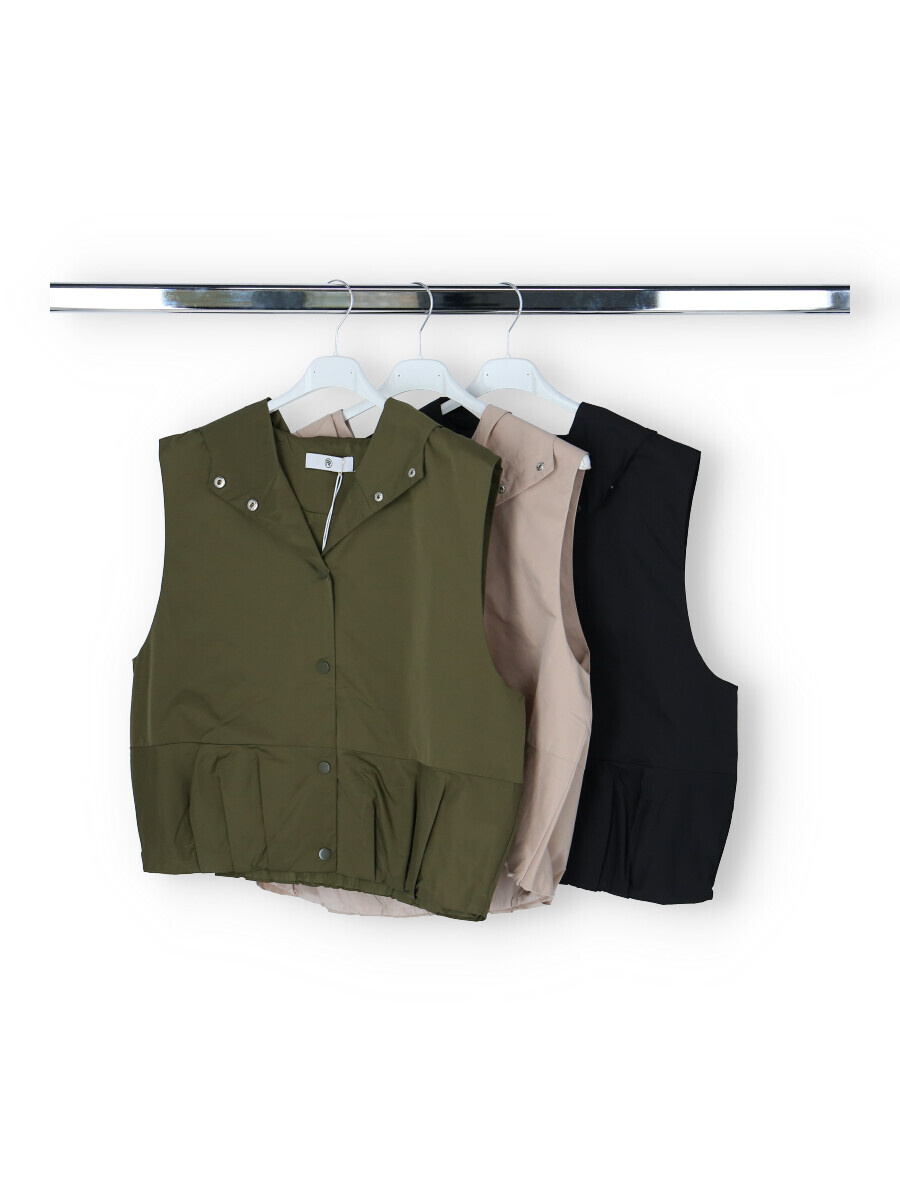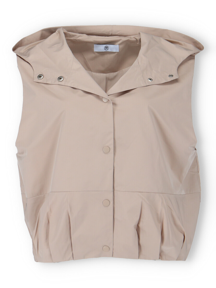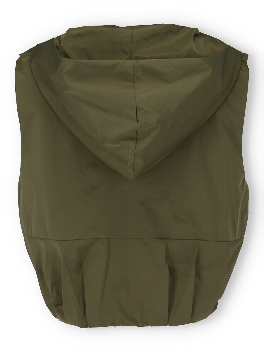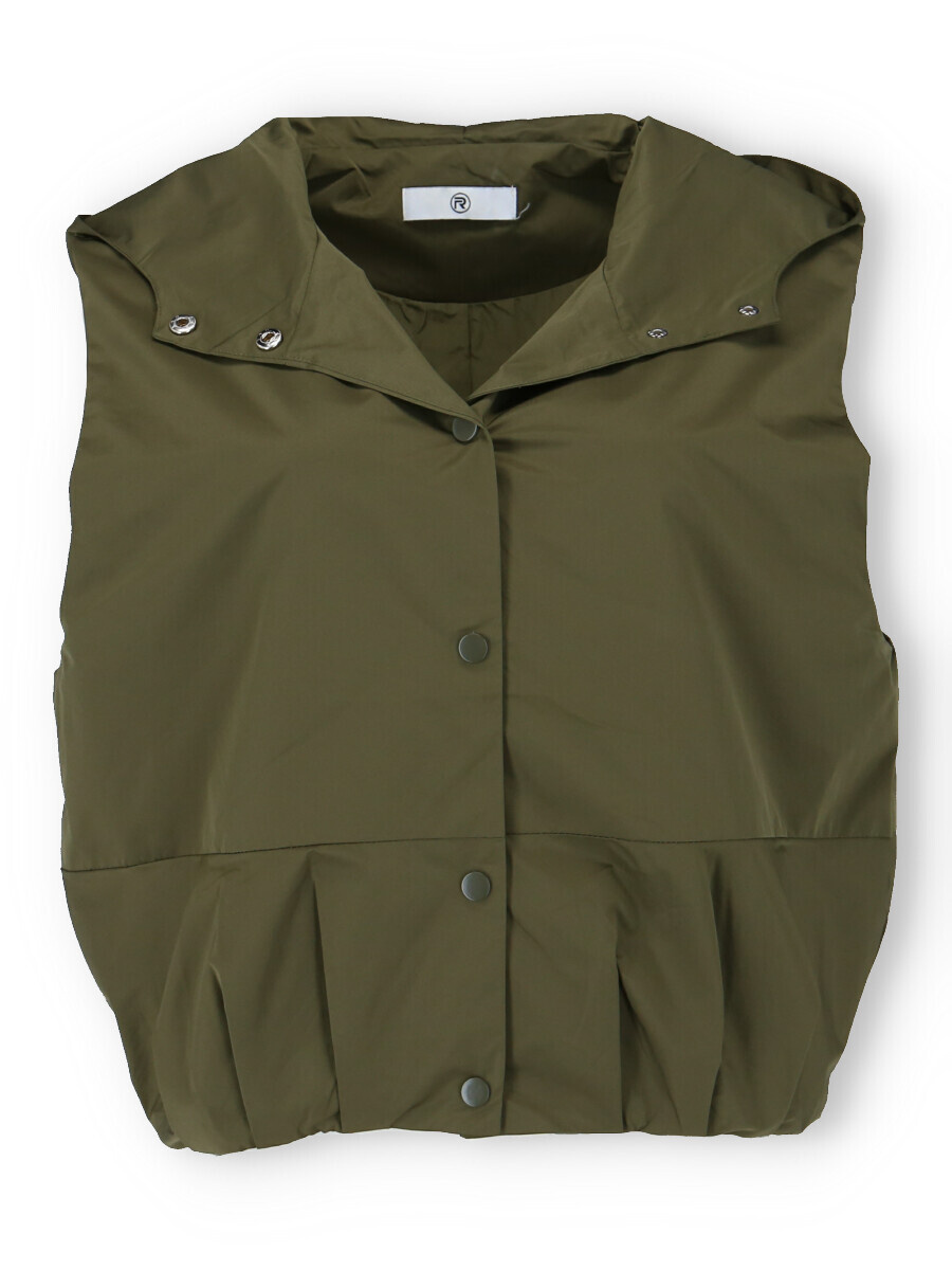 Dámská stylová krátká vesta s kapucí a oversize střihu. Vesta má zapínaní na druky a ve spodní části je na gumičku s řasením. Vyrobeno v Itálii