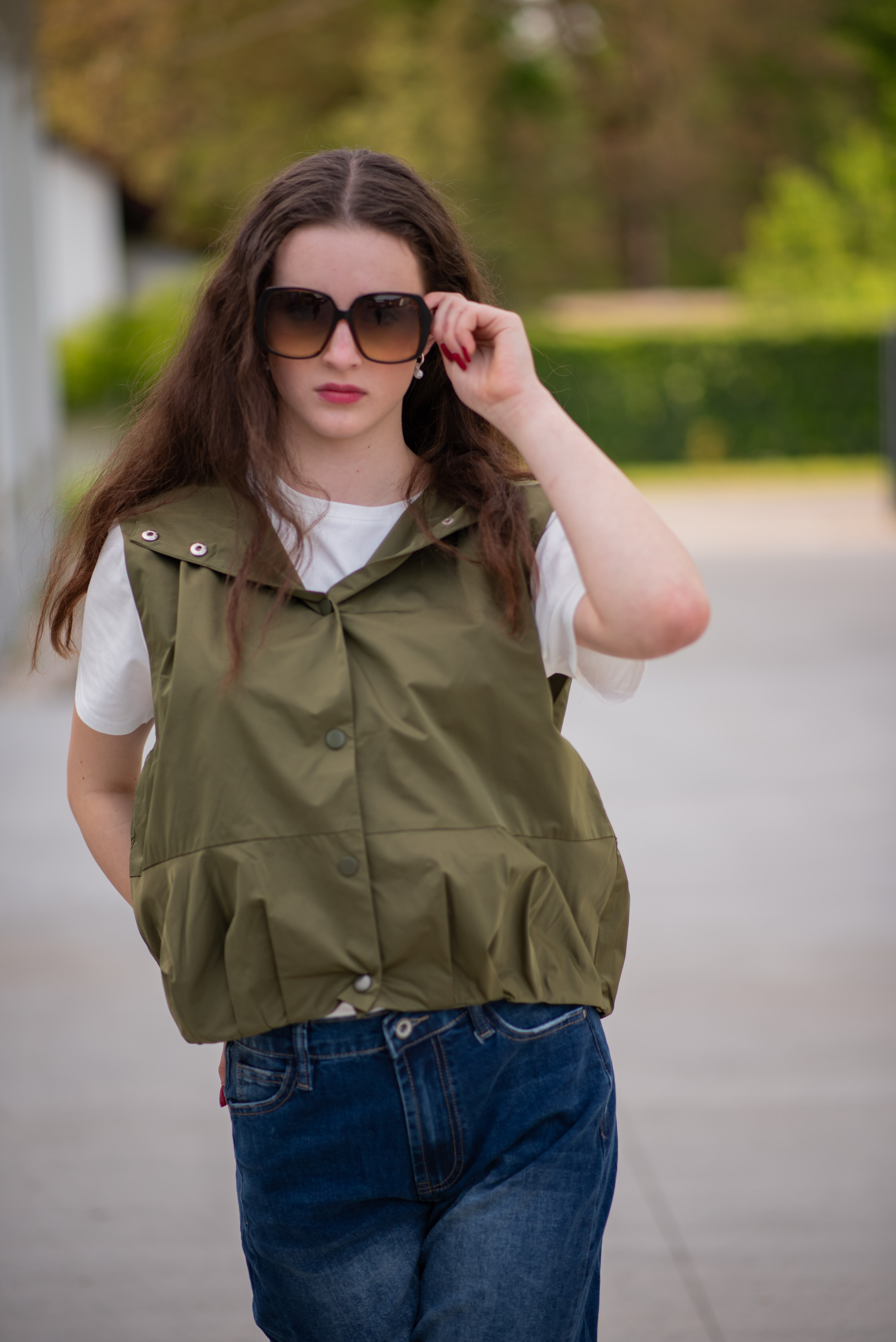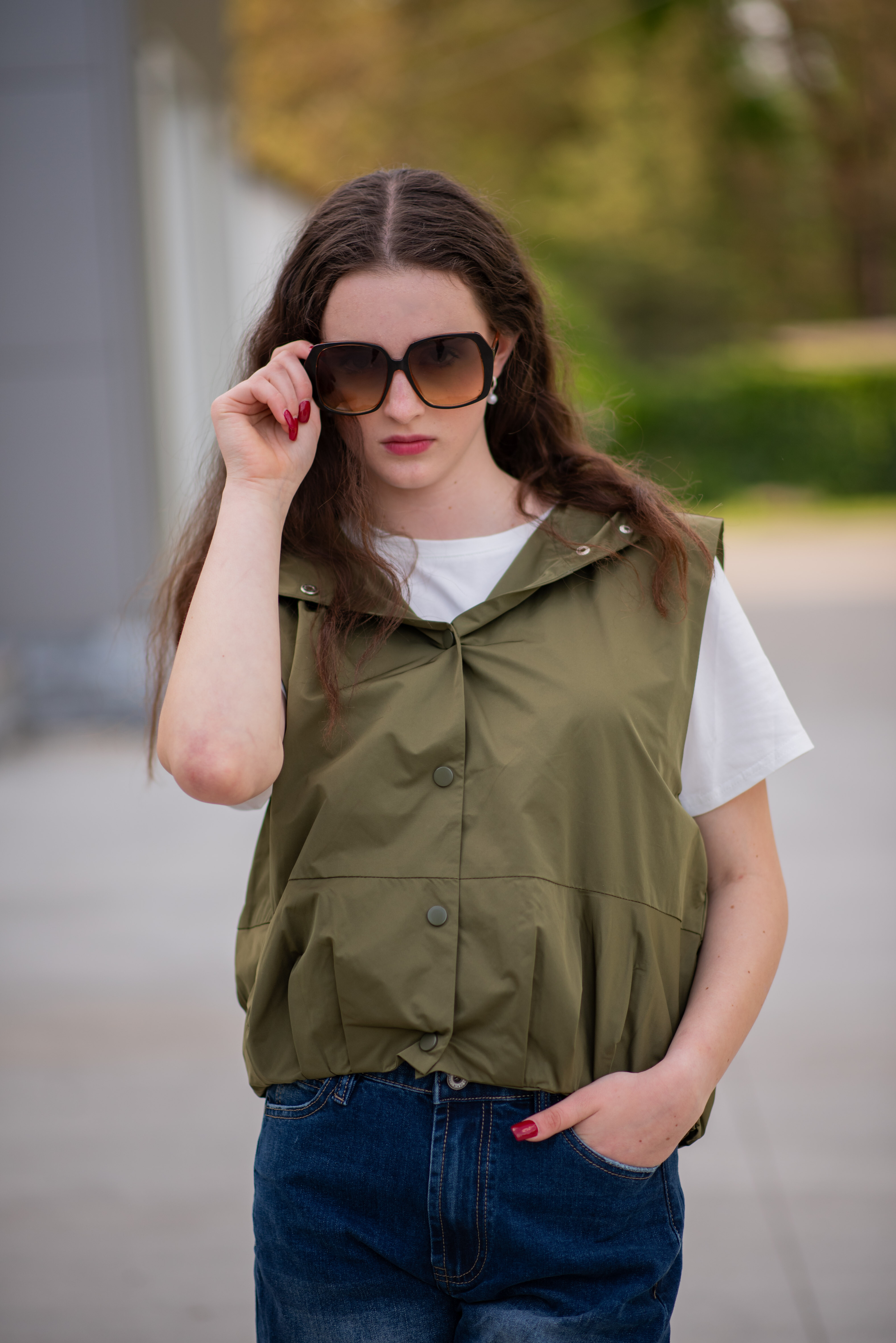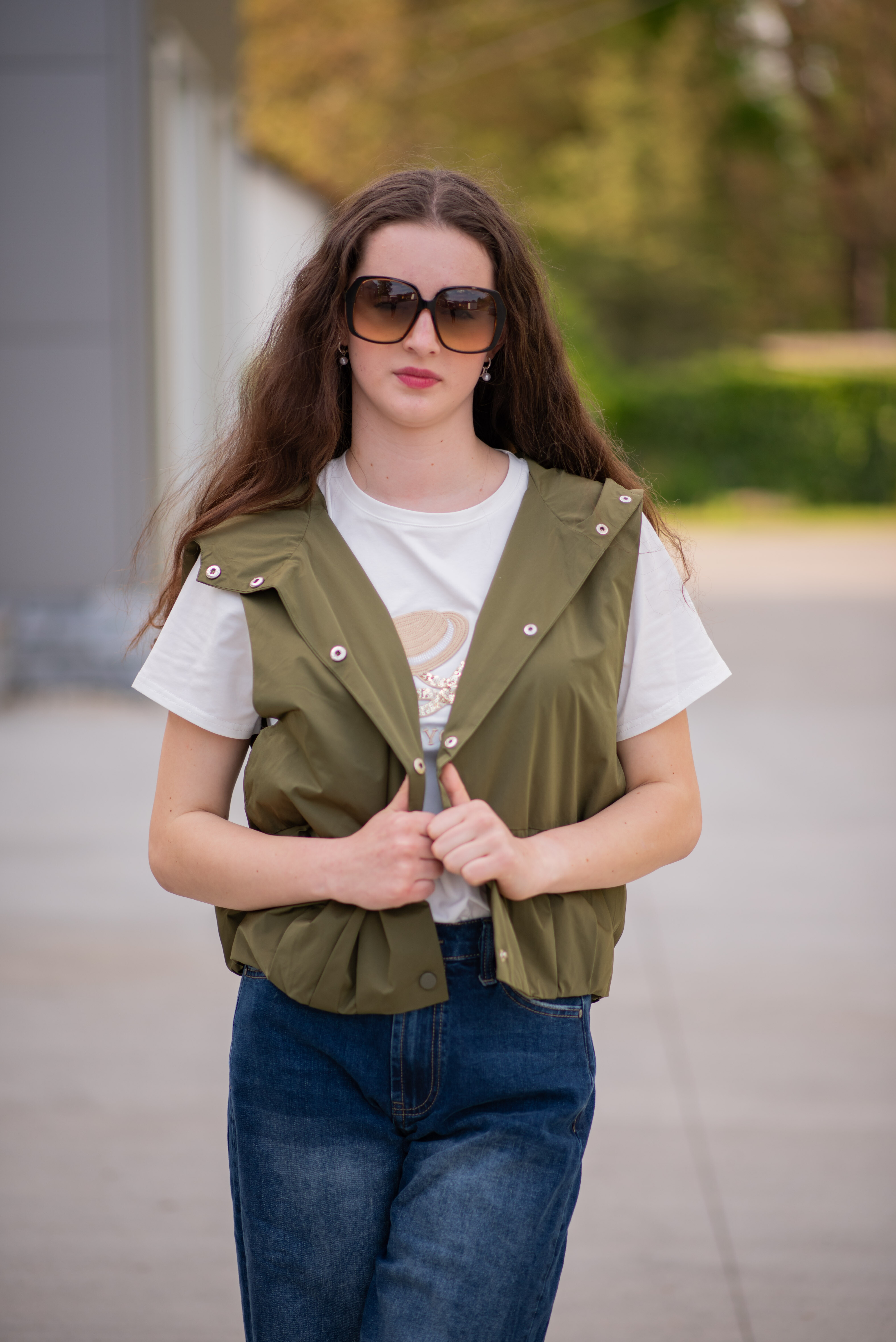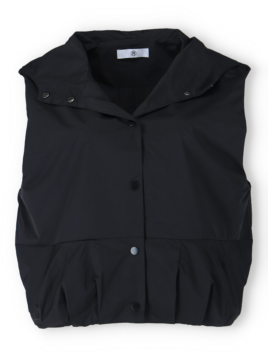 Dámská stylová krátká vesta s kapucí a oversize střihu. Vesta má zapínaní na druky a ve spodní části je na gumičku s řasením. Vyrobeno v Itálii