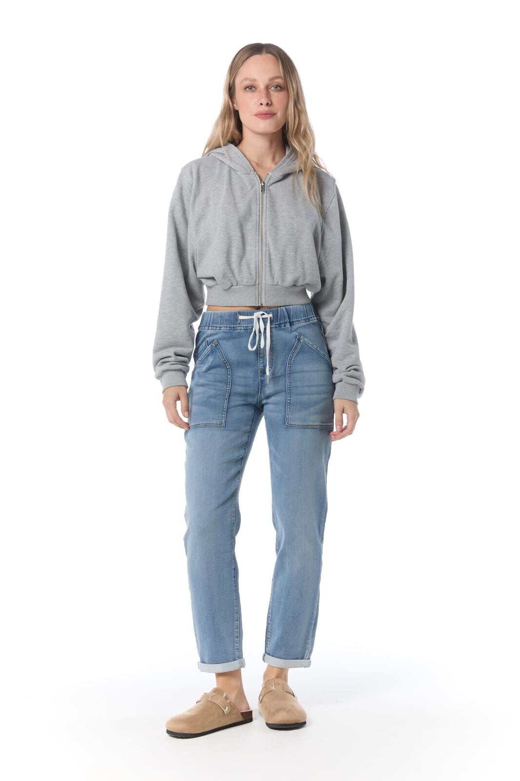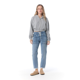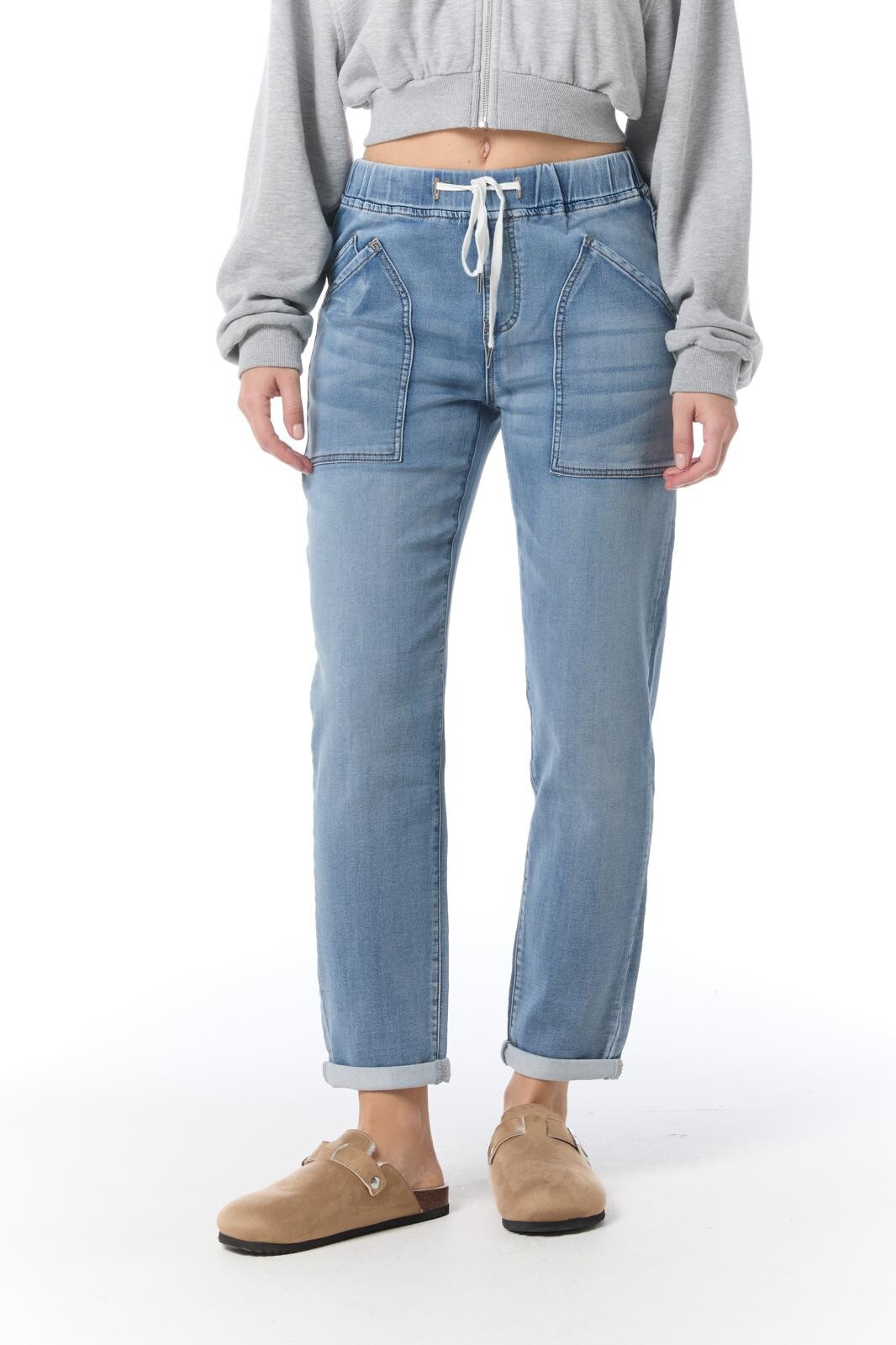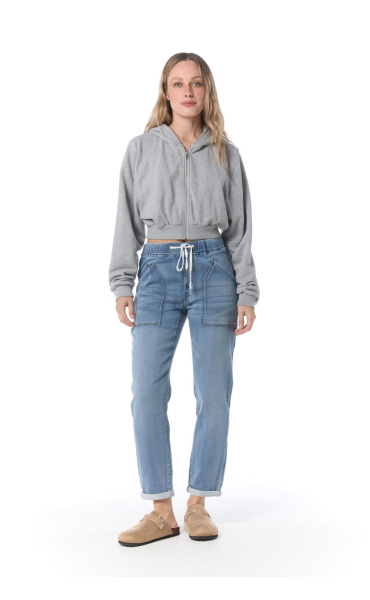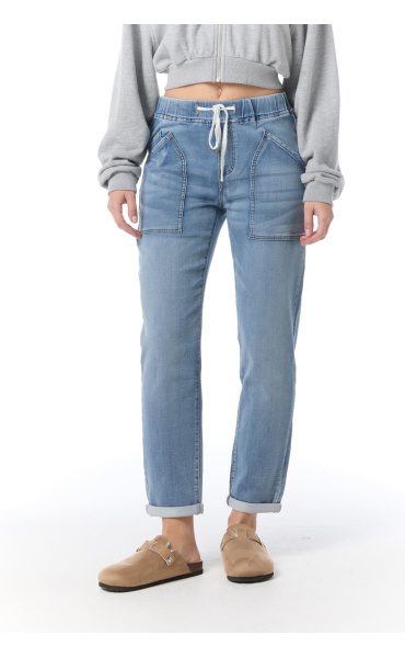 Stylové džínové kalhoty v pase do gumy s možností stažení na šňůrku. Džíny mají na přední i zadní straně našité kapsy.