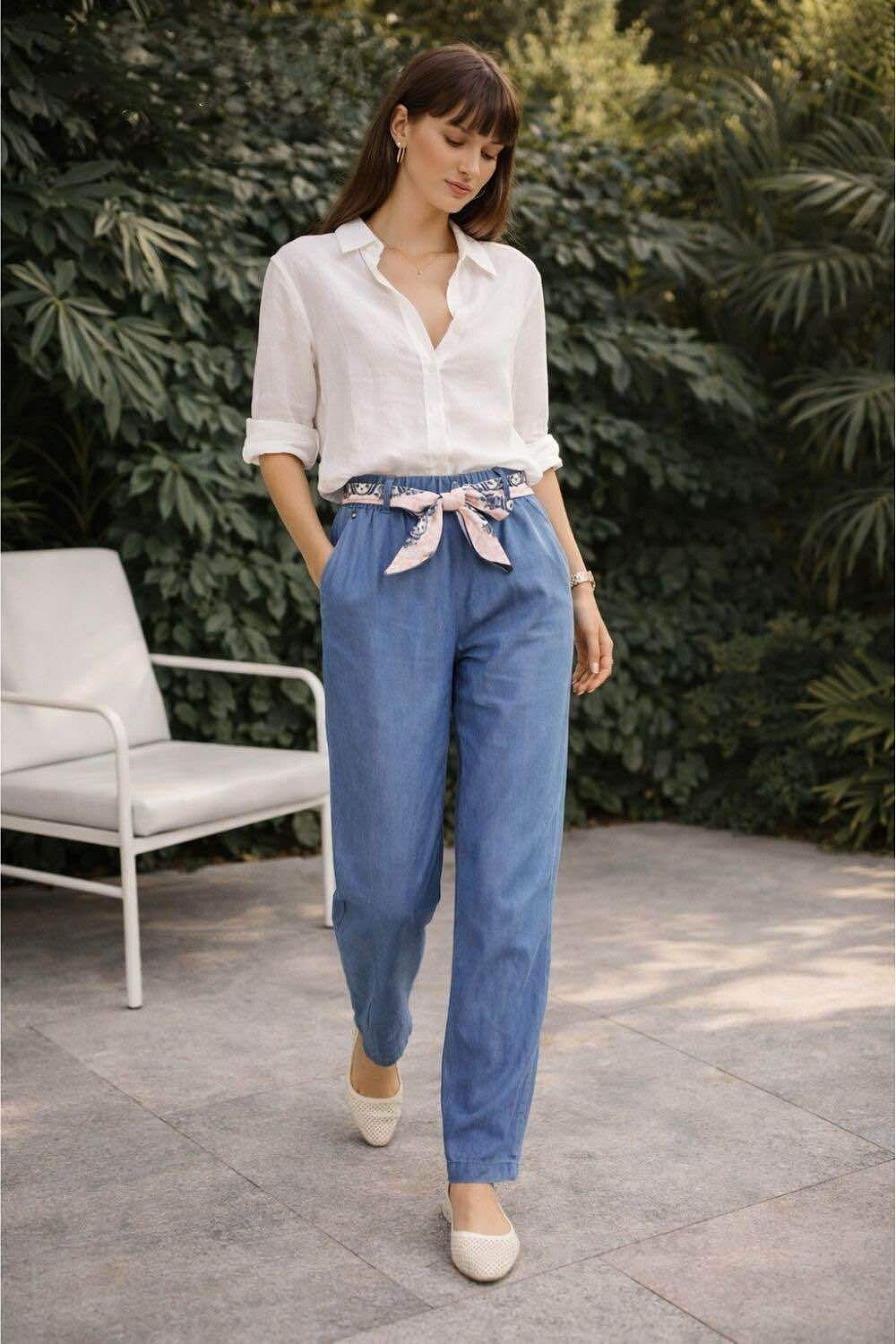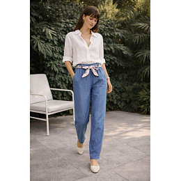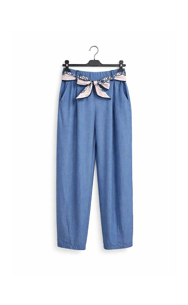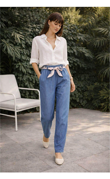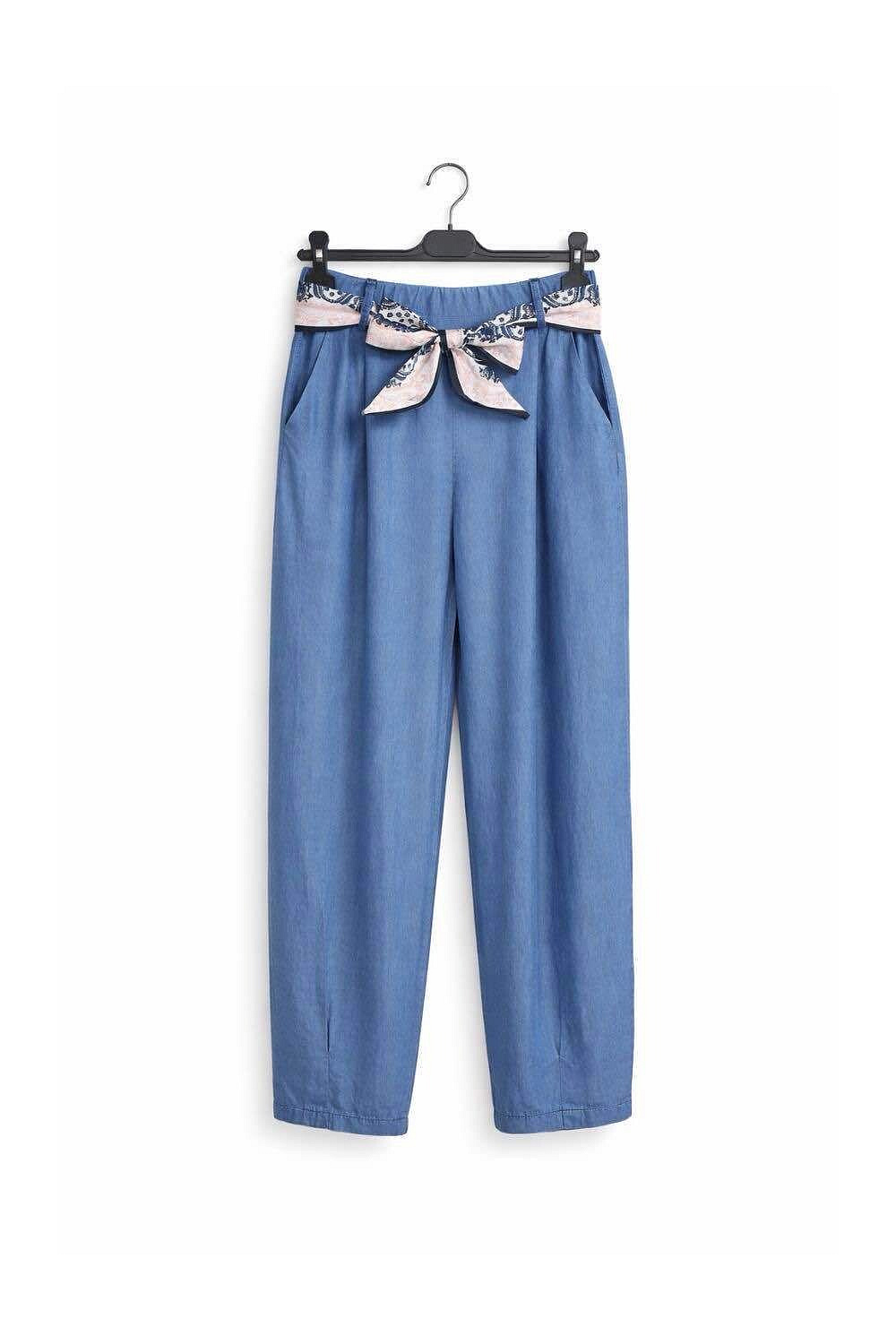 Dámské kalhoty se zúženými nohavice u kotníků. Kalhoty jsou z prodyšného, odlehčeného materiálu Lyocell, v pase jsou do gumy, doplněny stylovým šátkem.