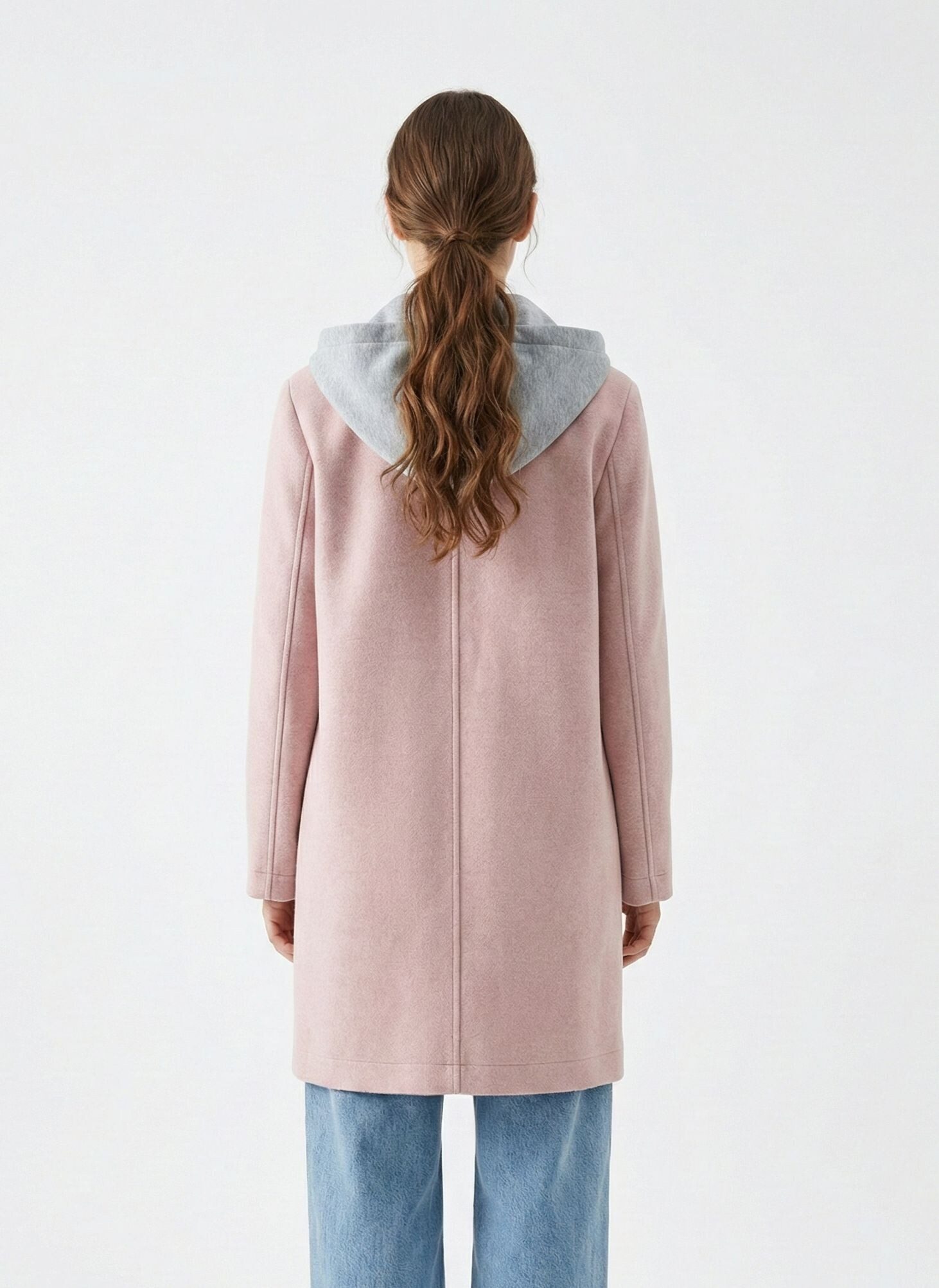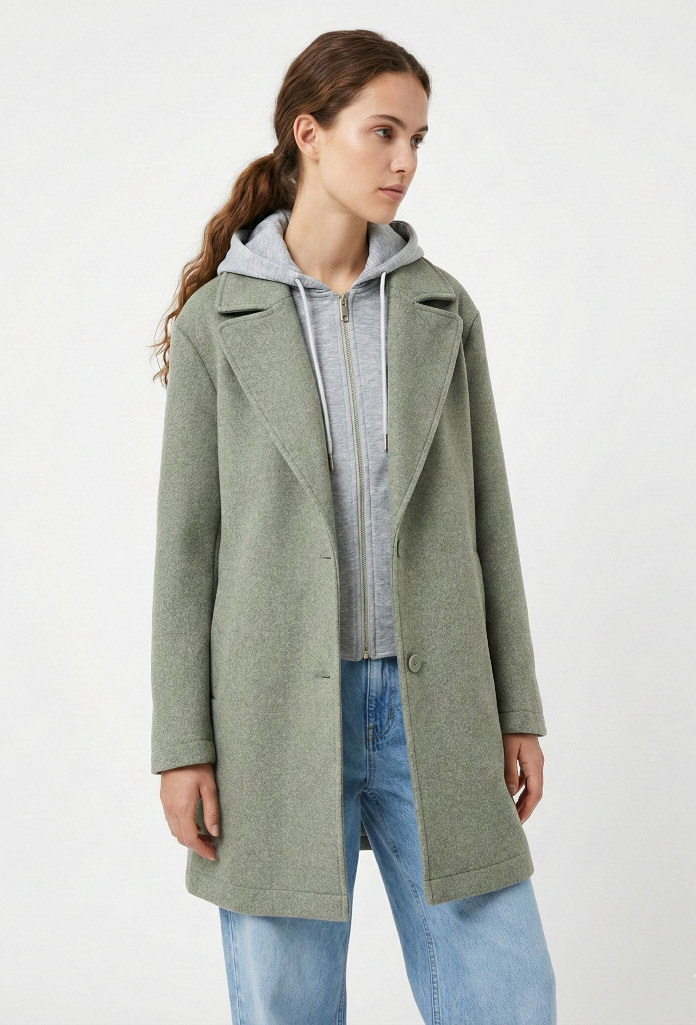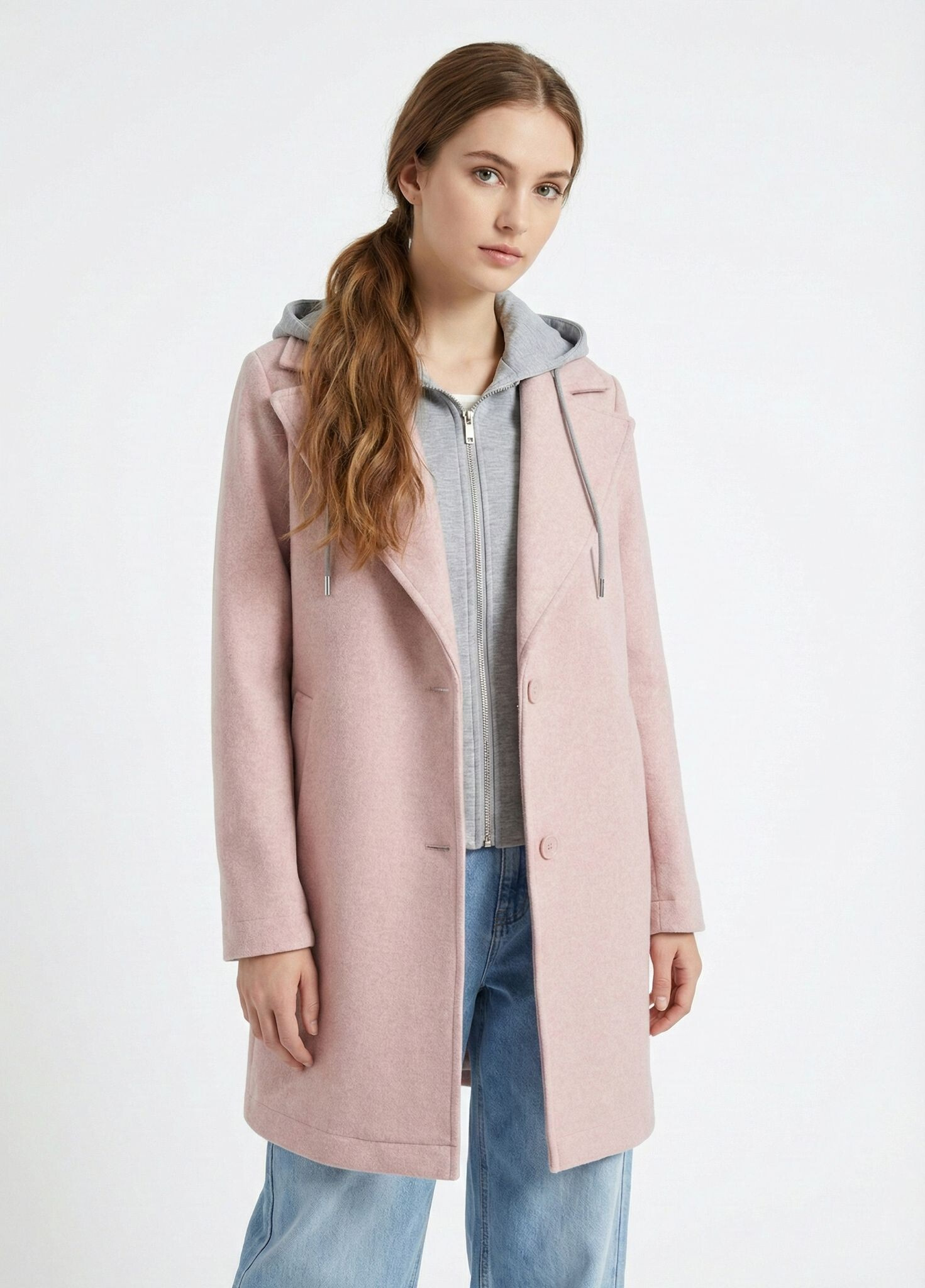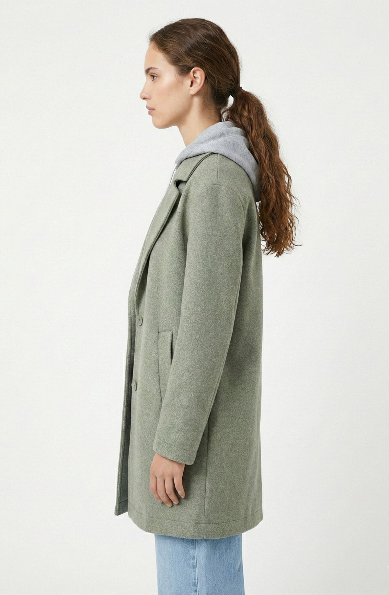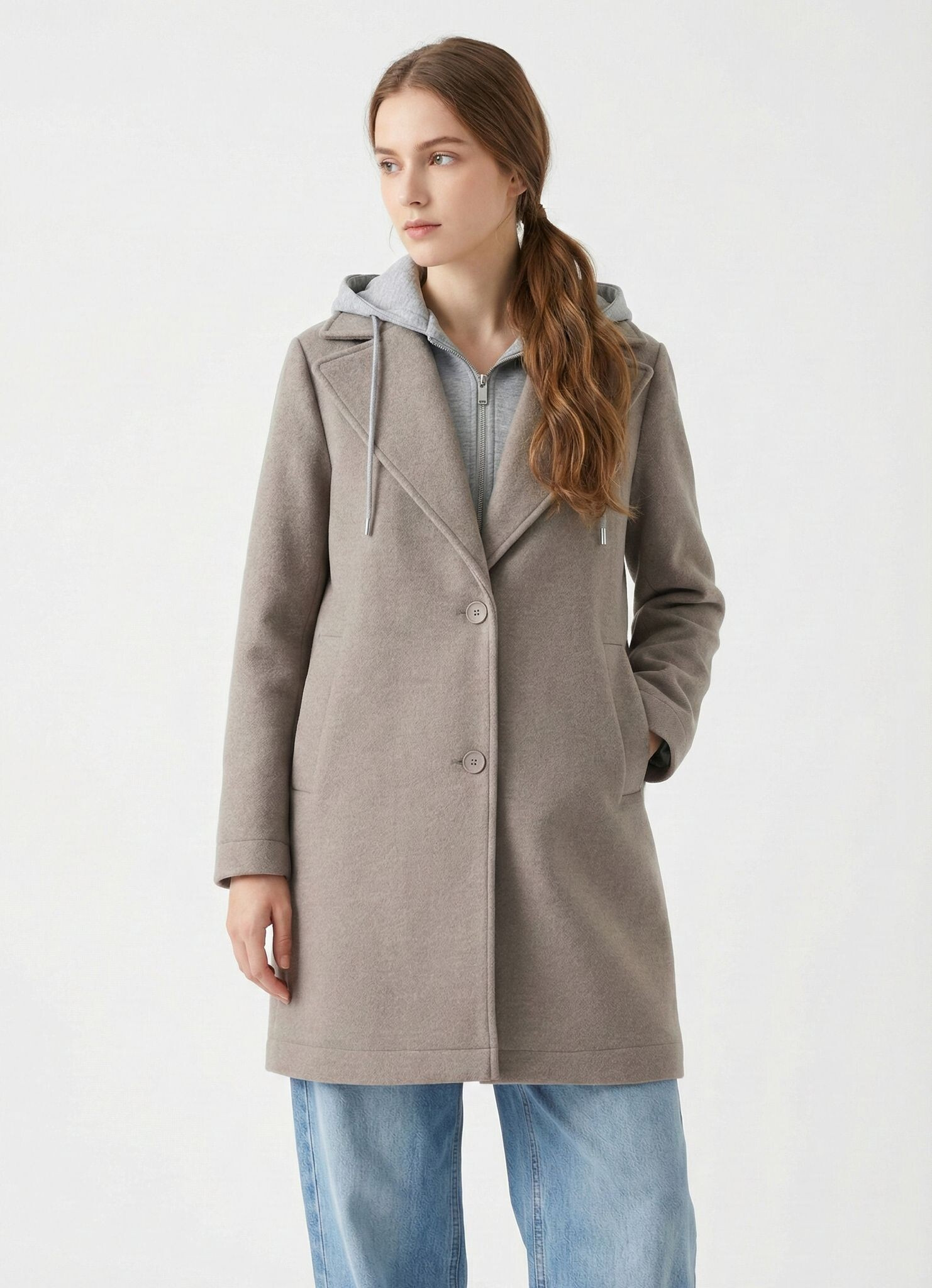 Stylový jarní kabát s mikinou. Kabát má límec a zapínání na dva knoflíky, po stranách všité kapsy. Je podšitý krátkou mikinou v šedé barvě na zip. Trendy kousek, který nesmí chybět ve vašem šatníku.