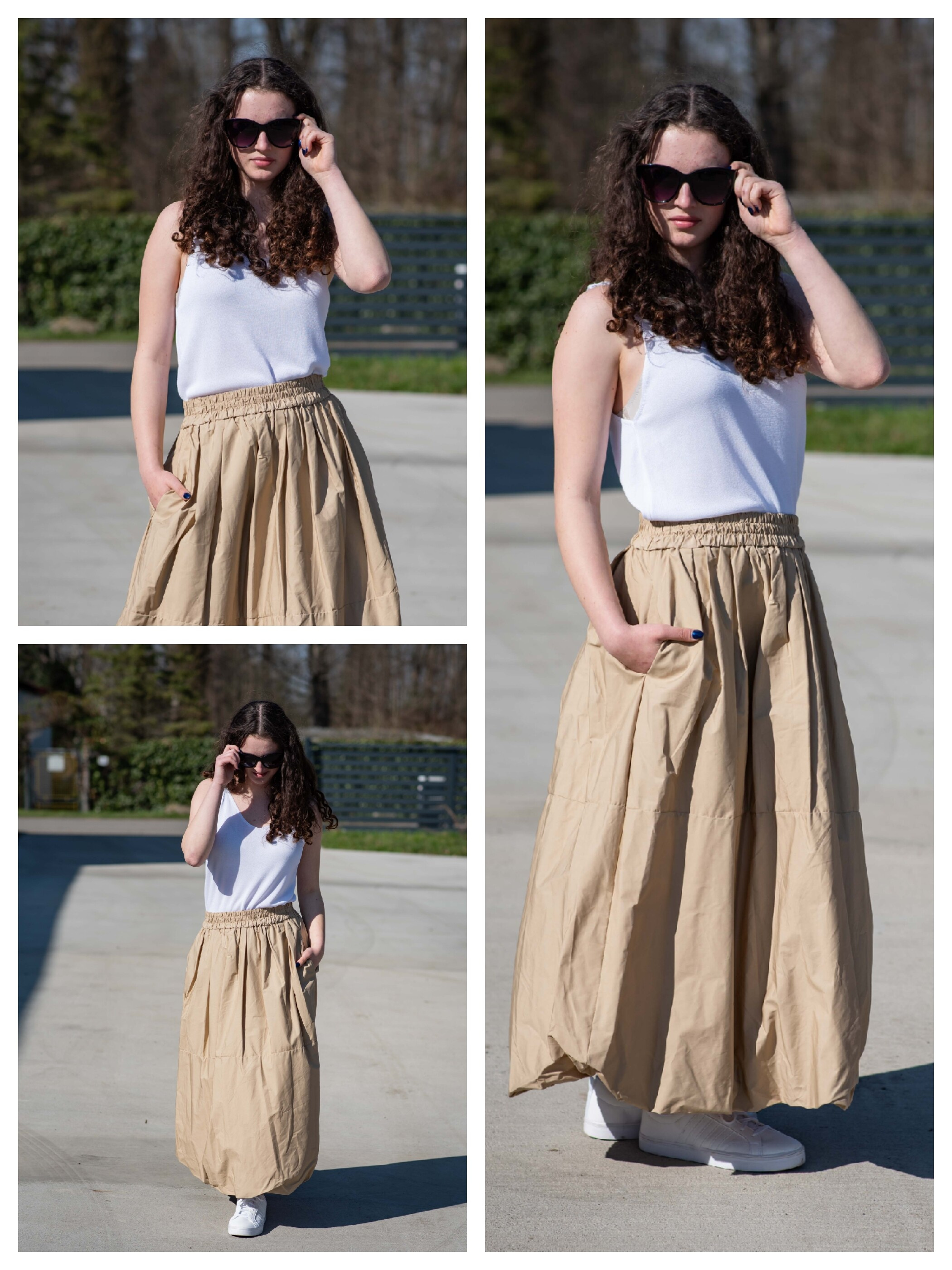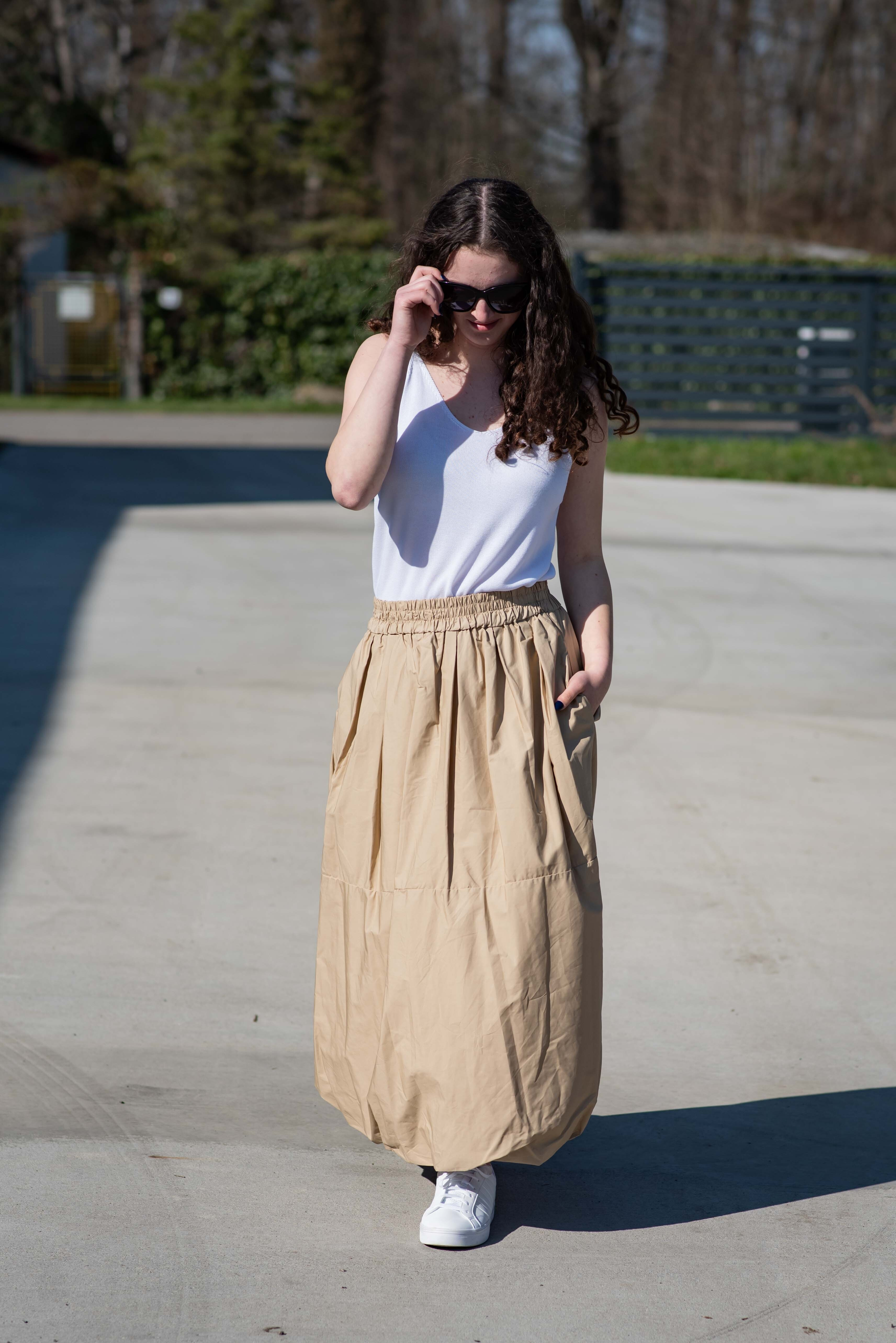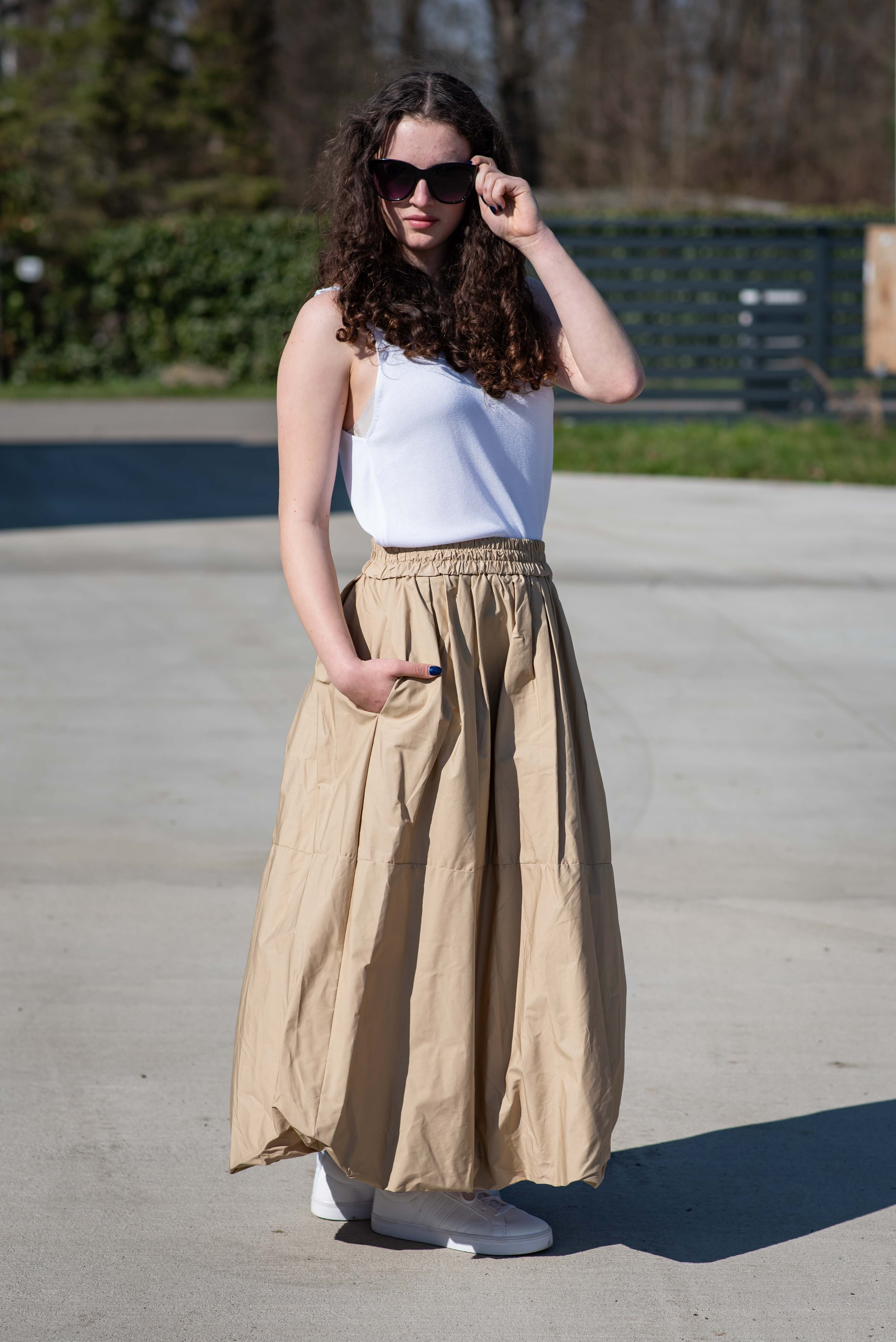 Dámská sukně balónového střihu v MIDI délce. Sukně má všité kapsy po stranách a v pase je do gumy.