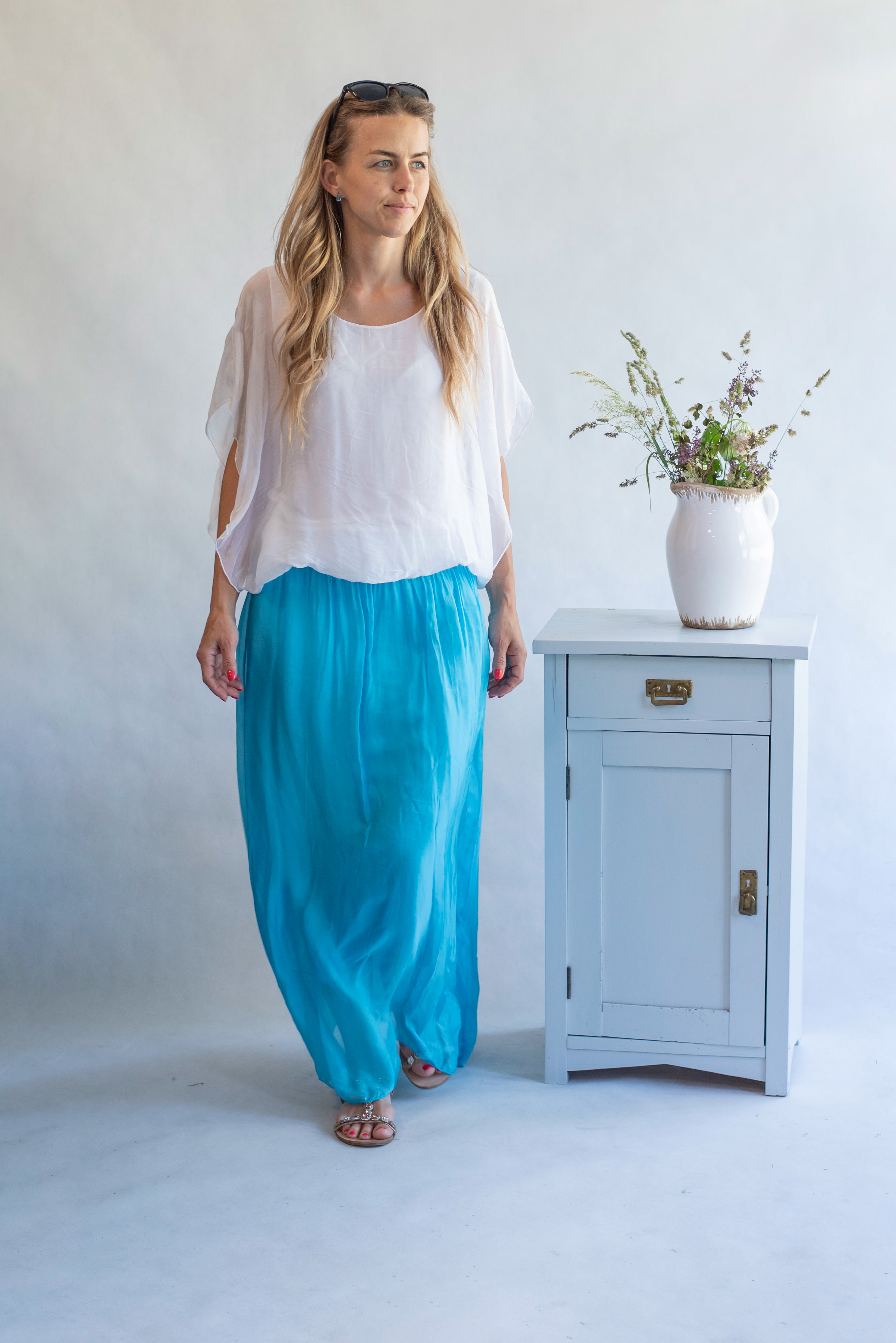Elegantní dlouhá, hedvábná sukně s elastickým pasem, může se nosit i jako šaty .Vyrobeno v Itálii .