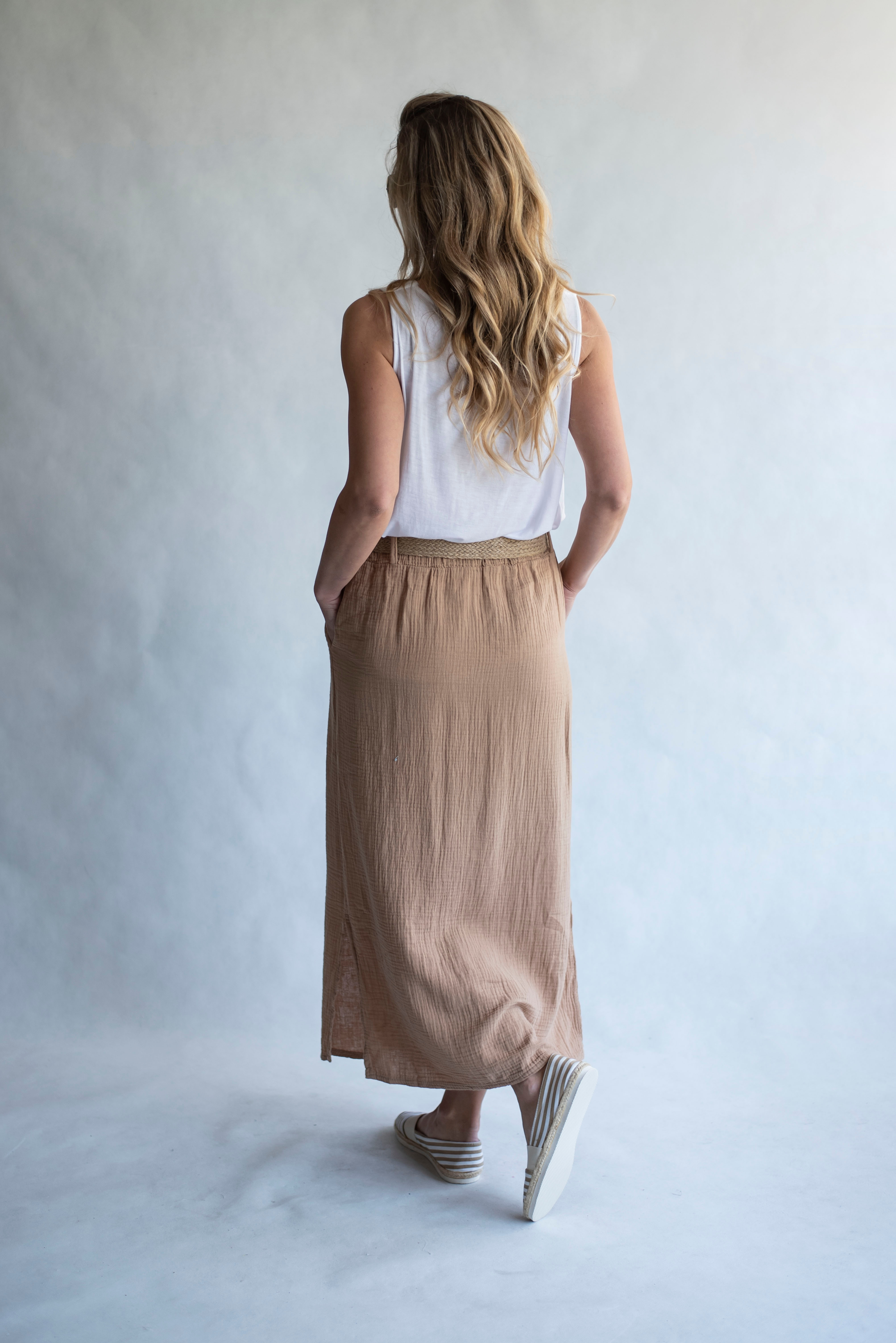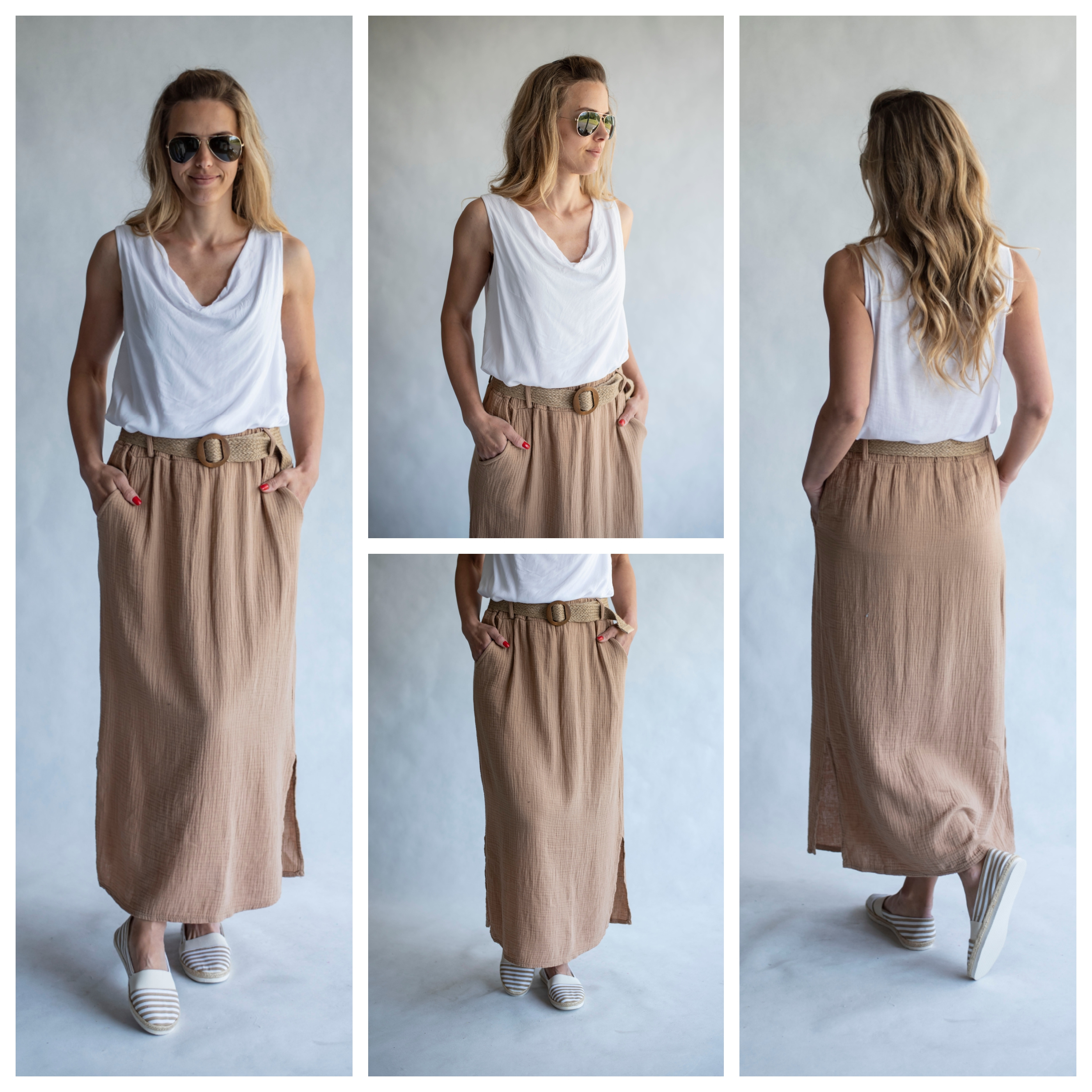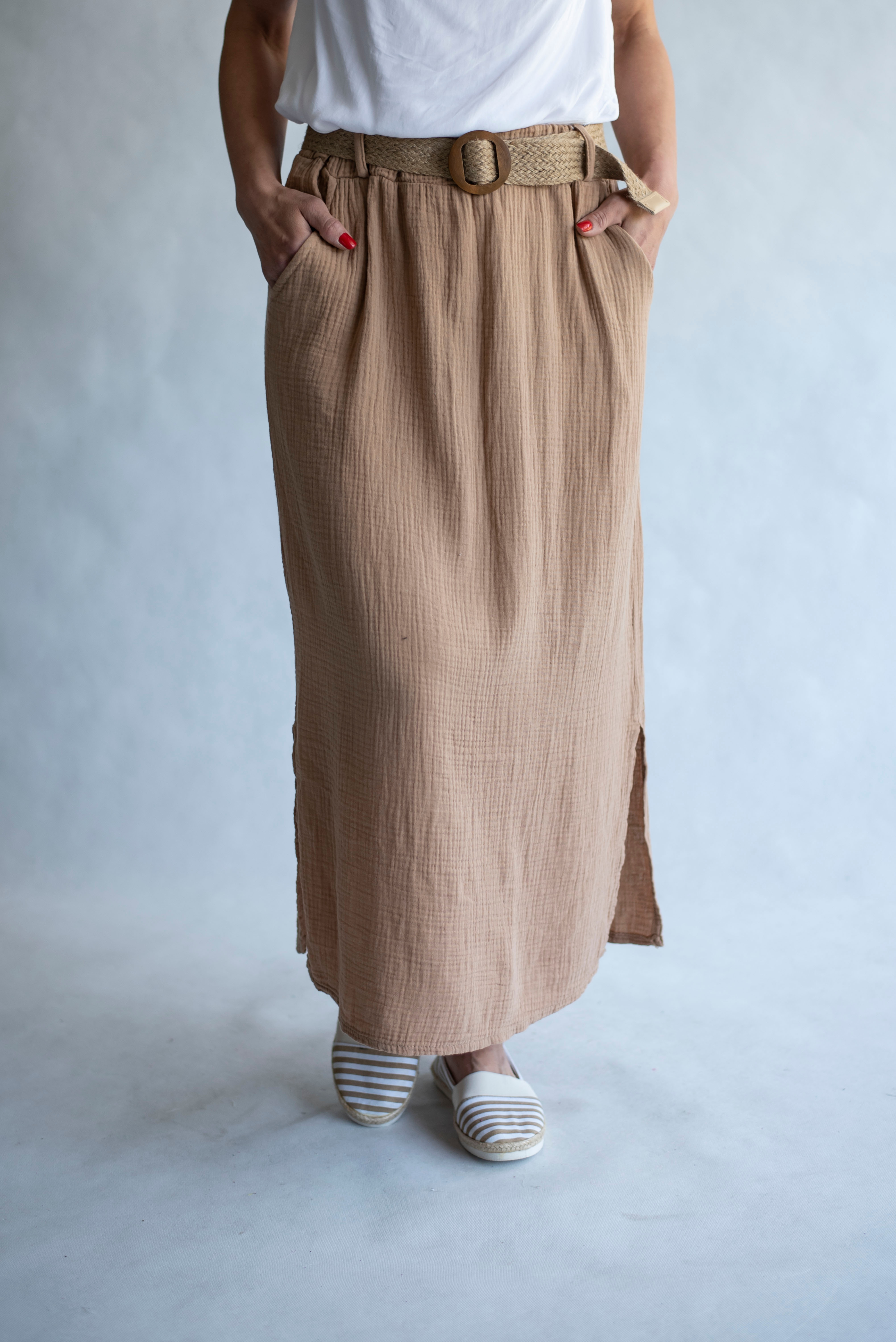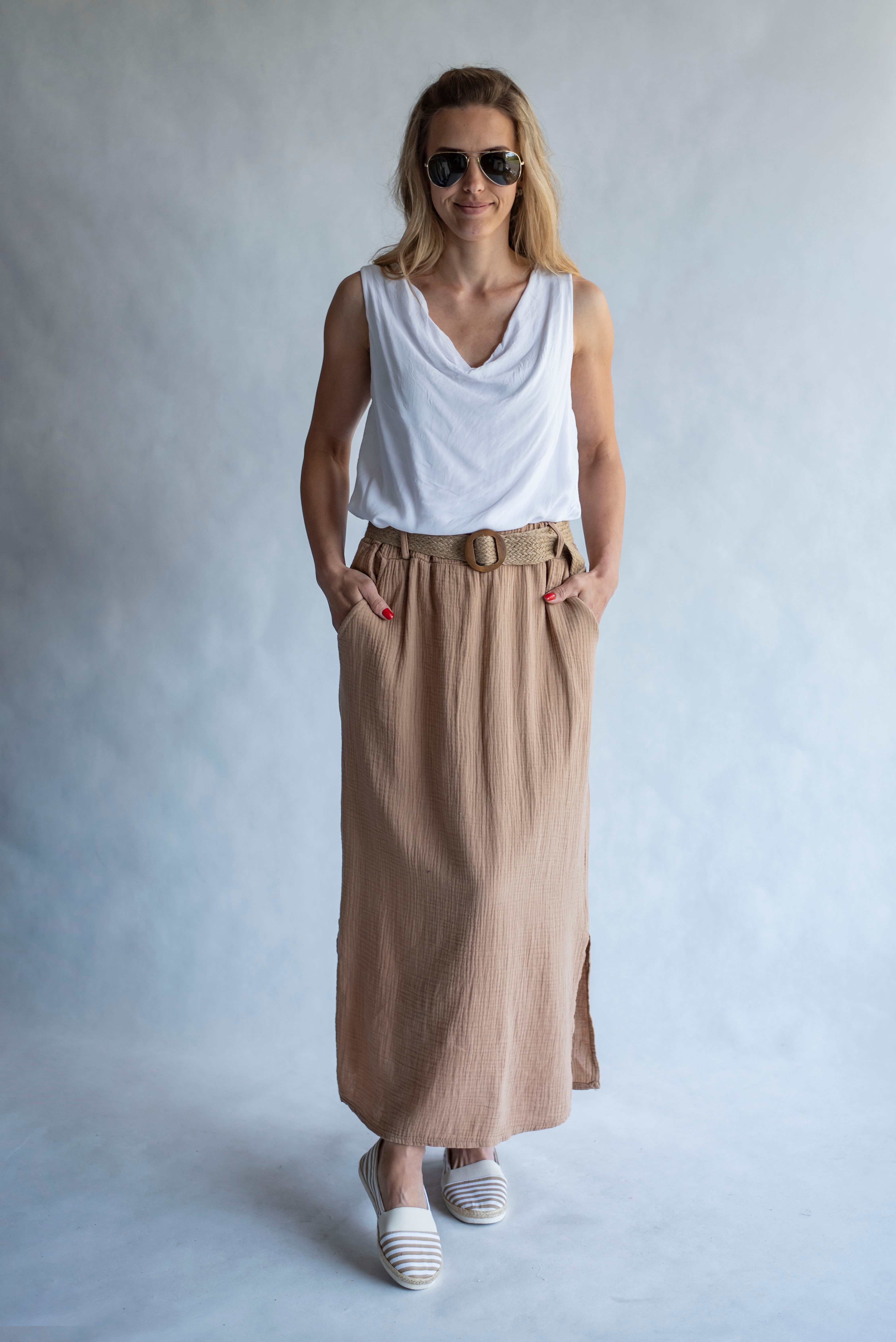 Dámská dlouhá sukně s rozparkem po stranách, předními kapsami a elastickým pasem.