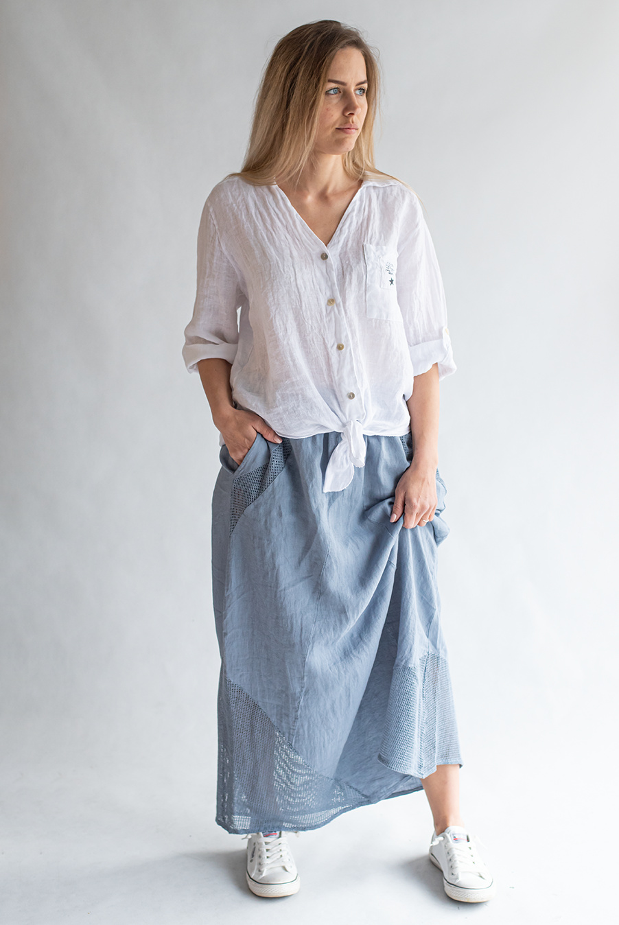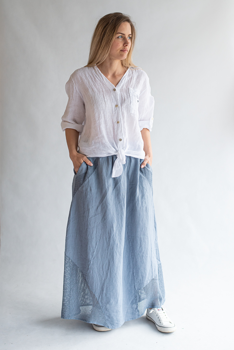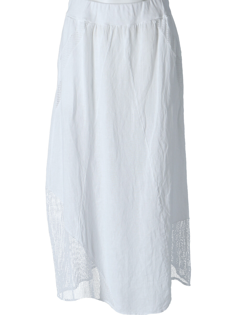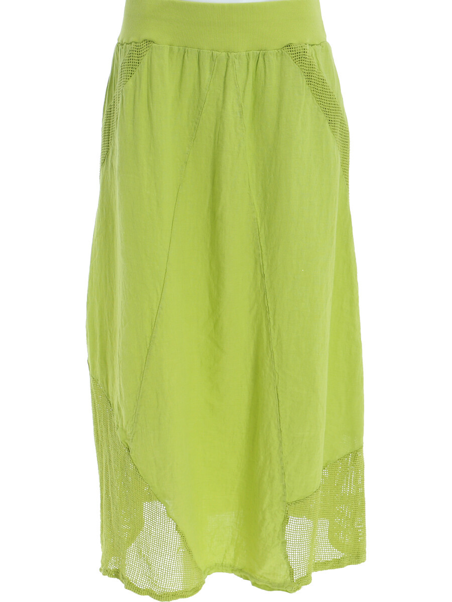 Stylové dámská dlouhá lněná sukně s elastickým pasem a spodním lemem, doplněná kapsami pro denní nošení , vyrobena v Itálii .
