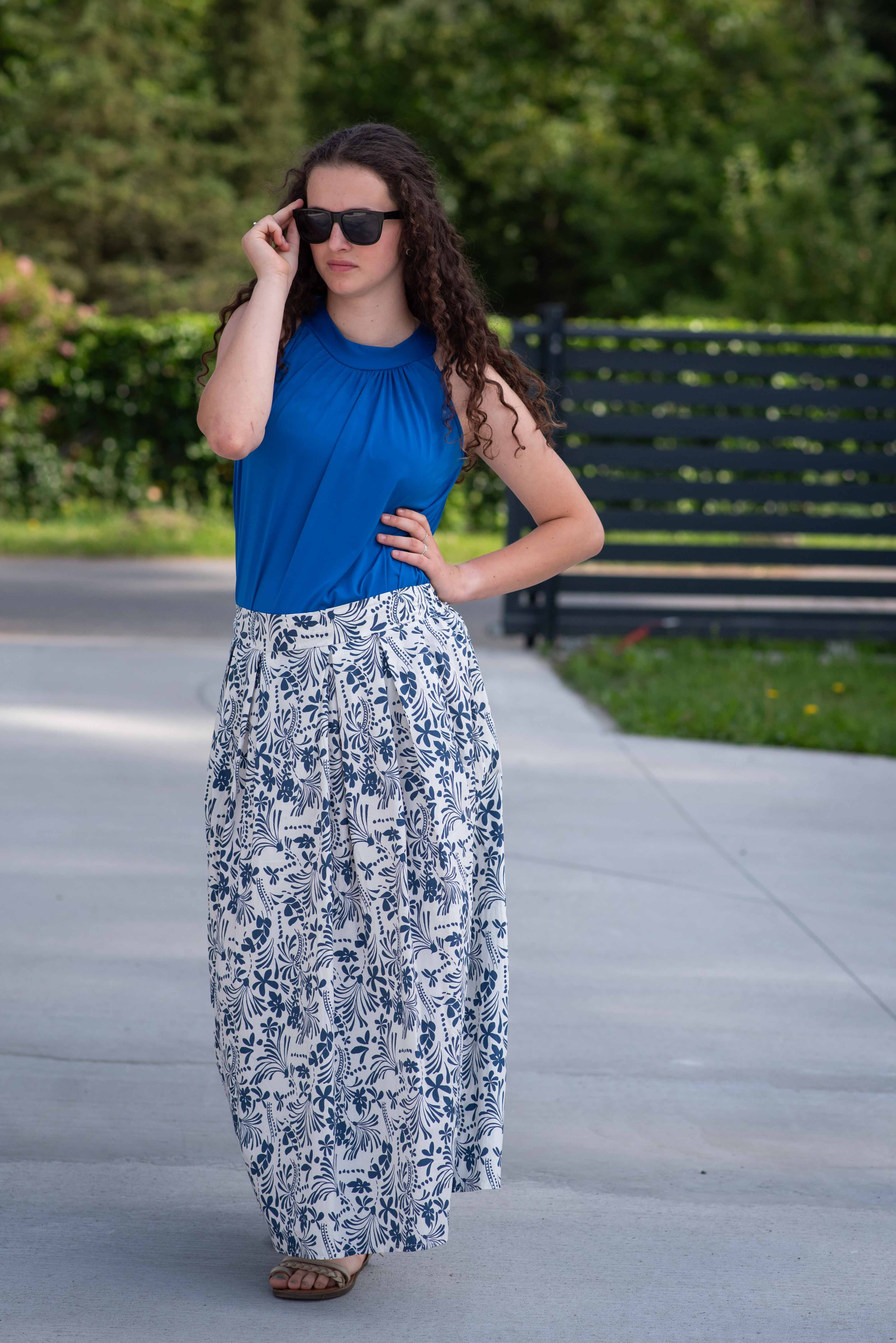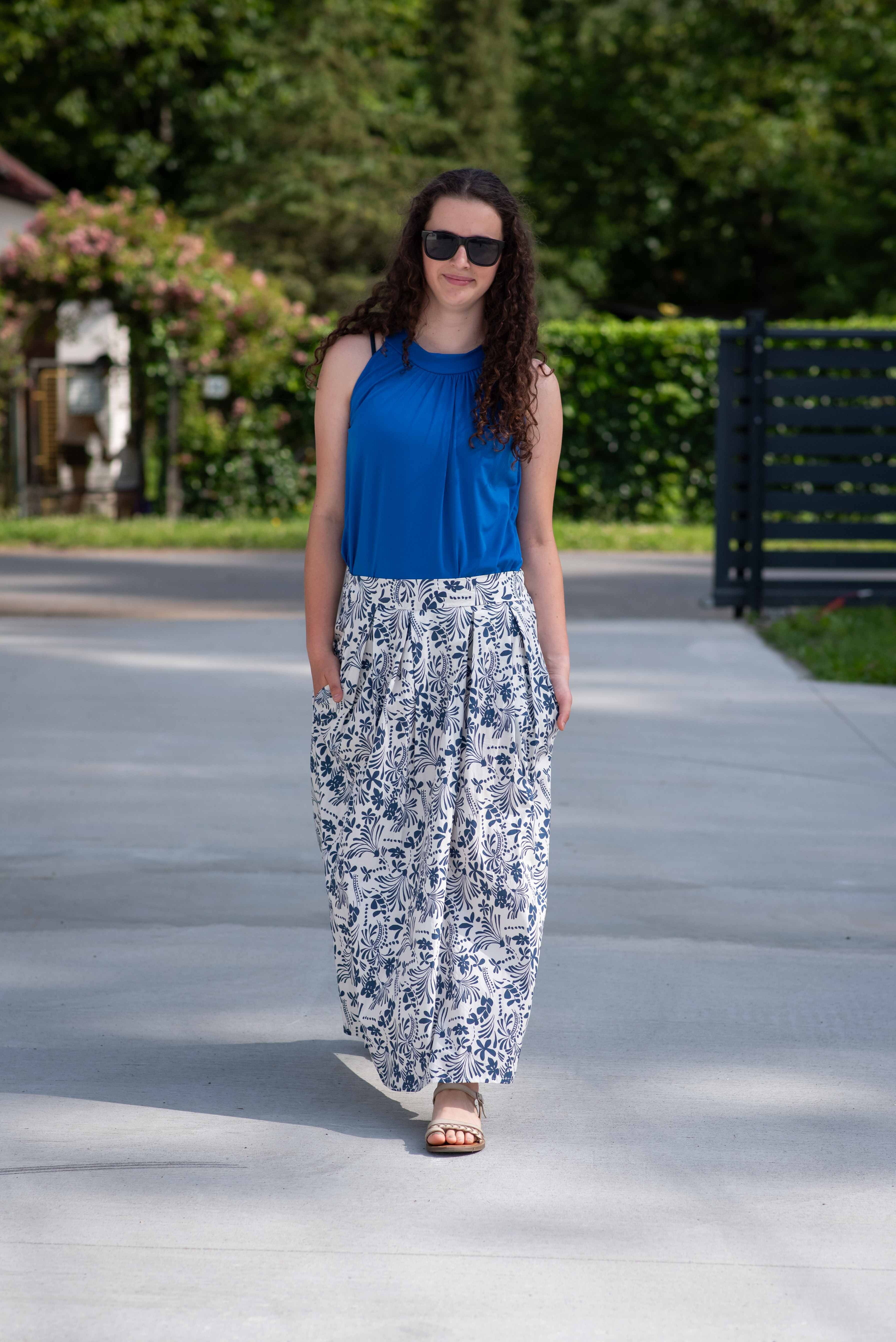 Dlouhá sukně áčkového střihu, zadní část pasu na gumu. Sukně má všité kapsy po stranách