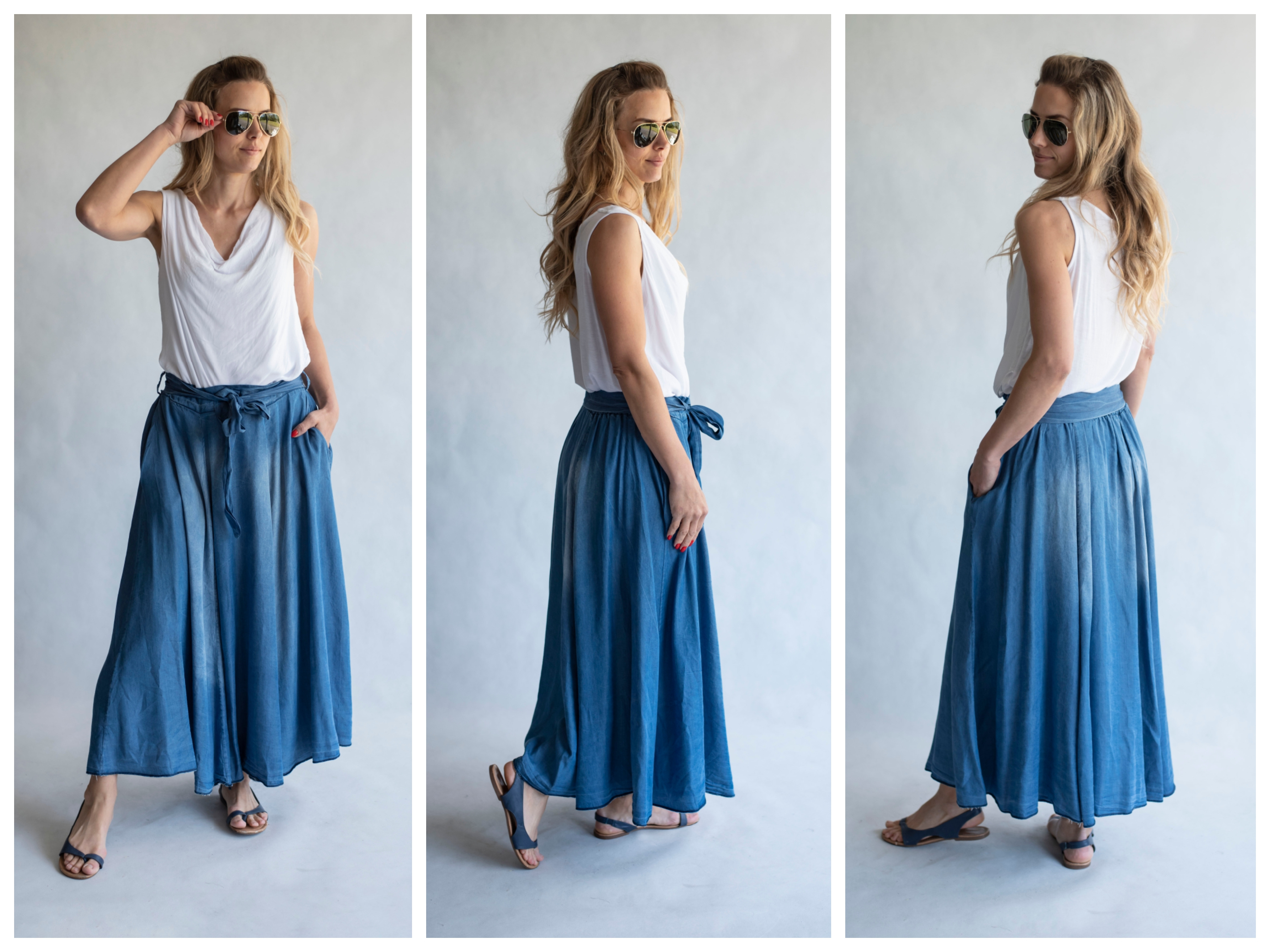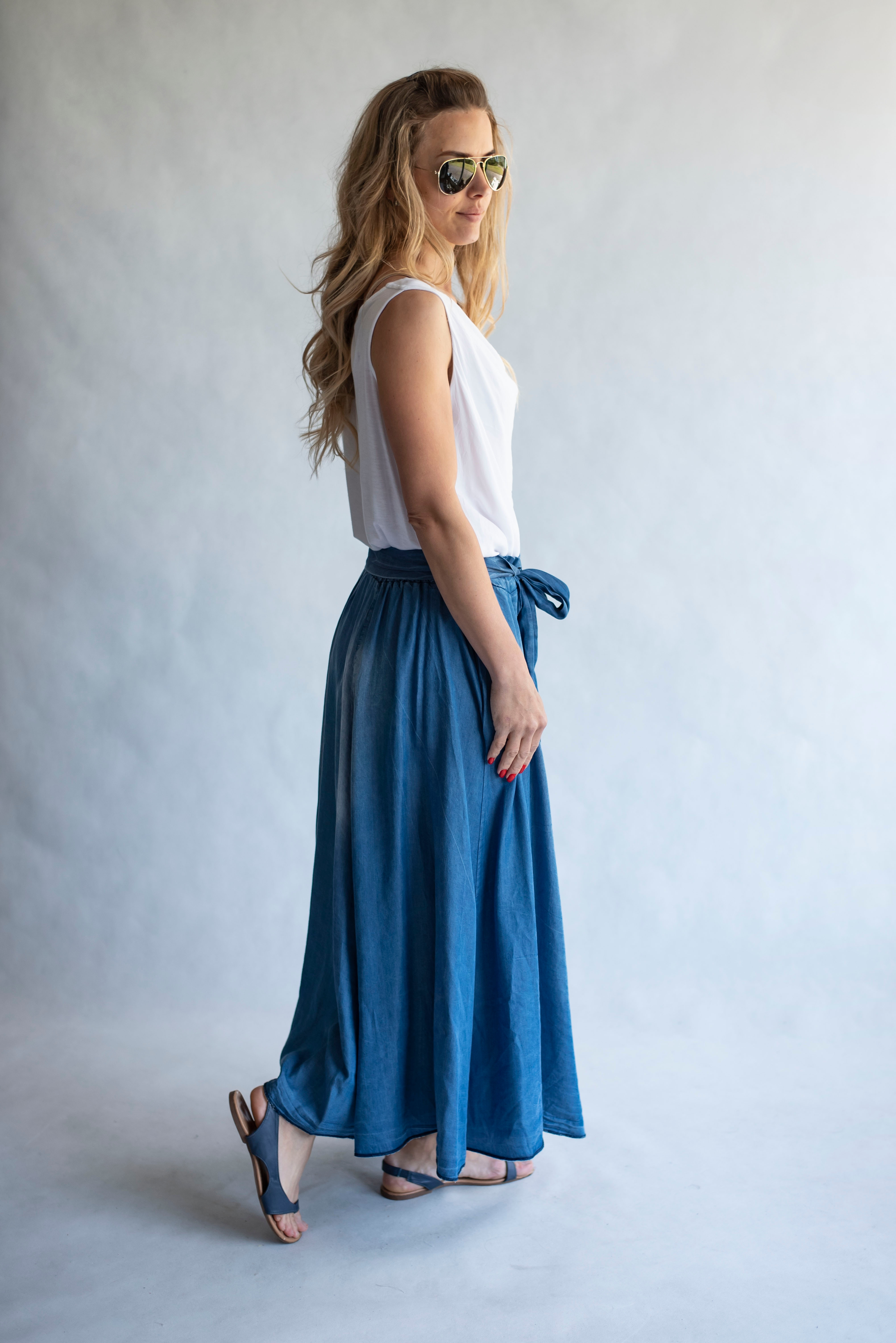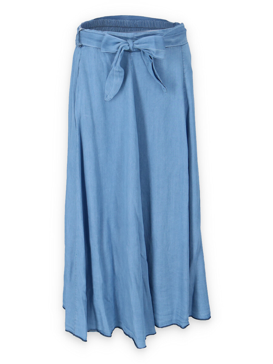 Elegantní delší džínová sukně s elastickým pasem , vázáním v pase a střihem do "A"
