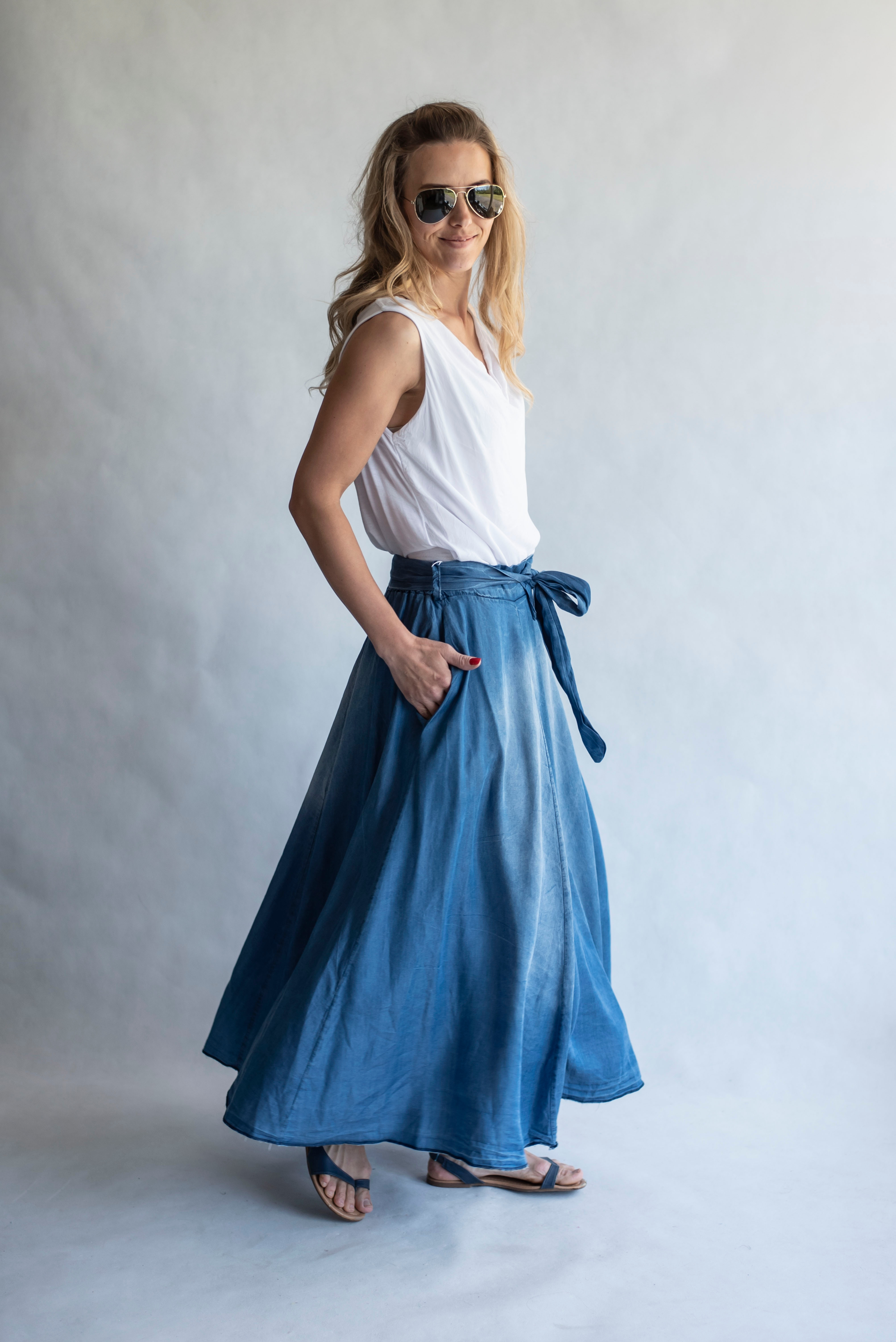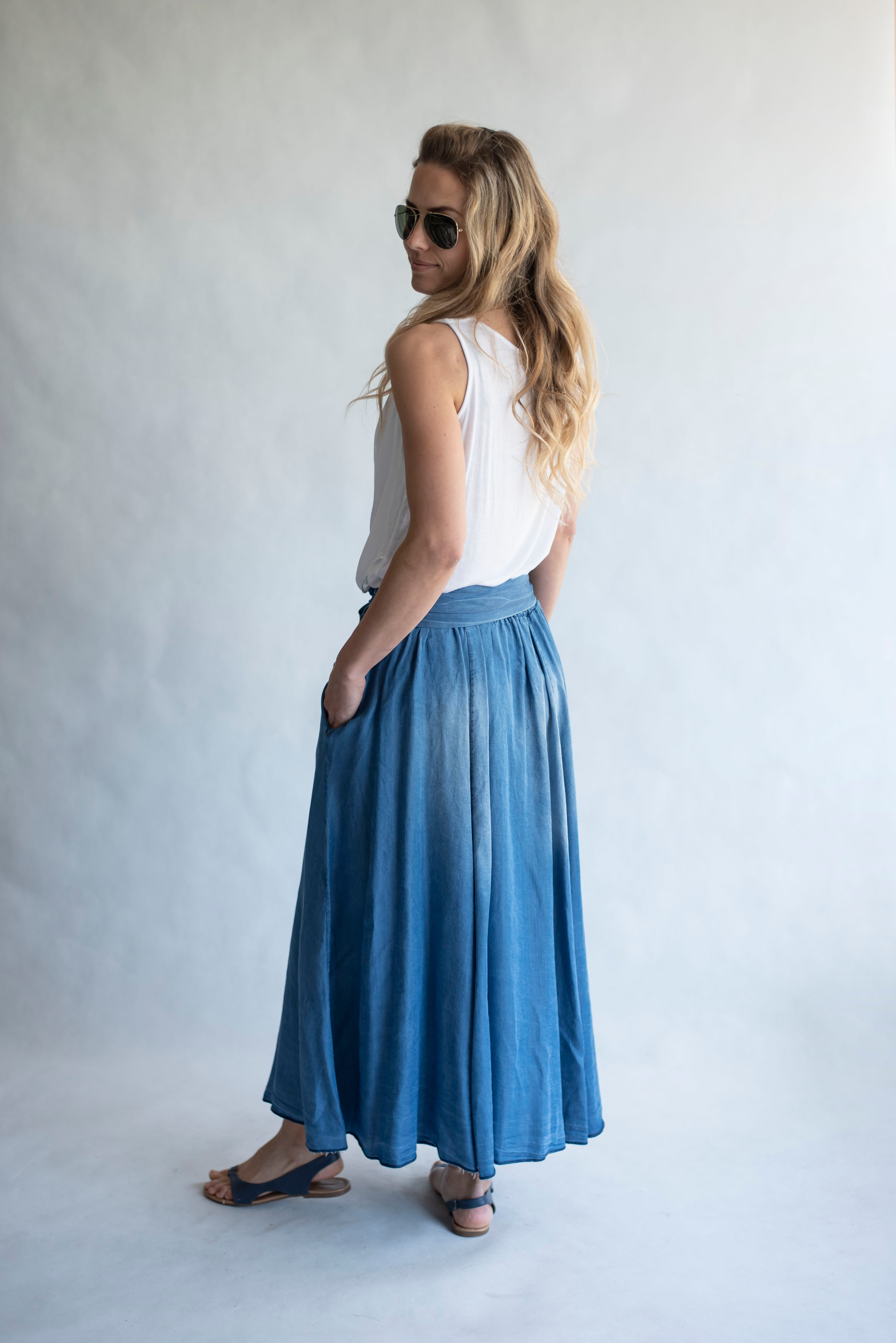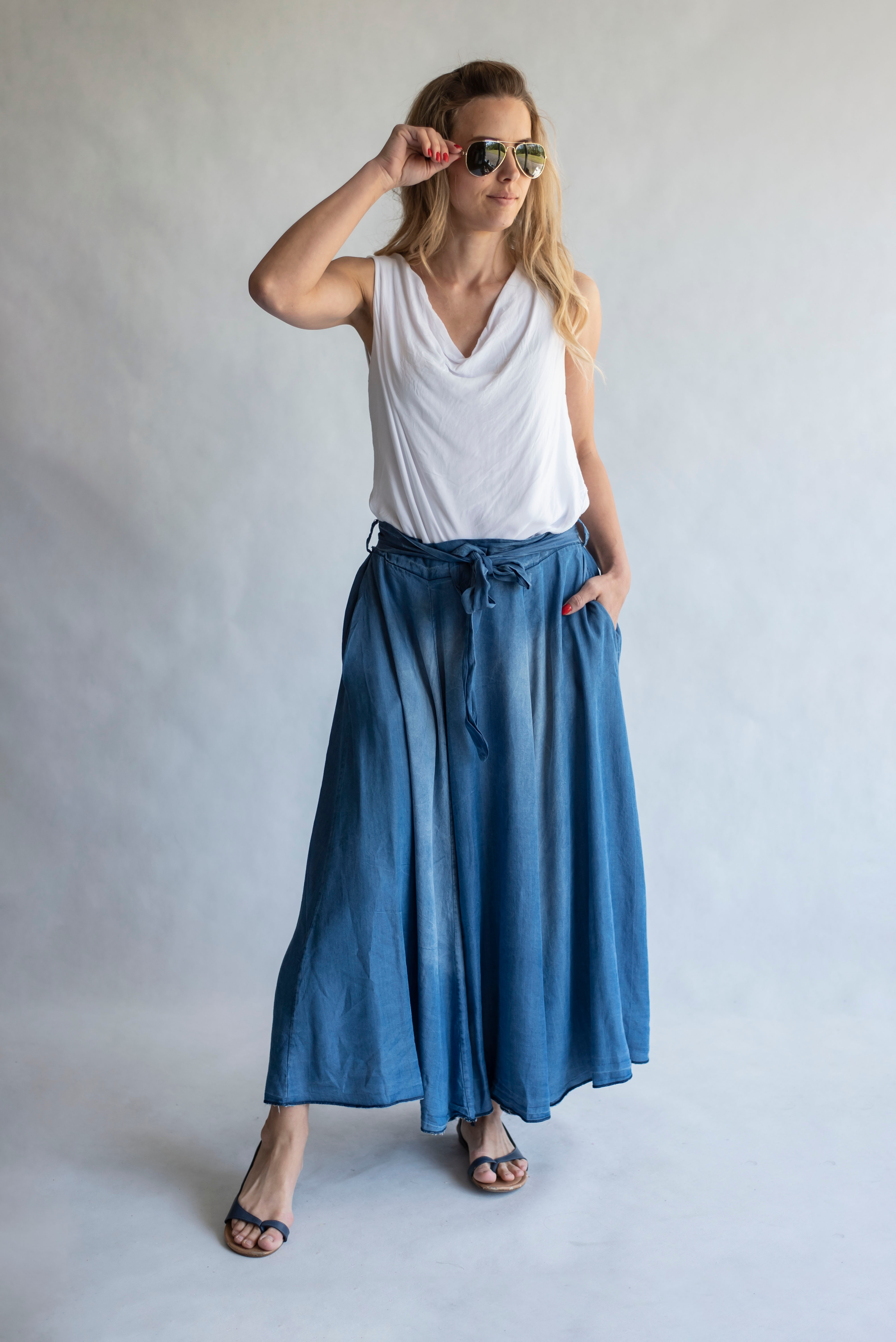 Elegantní delší džínová sukně s elastickým pasem , vázáním v pase a střihem do "A"