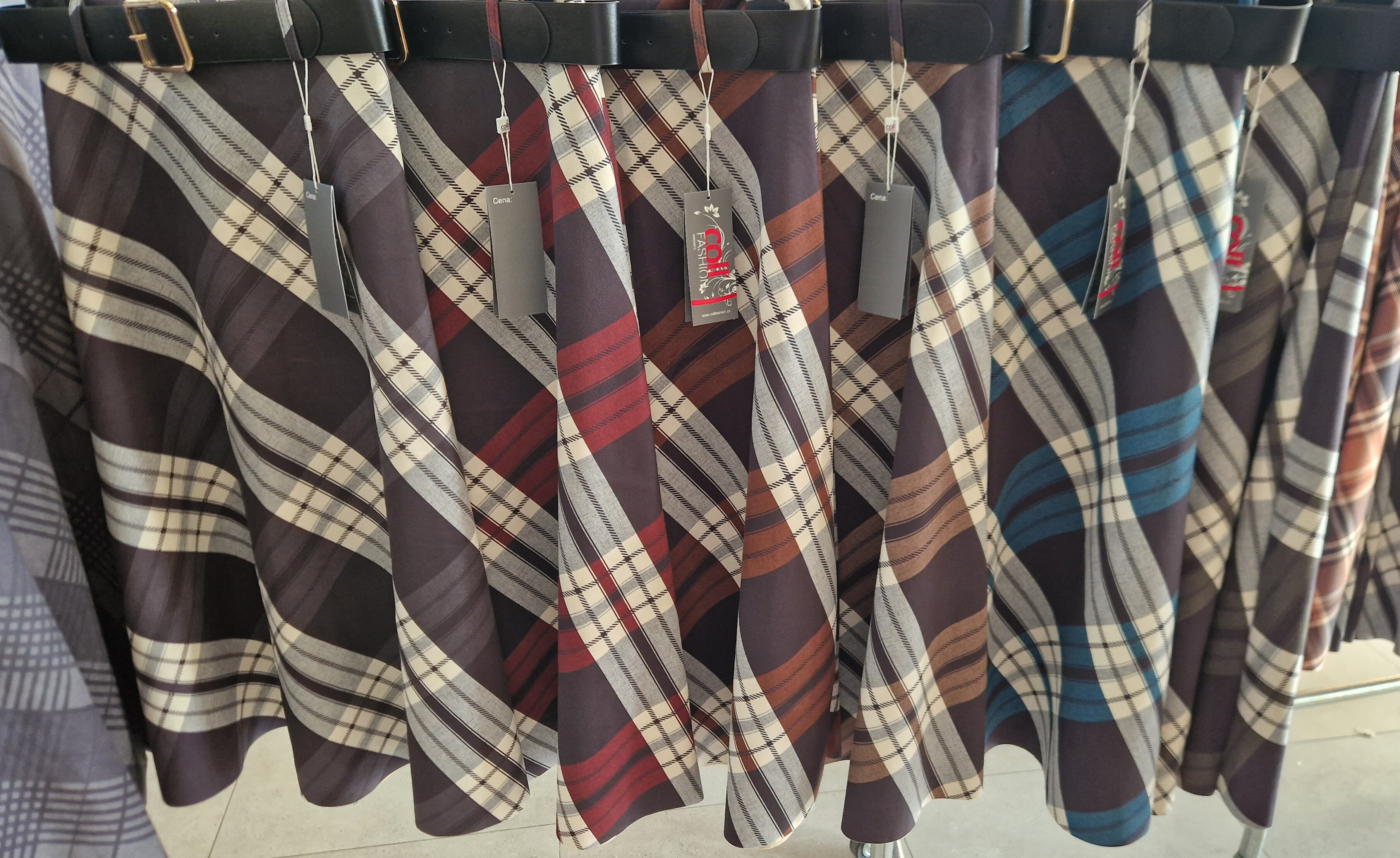 Dámská káro sukně v MIDI délce a v pase do gumy. Sukně je teplejšího materiálu, áčkového střihu a je doplněna syntetickým páskem. Dovezeno z Itálie.