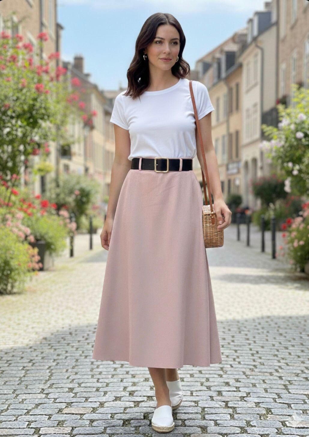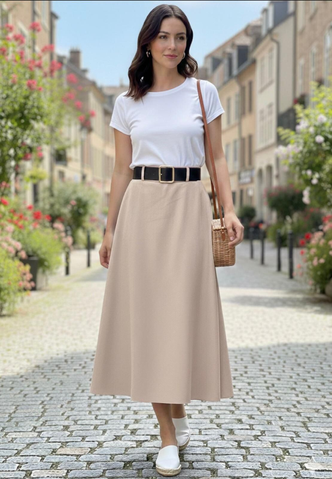 Dámská sukně v MIDI délce a v pase do gumy. Sukně je áčkového střihu a je doplněna syntetickým páskem. D