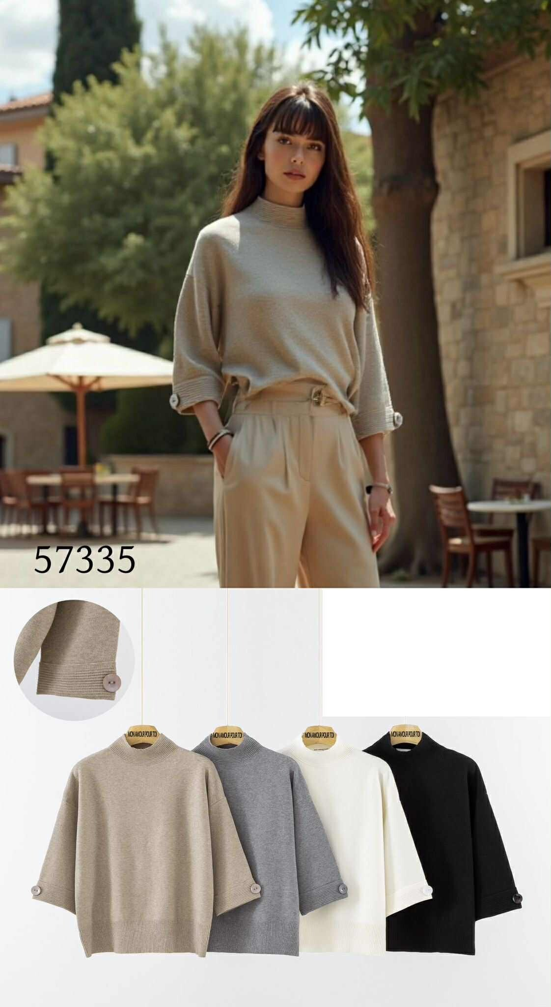 Elegantní svetřík volnějšího oversized střihu s 3/4 rukávem. Svetr má stojáček a na rukávech aplikaci knoflíku.