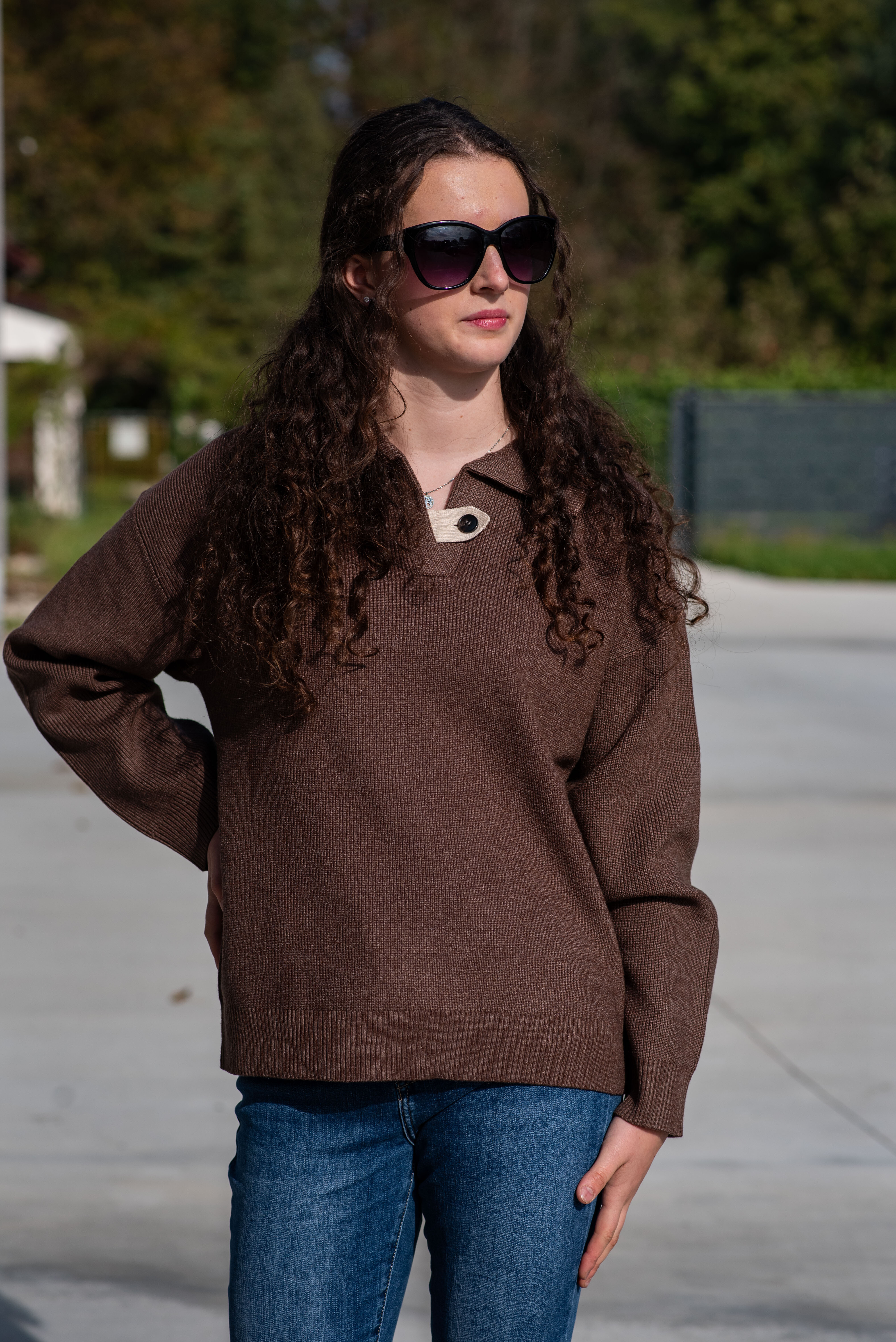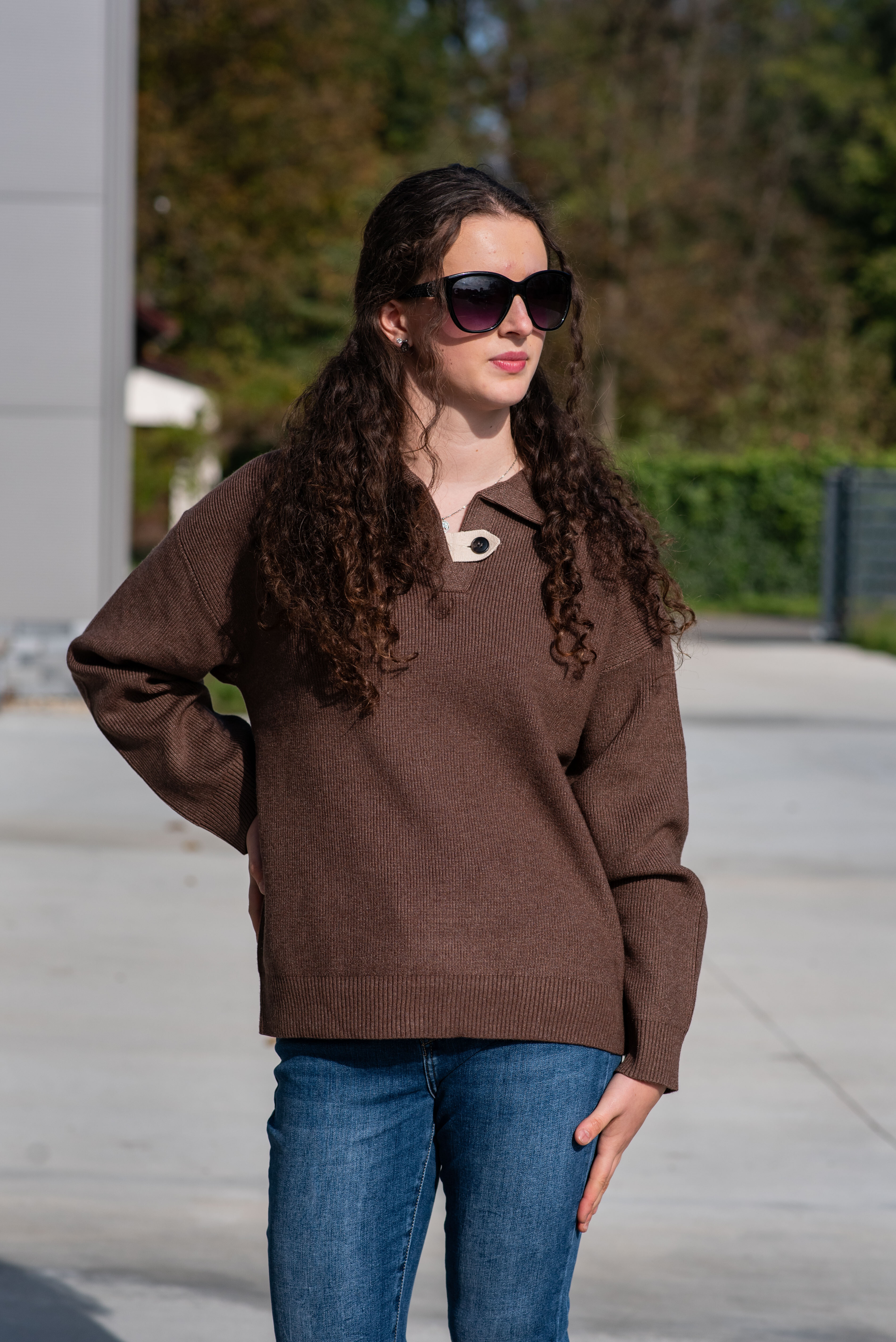 Svetr má dlouhý rukáv a výstřih do V, který je doplněn o stylové zapínání na knoflík.