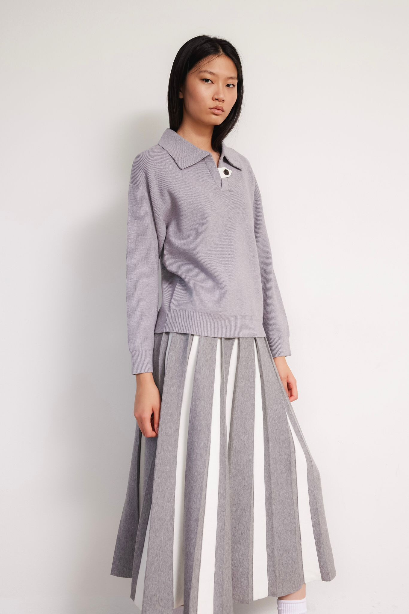 Módní svetřík s límečkem z hrubšího žebrovaného úpletu.