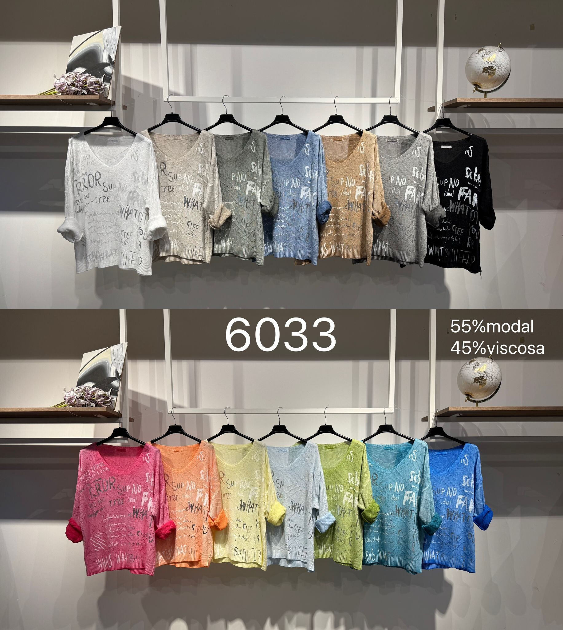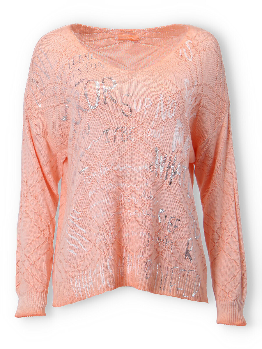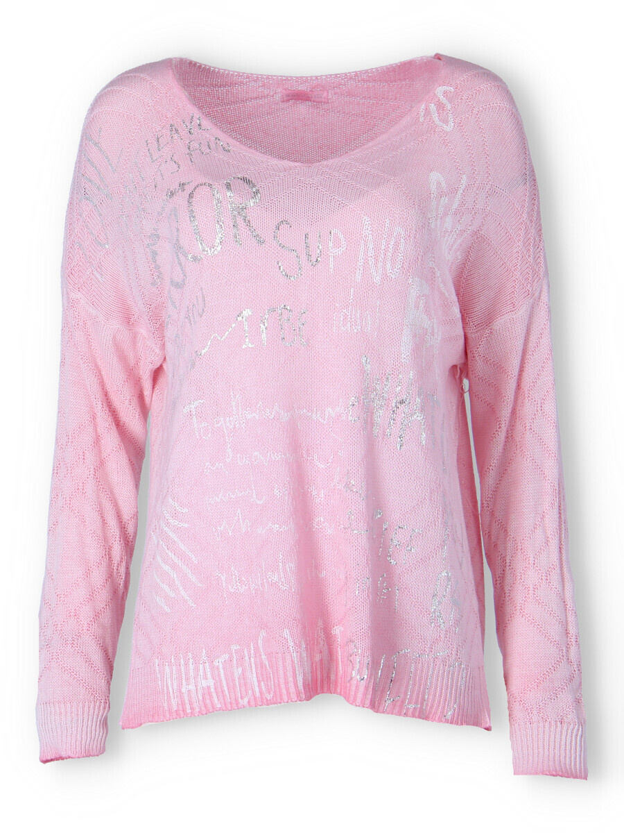 Trendy úpletový svetřík s potiskem. Svetřík je volnějšího střihu, s dlouhým rukávem a výstřihem do V.