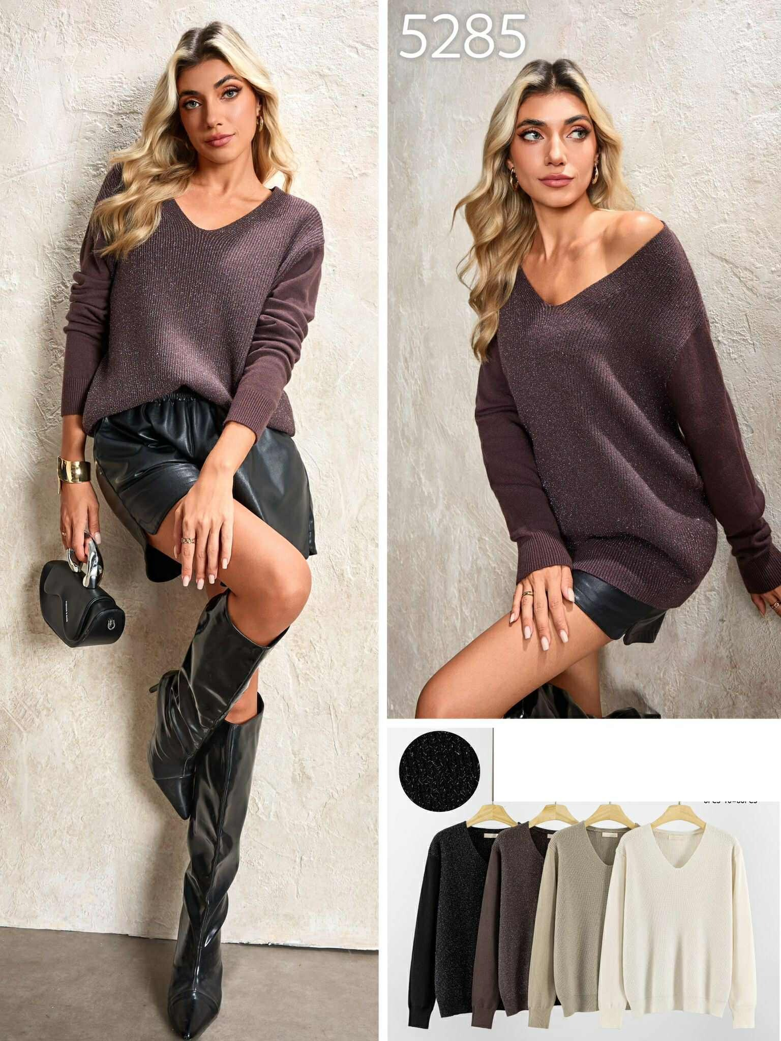 Stylový svetřík s lurexem. Svetřík je volnějšího střihu a má véčkový výstřih.