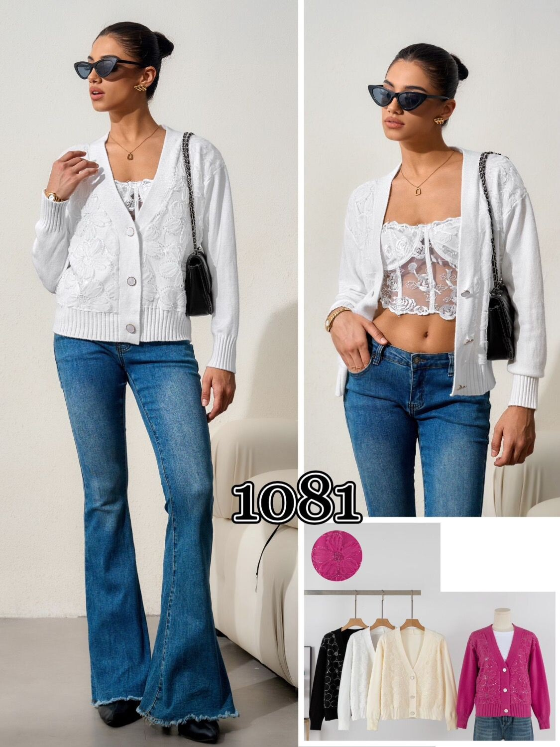 Propínací svetřík s výšivkou na přední straně, doplněno týlem, perleťové knoflíčky. Dovoz Itálie