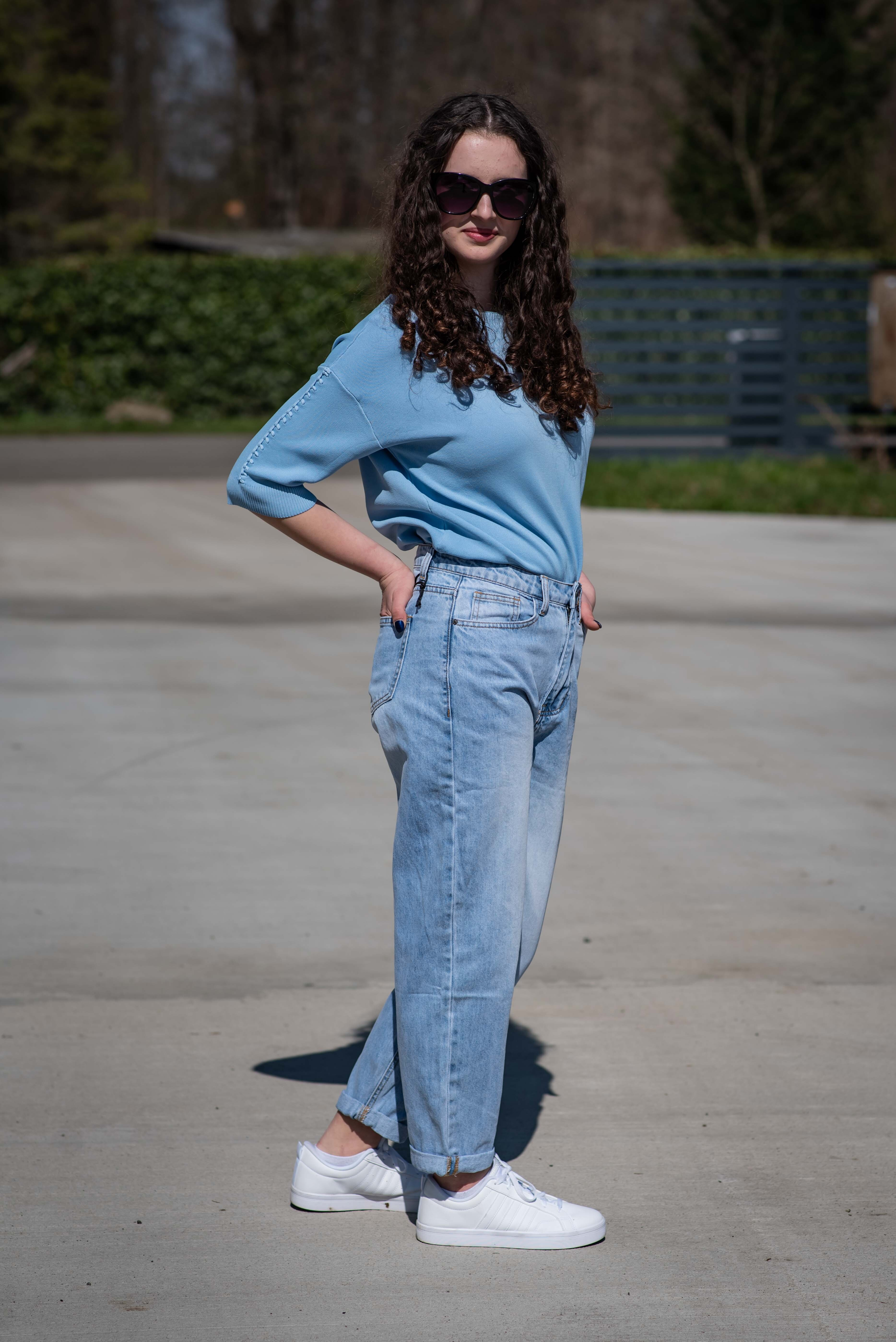 Svetřík s 3/4 rukávem. Svetřík má kulatý výstřih, je volnějšího střihu a na rukávech má módní aplikaci copánku.