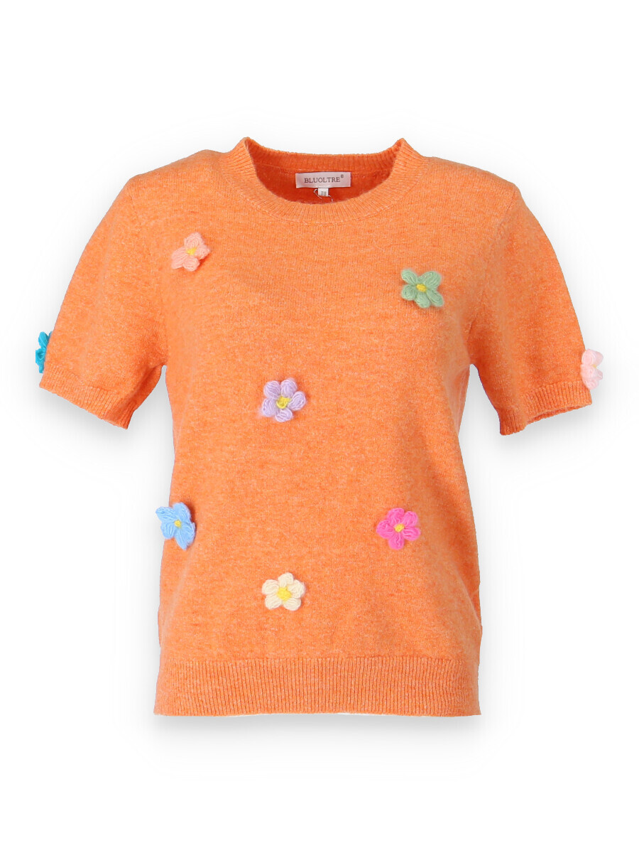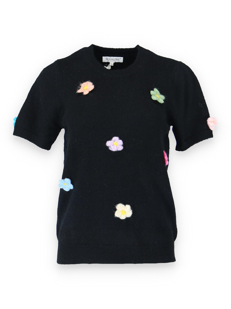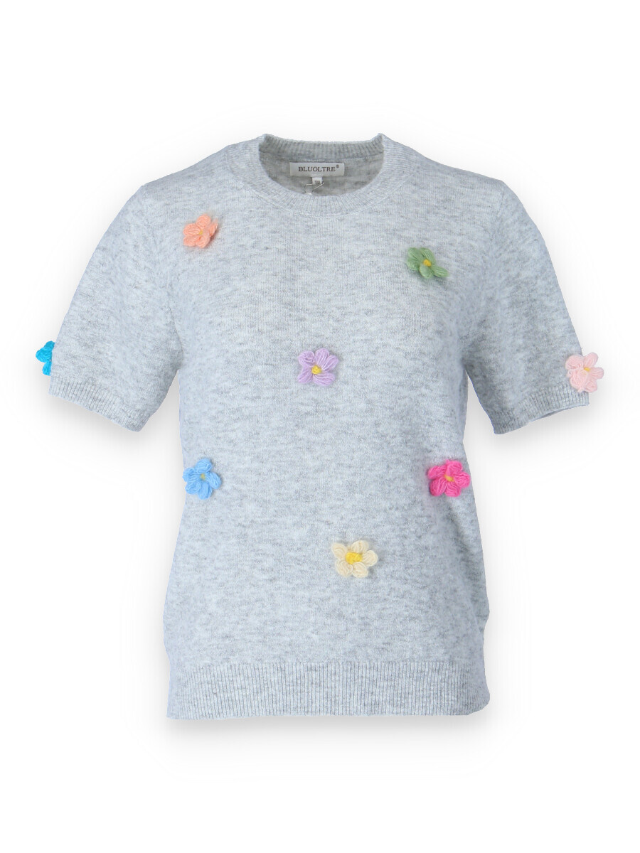 Svetřík s kr. rukávem, kulatý výstřih, doplněn aplikací květin. Dovoz Itálie.