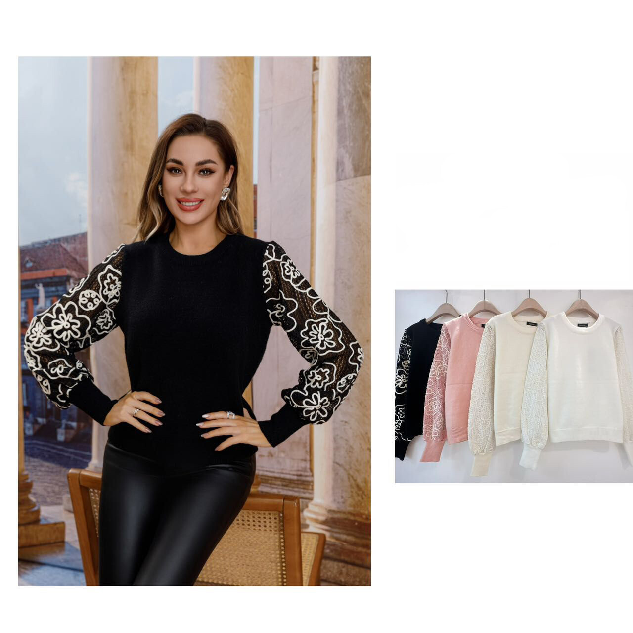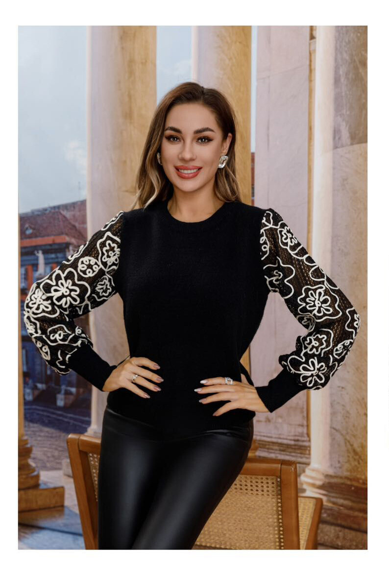 Elegantní svetřík s krajkovými rukávy s výšivkou a má kulatý výstřih.
