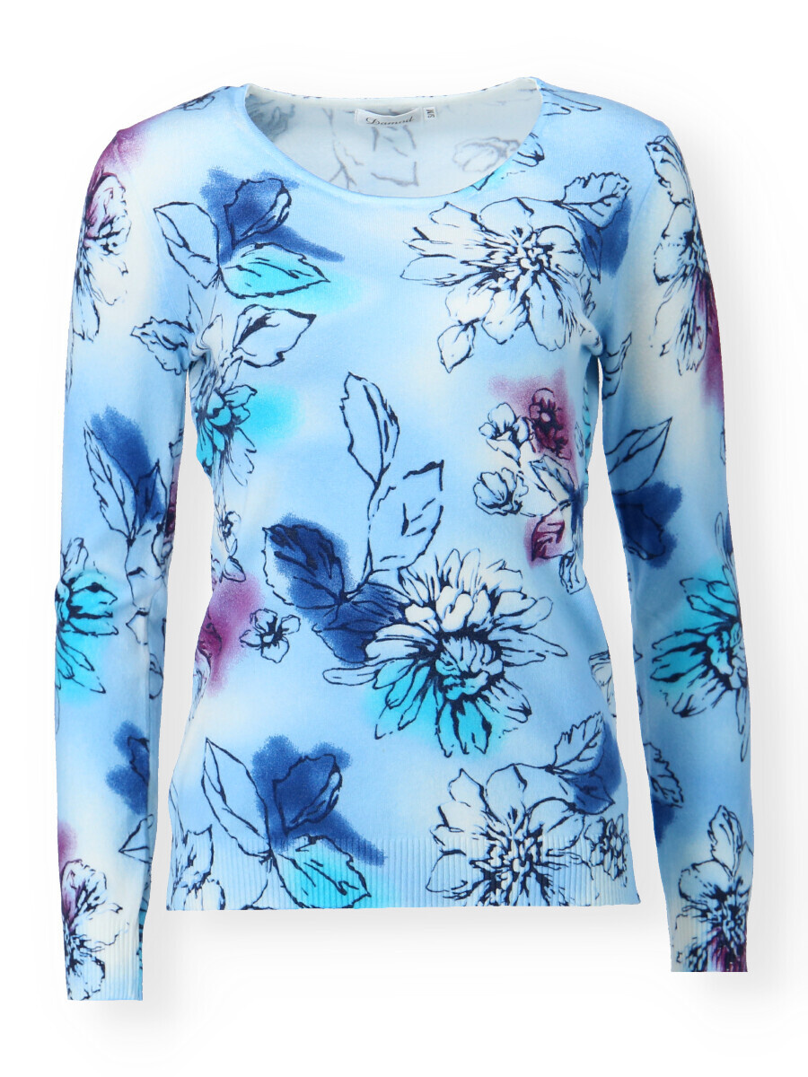 Módní úpletový svetřík s potiskem a kulatým výstřihem.
