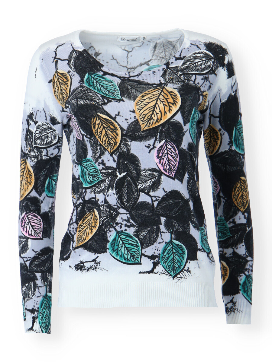 Módní úpletový svetřík s potiskem a kulatým výstřihem.