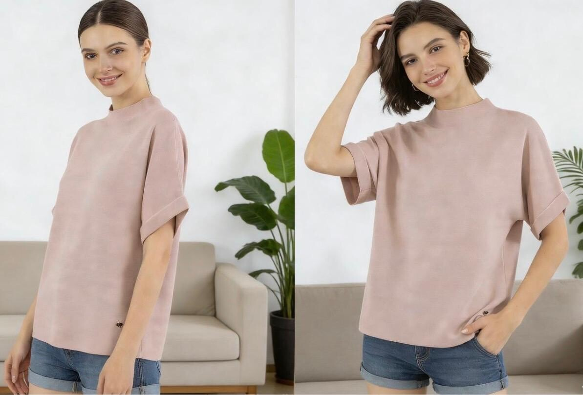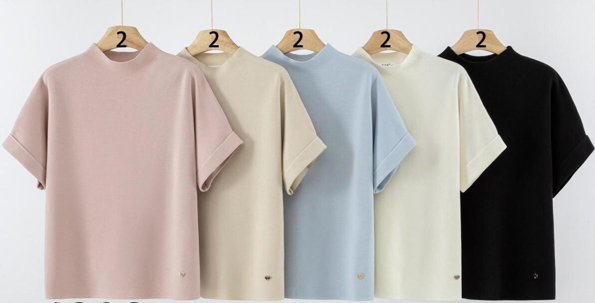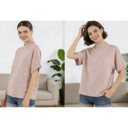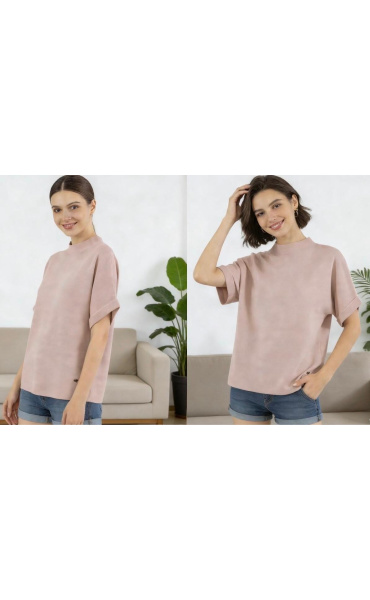 Dámský svetřík se stojáčkem a krátkým rukávem.