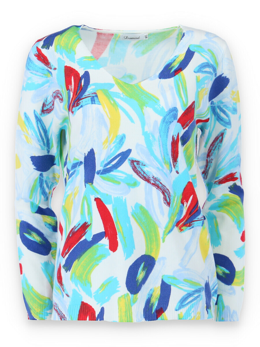 Módní úpletový svetřík s potiskem, véčkový výstřih.