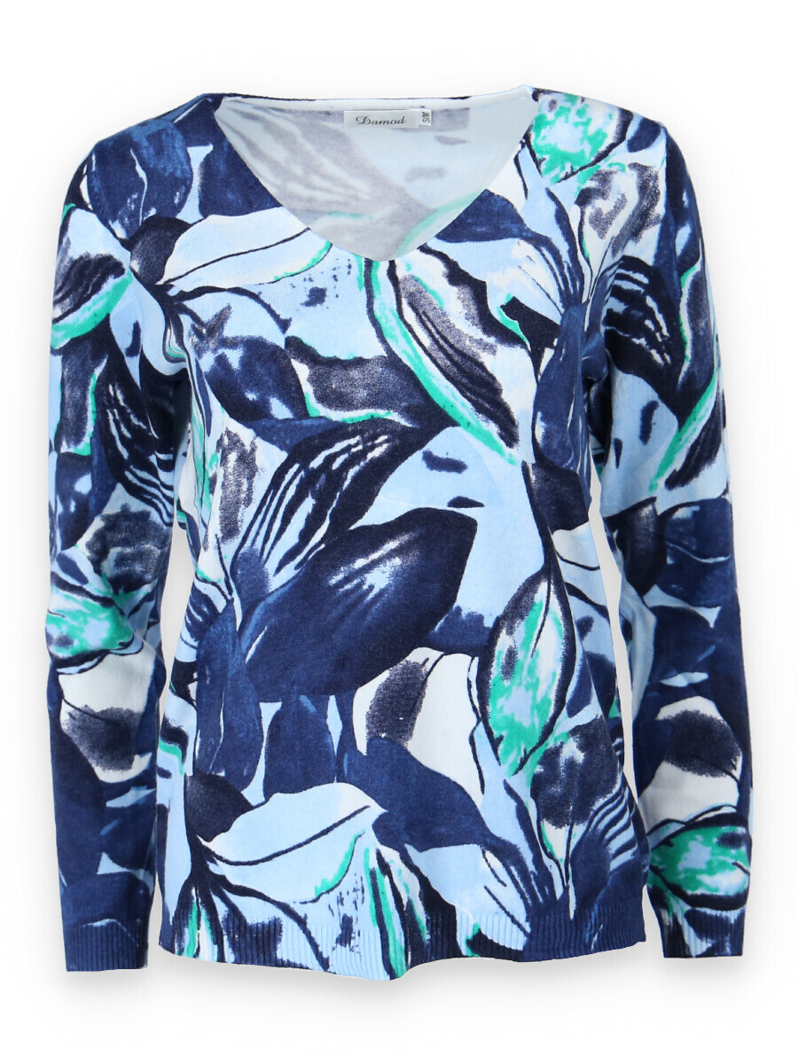 Módní úpletový svetřík s potiskem, véčkový výstřih.