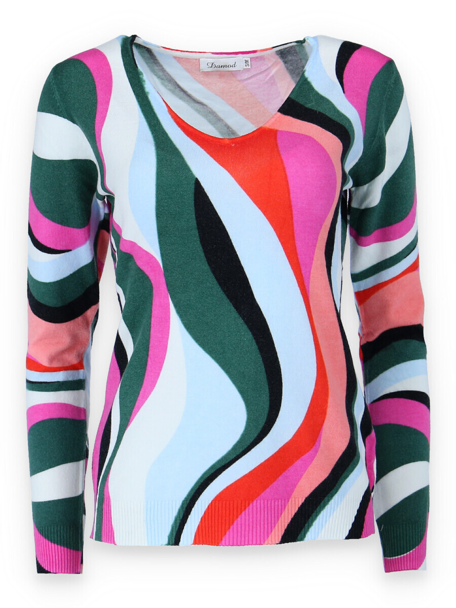 Módní úpletový svetřík s potiskem, véčkový výstřih.
