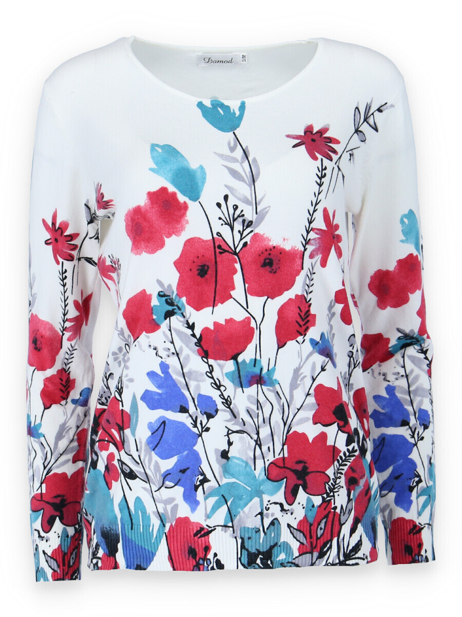 Módní úpletový svetřík s potiskem, kulatý výstřih.