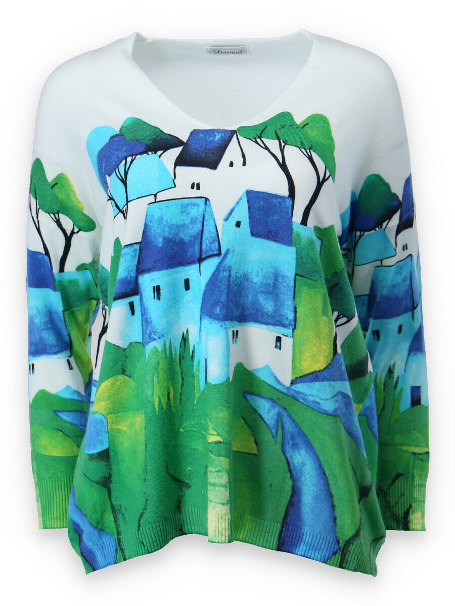 Módní úpletový svetřík s potiskem, véčkový výstřih.