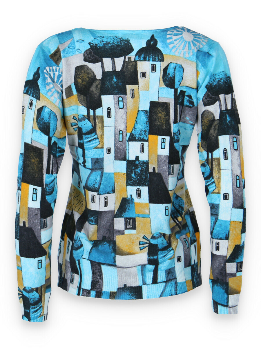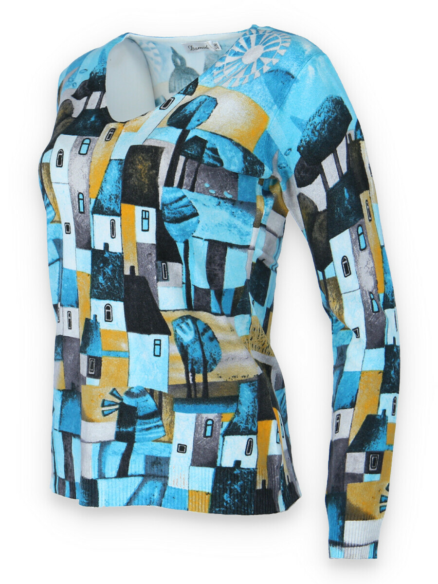 Módní úpletový svetřík s potiskem, véčkový výstřih.