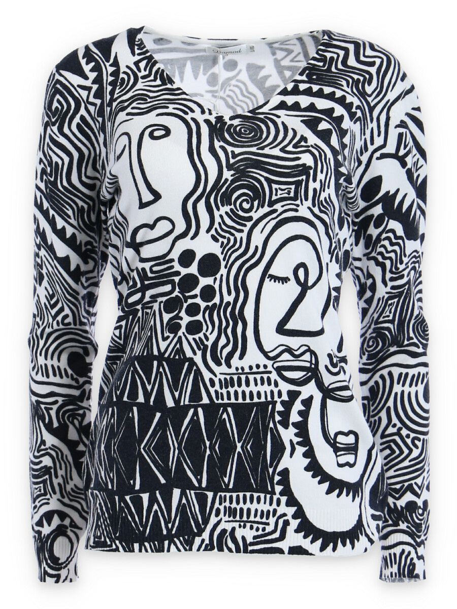 Módní úpletový svetřík s potiskem, véčkový výstřih.